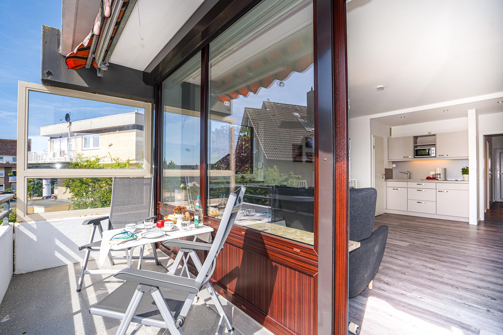 Auf dem Balkon lassen Sie den Tag ausklingen und lauschen dem Rauschen des Meeres. Eine Markise sorgt bei Bedarf für ausreichenden Sonnenschutz.