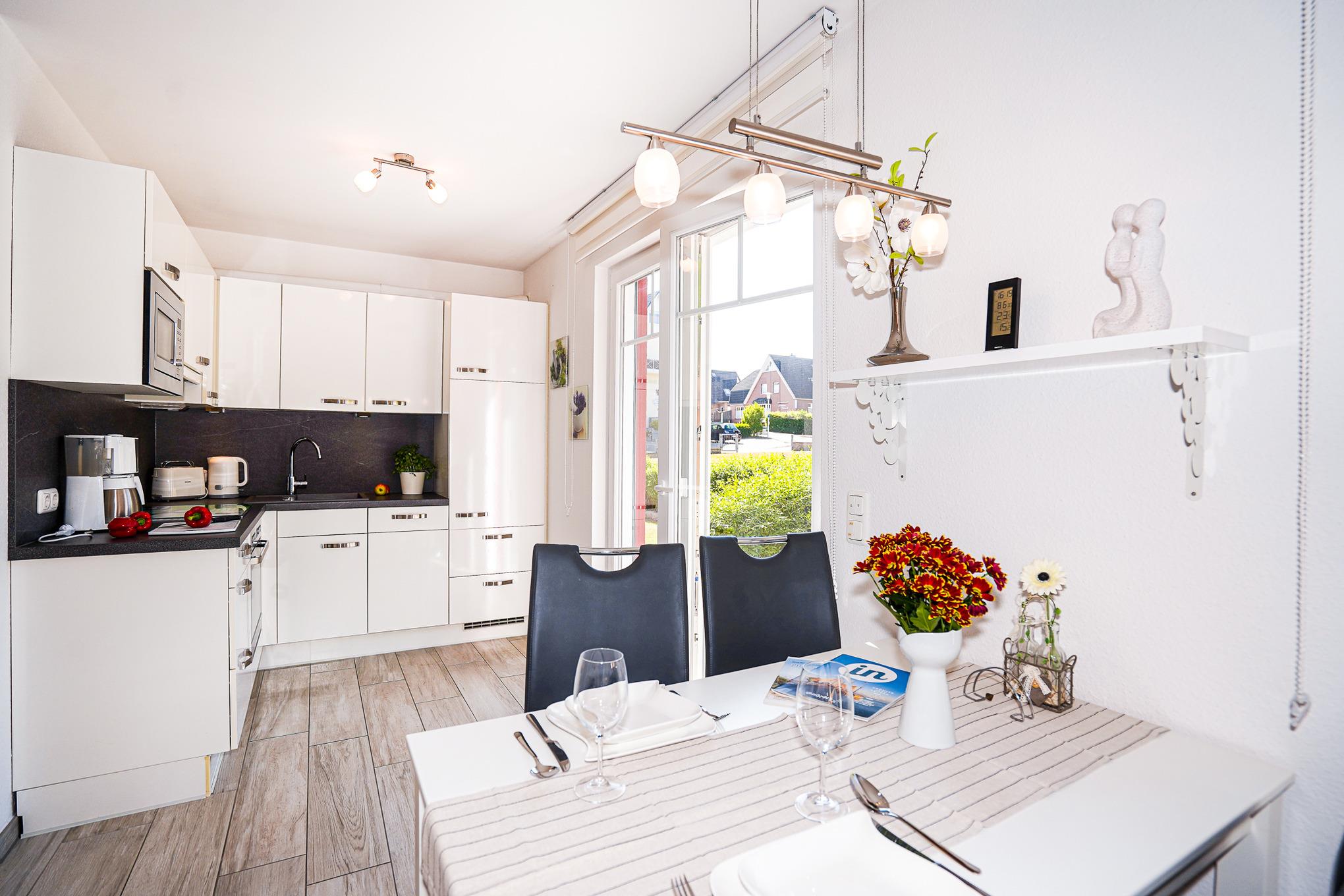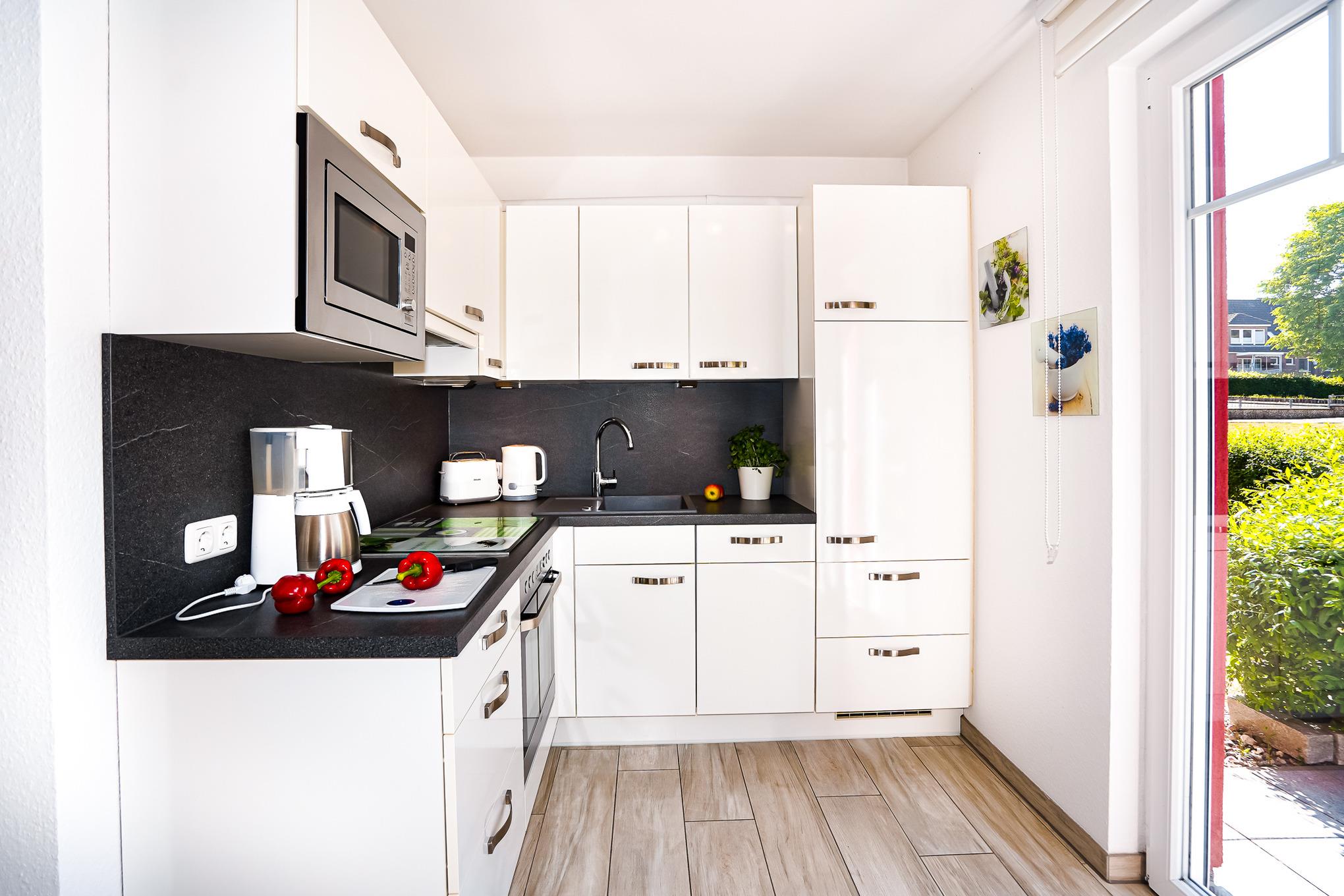 Im lichtdurchfluteten Wohnzimmer mit Sofa und Esstisch stehen Ihnen ein Fernseher und eine Stereoanlage zum Ausklingen des Tages zur Verfügung. Die stilvolle und offene Küche ist mit allen erforderlichen Geräten wie bsp. Backofen, Cerankochfeld, Spülmaschine und Kühlschrank mit Gefrierfach ausgestattet. Angrenzend an den Wohnbereich befindet sich die Terrasse, welche zum gemütlichen Beisammensein einlädt.