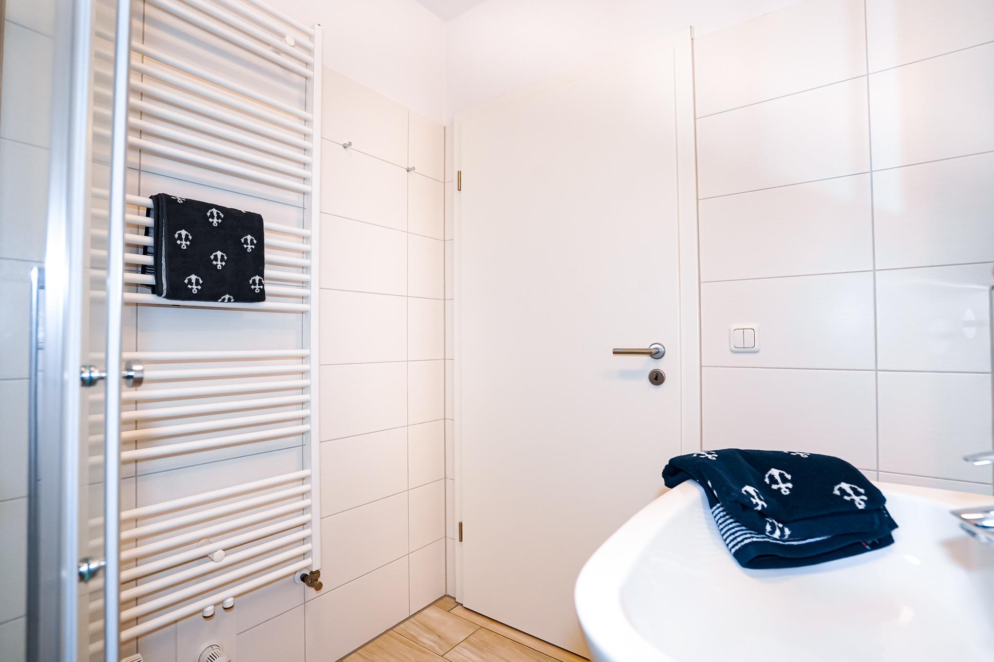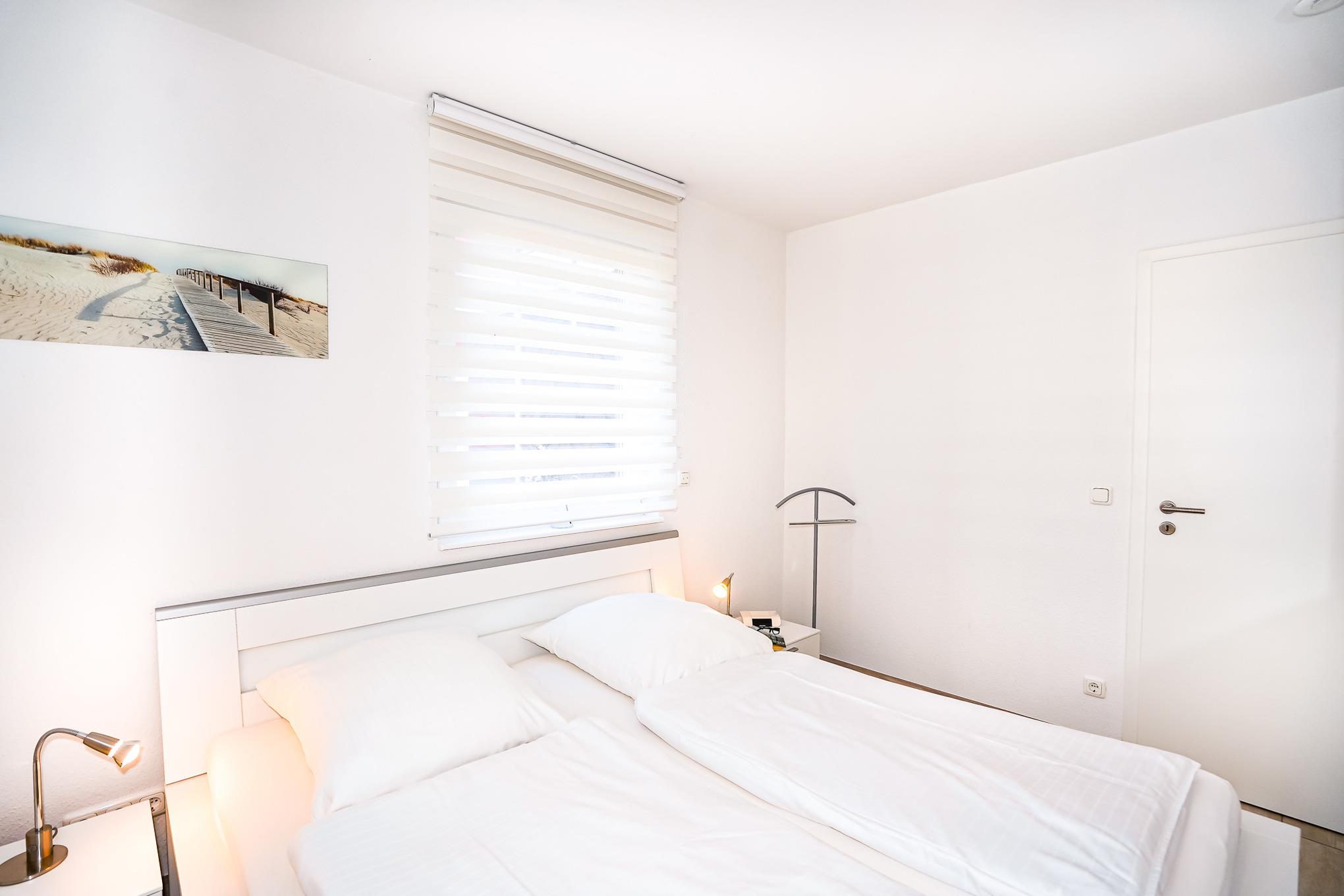 Das Schlafzimmer verfügt über ein Doppelbett (180 x 200 cm) und einen großen Kleiderschrank. Im modernen Badezimmer mit bodengleicher Dusche finden Sie ein WC, Waschbecken und einen Handtuchheizkörper vor. Alle Fenster in dieser Wohnung lassen sich durch elektrische Jalousien verdunkeln.