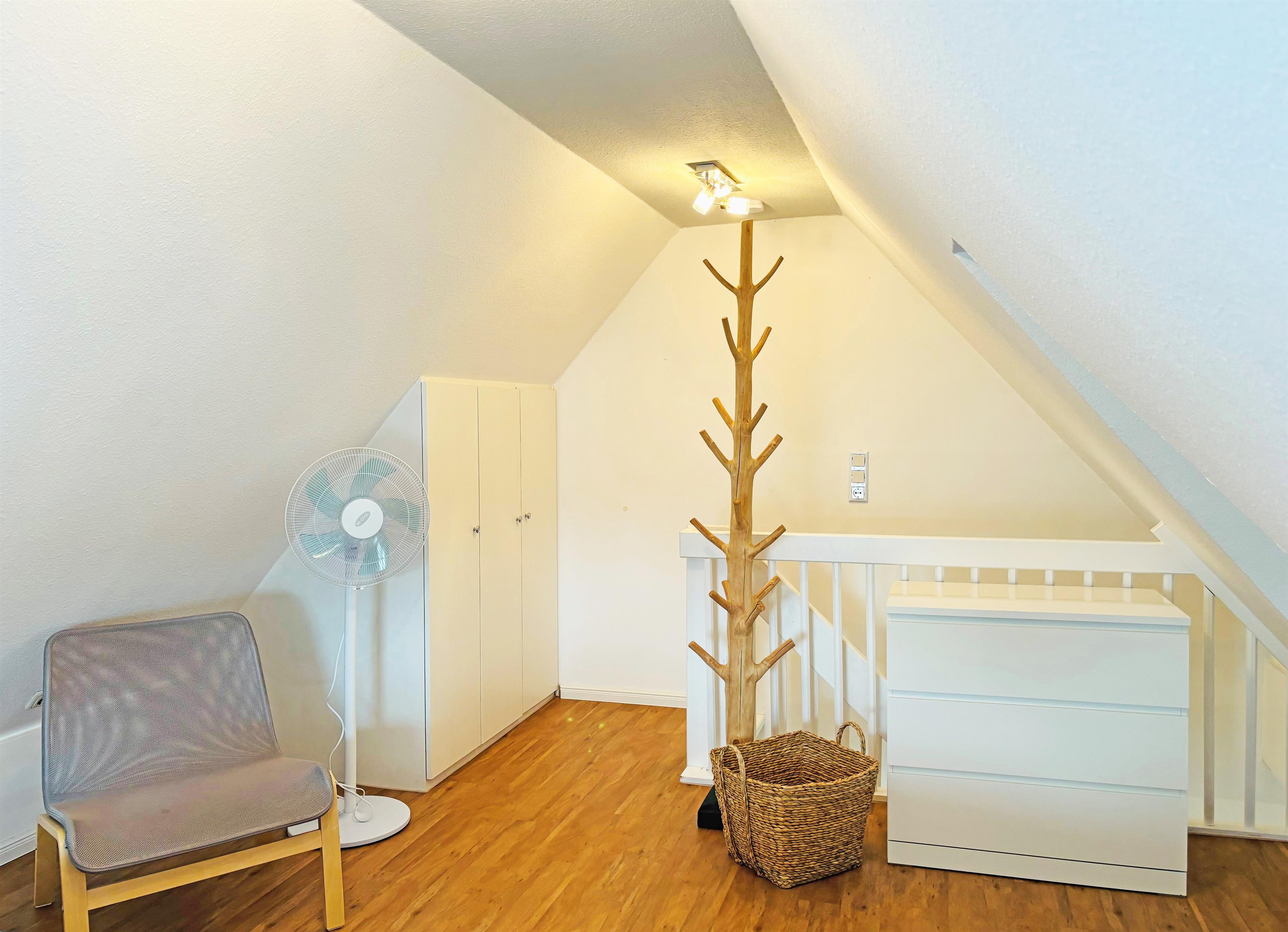 Offenes, großzügiges, helles Schlafzimmer mit einem Doppelbett (2x 90x200 cm), 2 Nachttischen und einem kleinen Einbaukleiderschrank. Das Schlafzimmer ist mit Laminatboden ausgelegt, das Velux-Fenster lässt sich durch ein Rollo verdunkeln.
