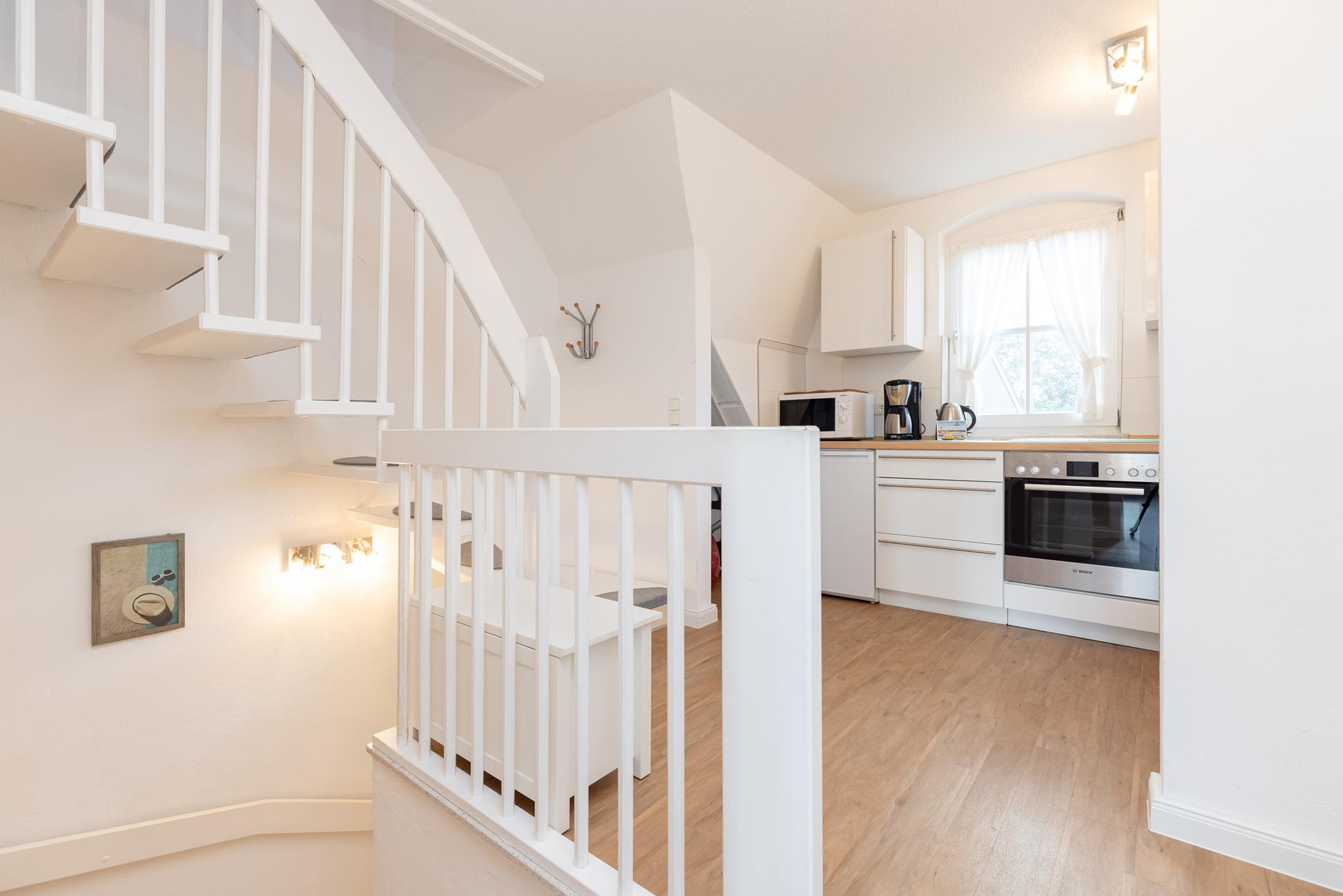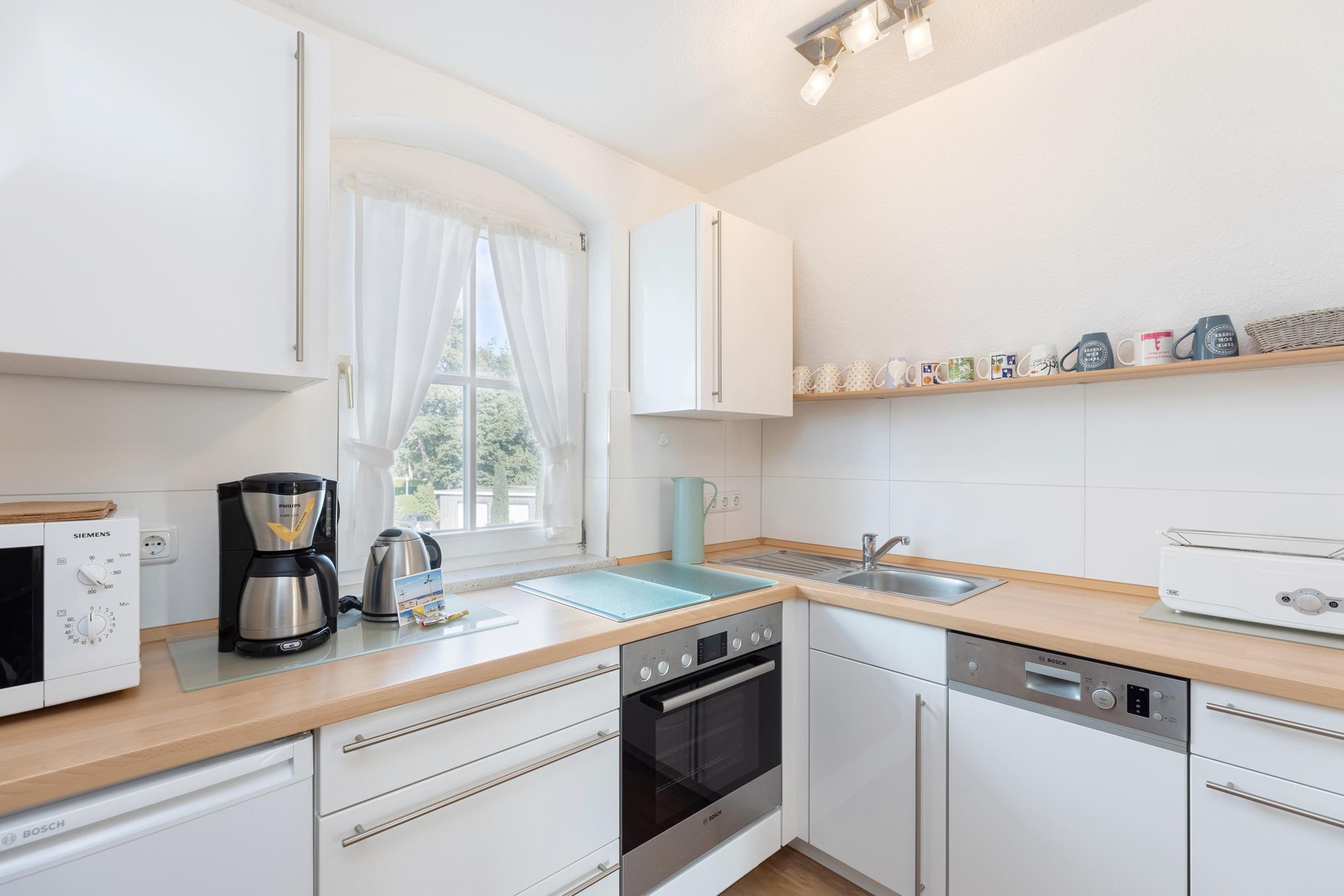 Die offene Küche ist komplett ausgestattet mit 4-Platten-Ceran-Kochfeld, Backofen, Spülmaschine, Kühlschrank, Mikrowelle, Wasserkocher, Toaster und Kaffeemaschine.
