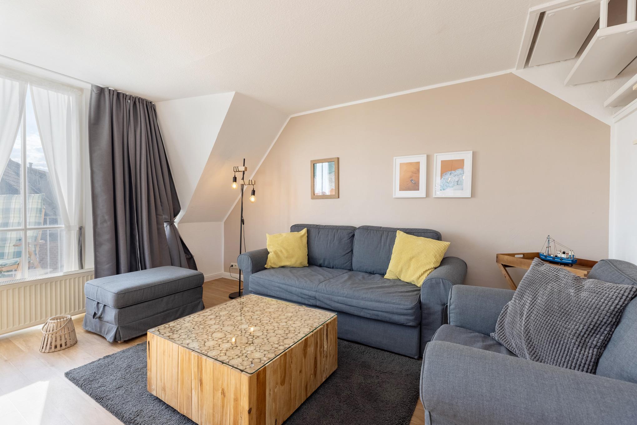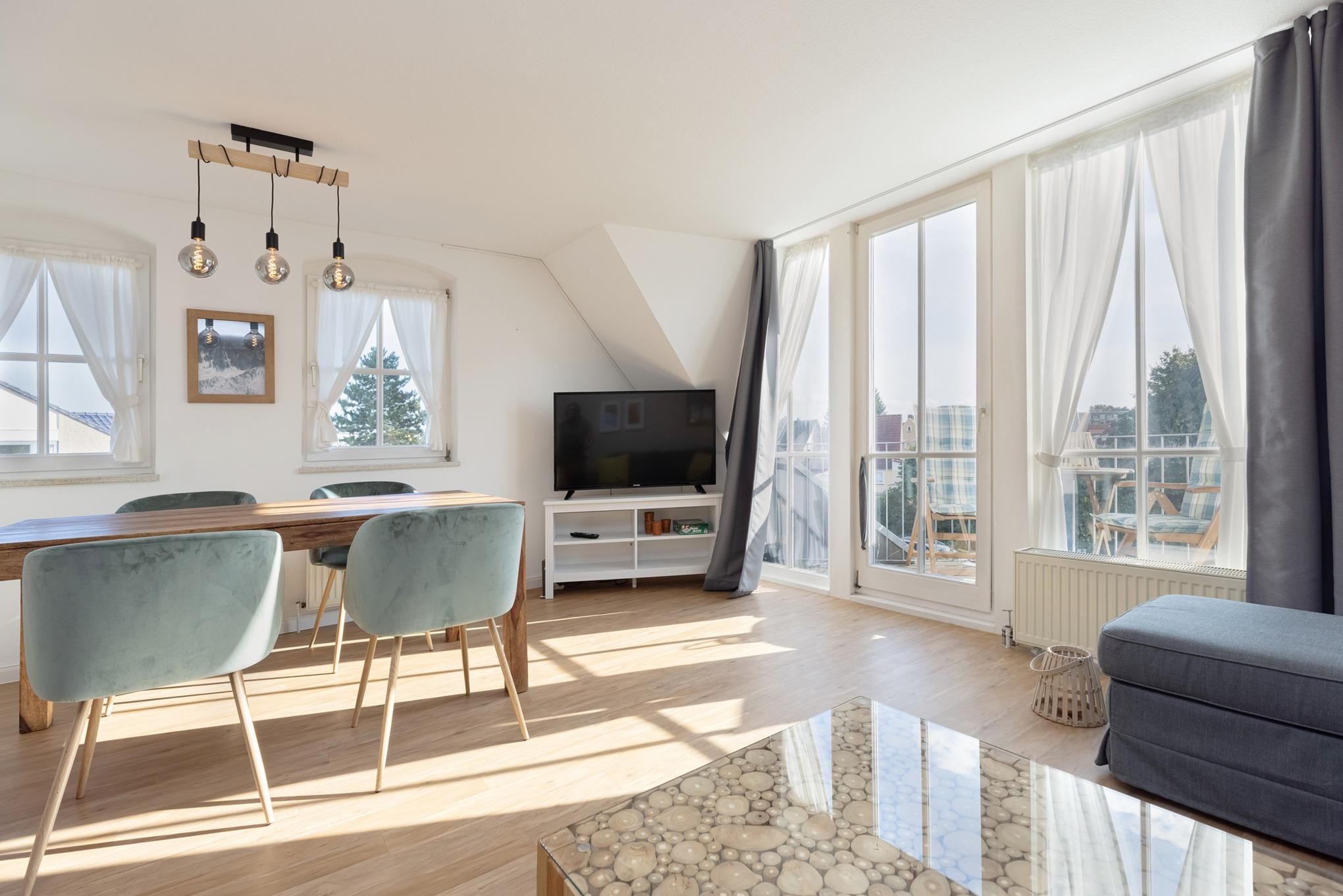 Das moderne Wohn- und Esszimmer bietet Ihnen den direktem Zugang zum Balkon (Süd-West-Ausrichtung). Es ist mit einem Schlafsofa (140x200 cm), einem Sessel, Flachbild-TV, einem Couchtisch, einem Essplatz für 4 Personen und einem Wohnzimmerschrank ausgestattet und mit Laminat ausgelegt.