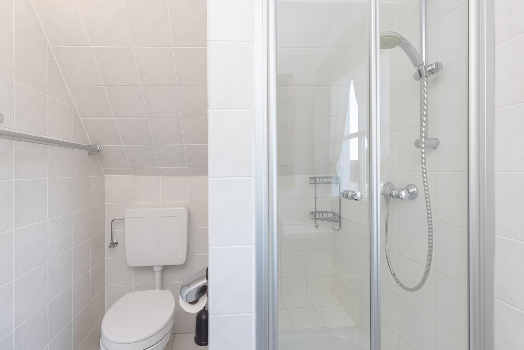 Das hell geflieste Tageslicht-Bad verfügt über eine Dusche, WC, Waschbecken und Waschmaschine.