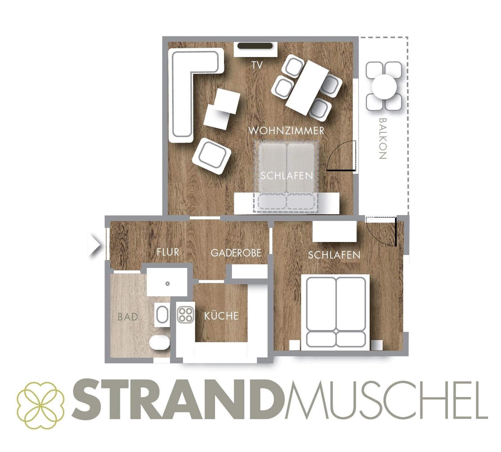 Unsere Wohnung "Strandmuschel" ist eine 2-Zimmer Wohnung mit etwa 60 m², für eine 4-köpfige Familie bestens geeignet und liegt im 1. OG des Hauses.