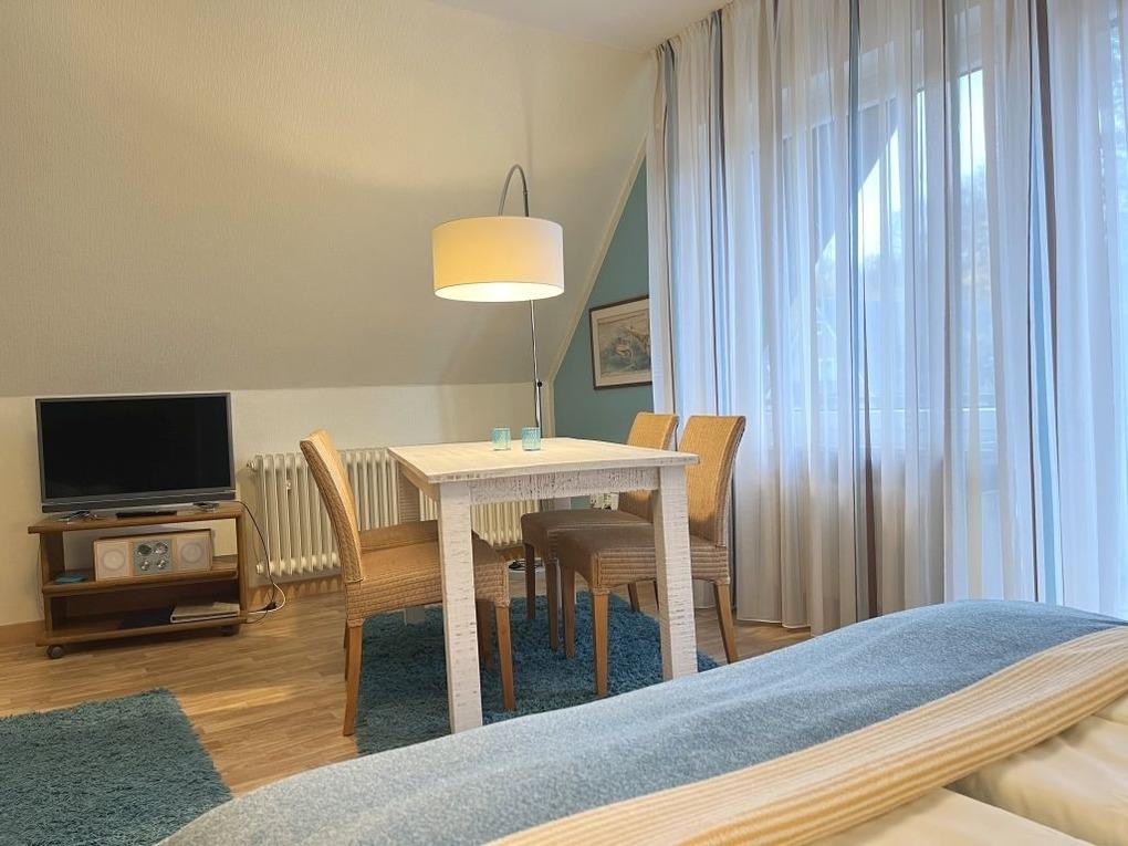 Der Wohn-Schlafraum mit Essecke und den praktischen Schrankdoppelbetten ist ein Ort für Gemütlichkeit und gesellige Stunden. Ein großer südwest-Balkon liegt direkt davor. Die bequeme Sitzecke, Sessel und Flachbildschirm laden zum Faulenzen ein, während nebenan in der separaten Küche das Abendessen zubereitet wird.