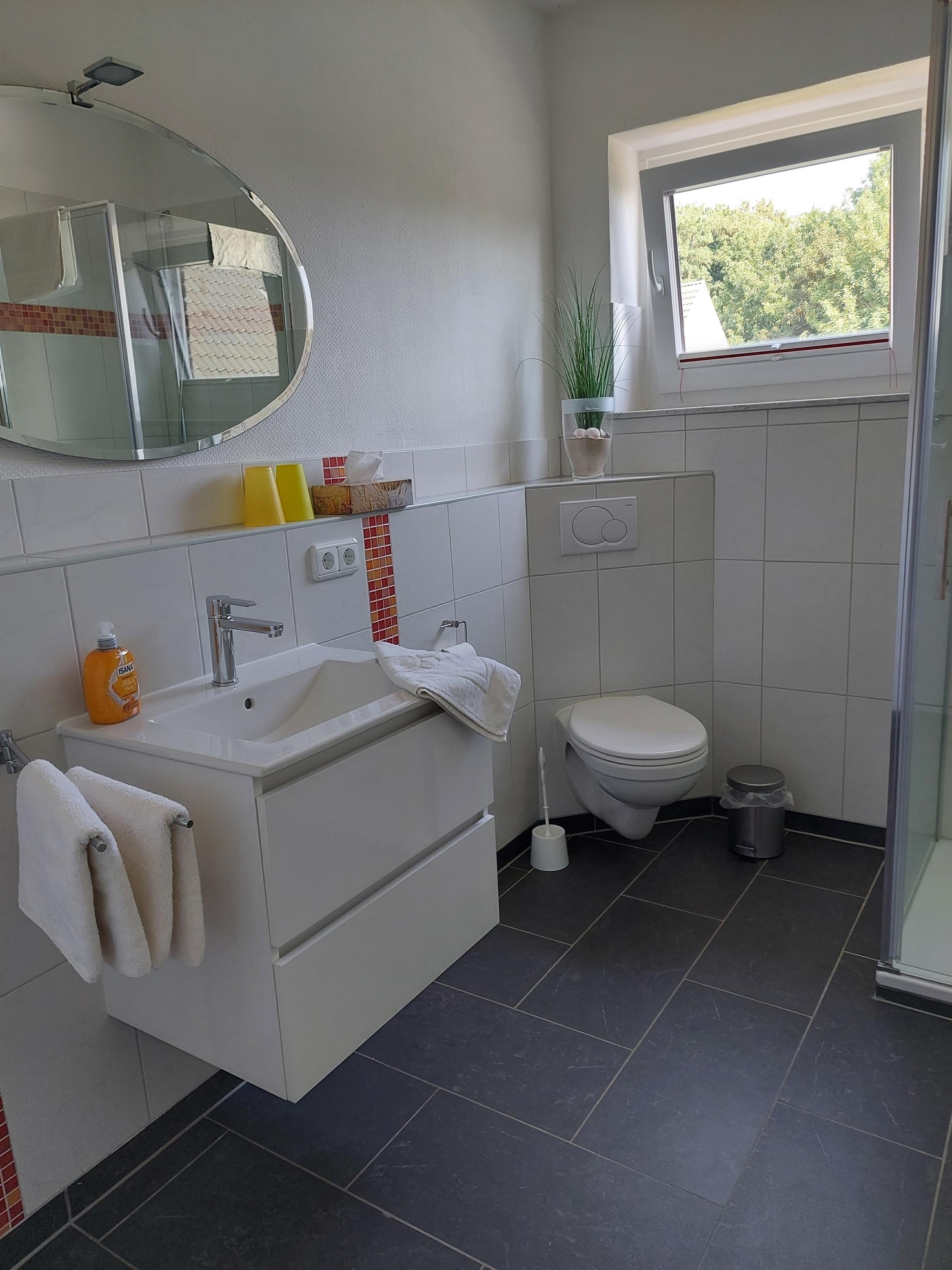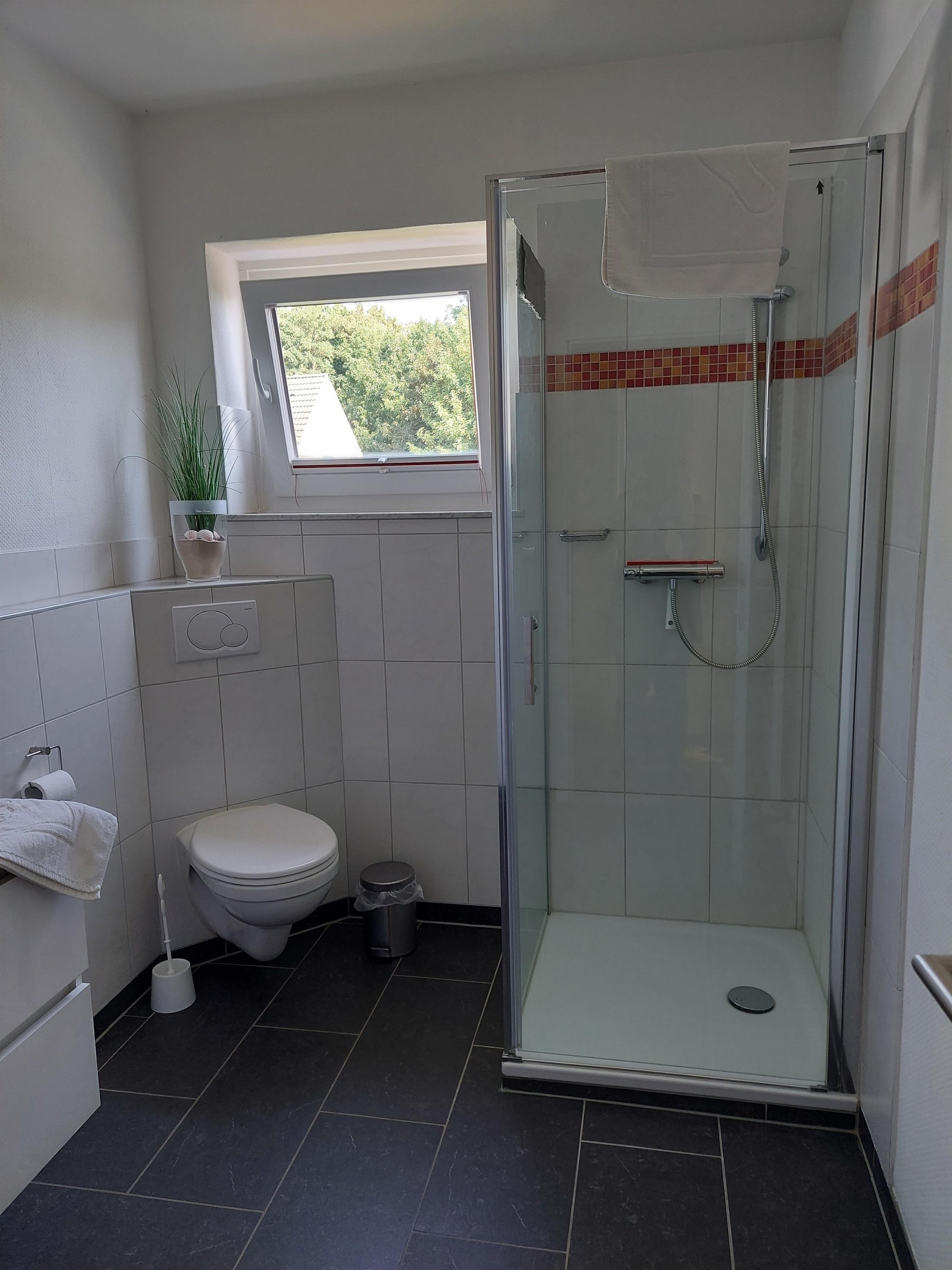 Das großzügige Duschbad ist hell und freundlich gestaltet.