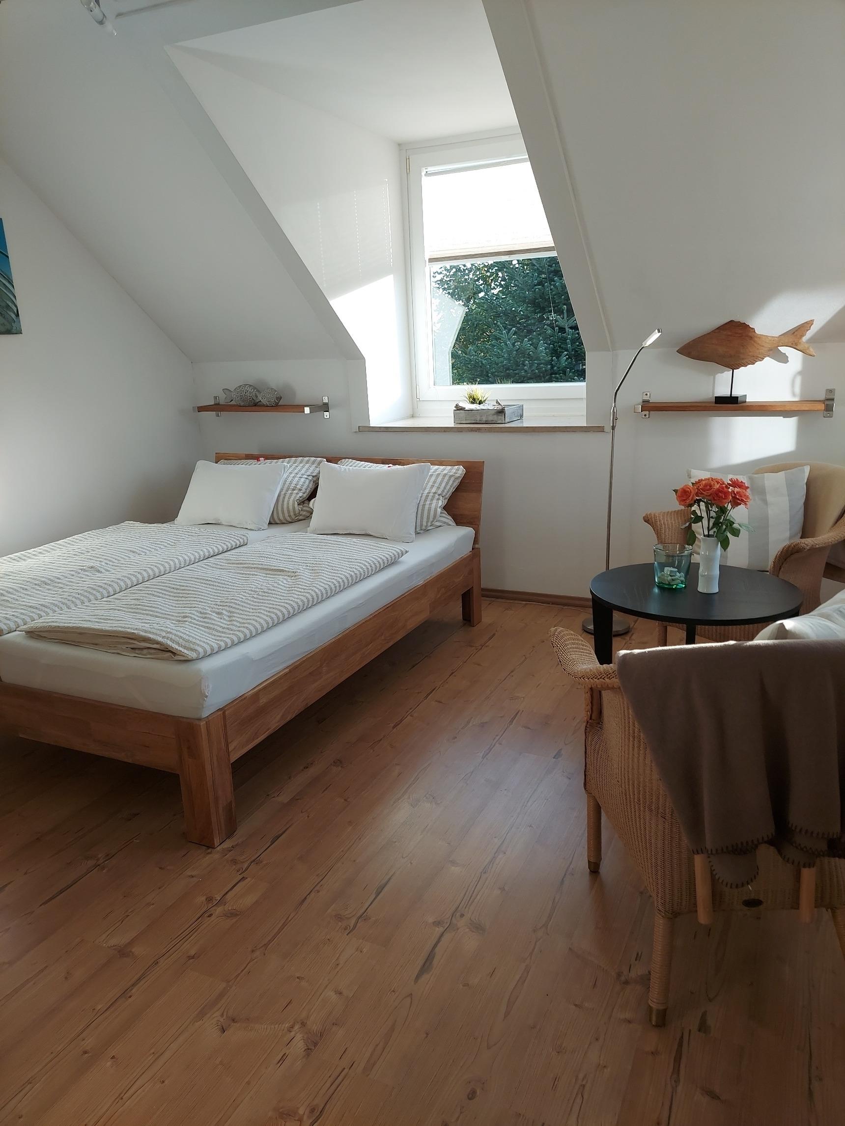 Unsere "Kleine" bietet Platz für bis zu zwei Personen. Der Wohn-Schlafraum ist mit einem Doppelbett (Breite 1,60 m) und einer kleinen Sitzecke ausgestattet.
