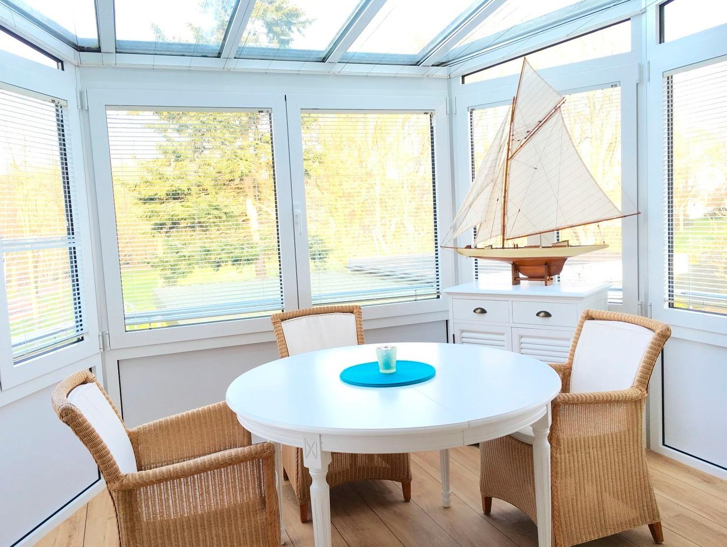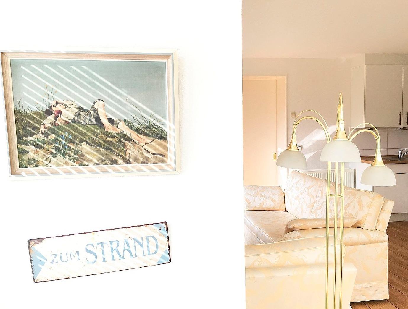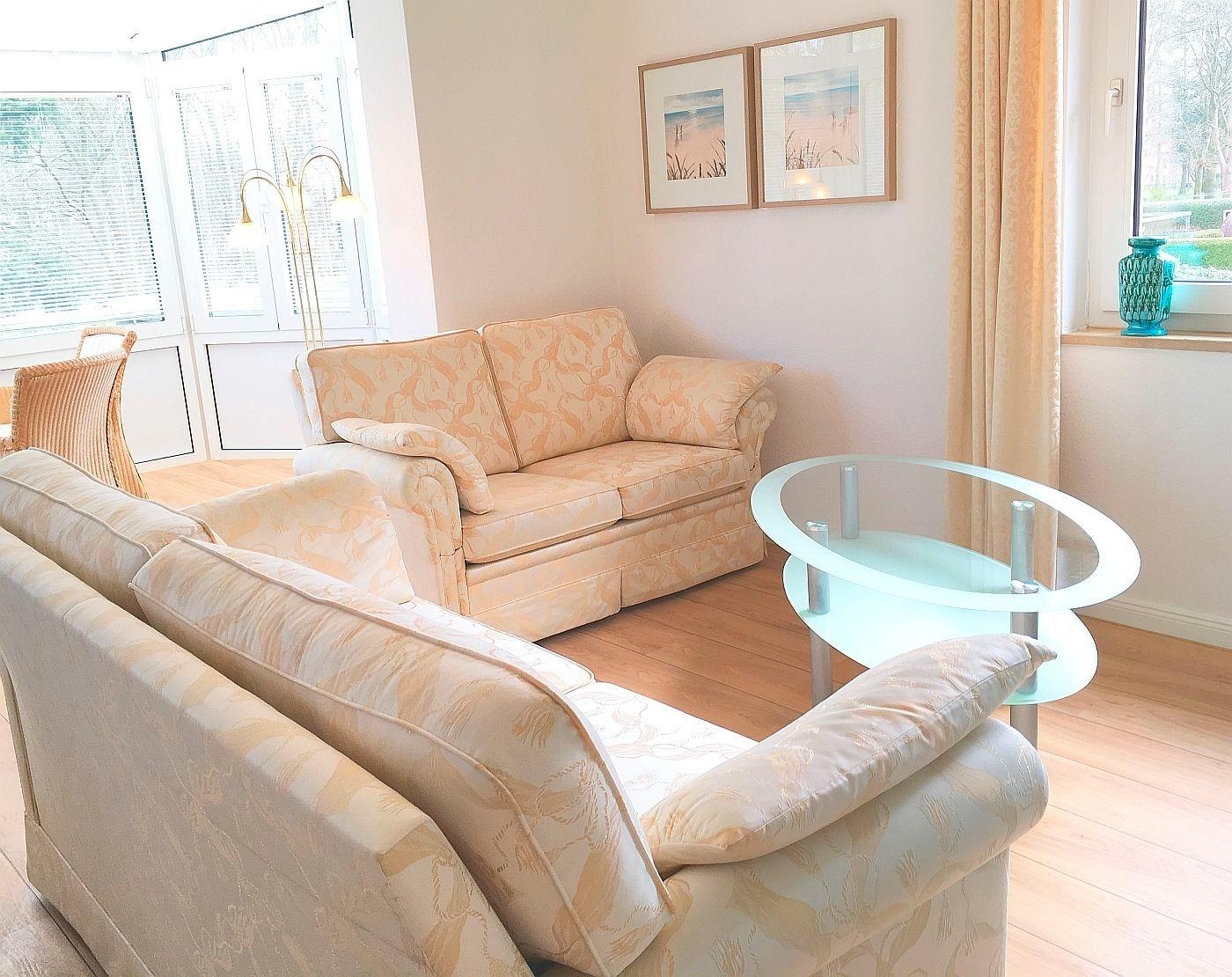Der Wohnraum mit integrierter, moderner Küche und Essecke ist ein Ort für Gemütlichkeit und gesellige Stunden. Genießen Sie in dem lichtdurchfluteten Erker den Blick in den Garten und den direkt angrenzenden Kurpark vom Frühstückstisch aus. Die maritim gestaltete Sitzecke mit zwei Sofas und großem Flachbildschirm lädt nach einem erlebnisreichen Urlaubstag zum Faulenzen ein, während in der komfortablen Küche das Abendessen zubereitet wird.