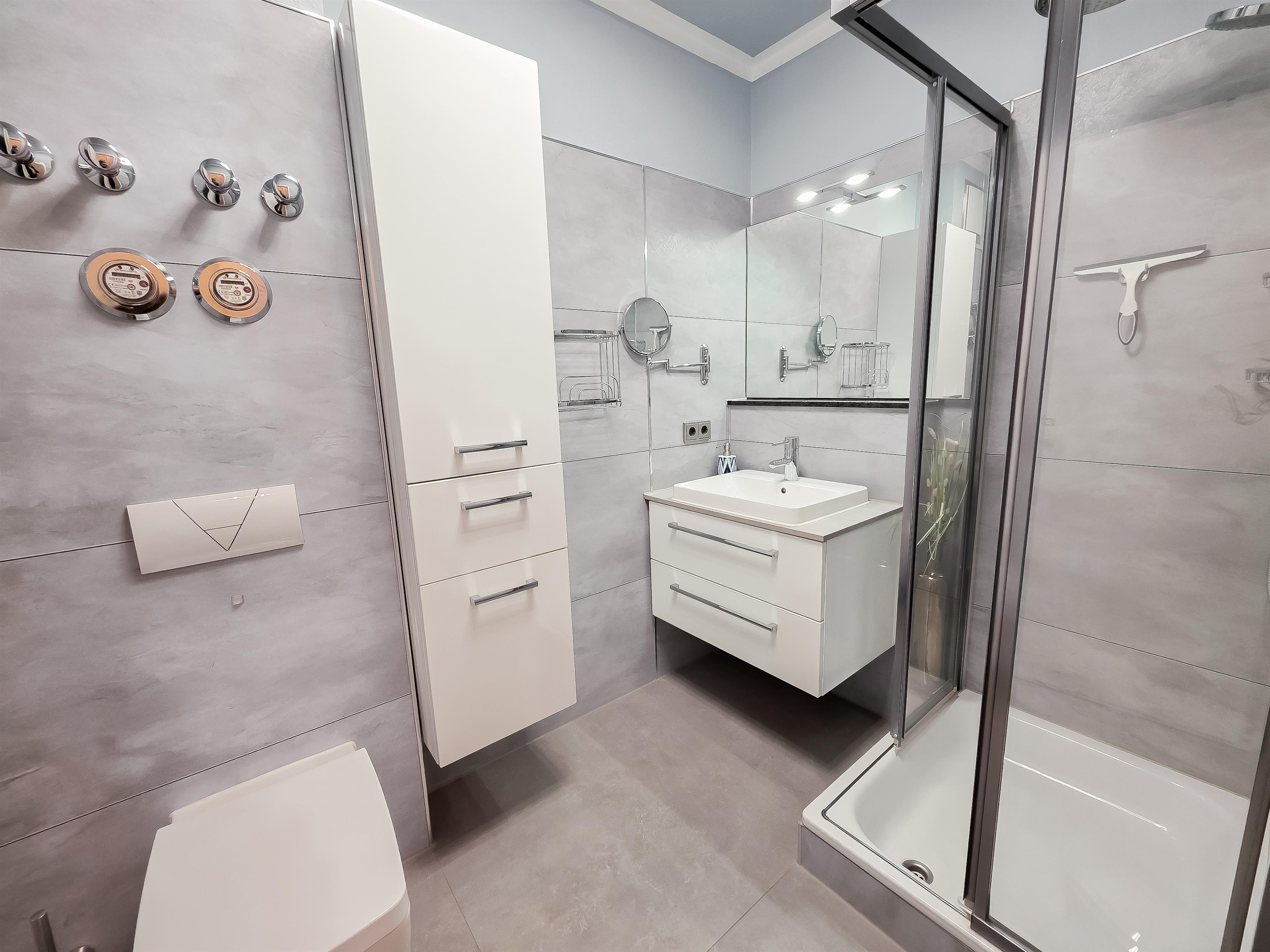 Modernes Bad mit Dusche, Waschbecken und WC.