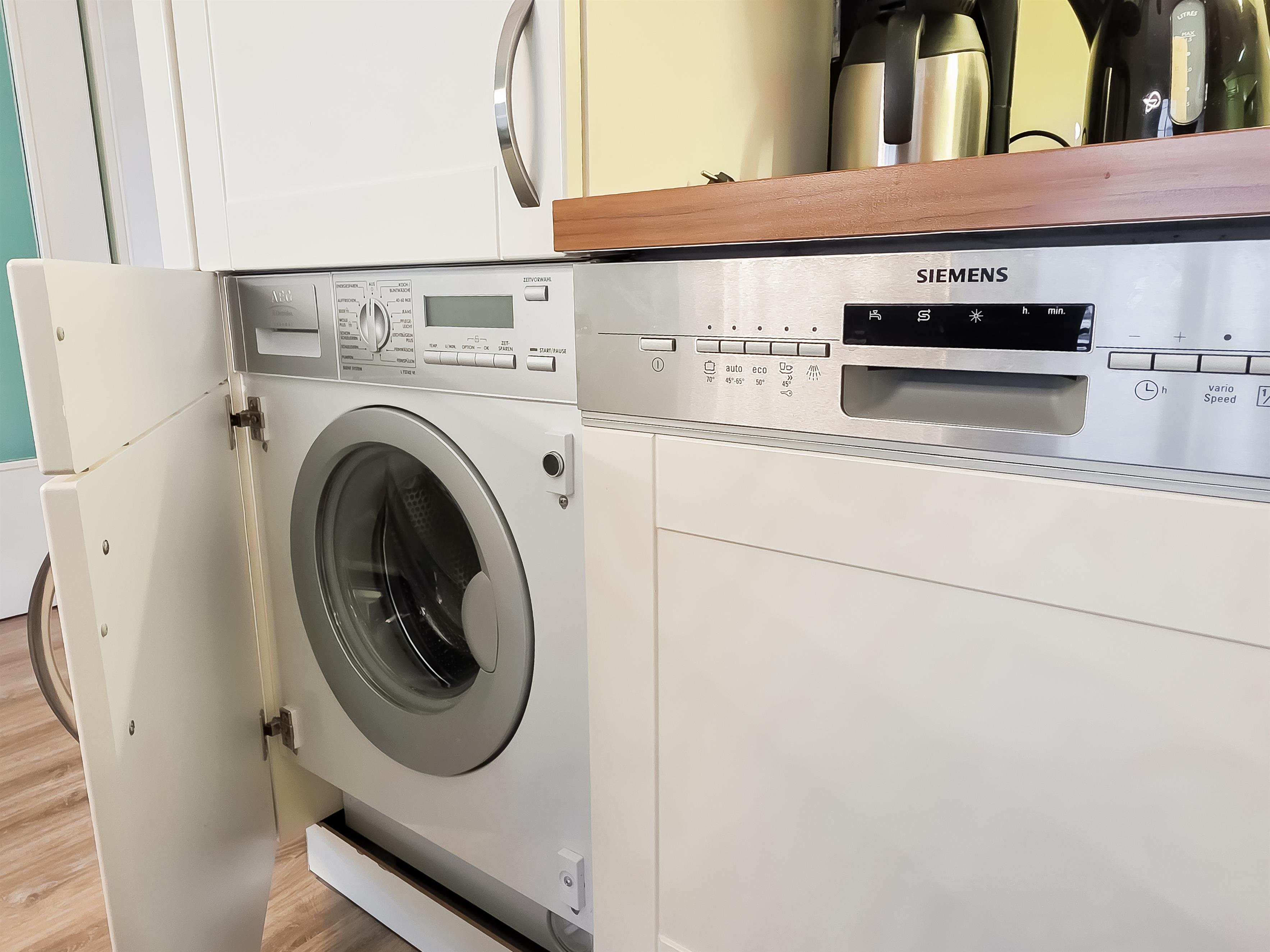Die offene Einbauküche ist mit E-Herd, Backofen-Cerankochfeld, Abzugshaube, Kühlschrank, Mikrowelle, Geschirrspülmaschine und den üblichen Küchengeräten sehr gut ausgestattet. Eine Waschmaschine ist mit in der Küche integriert hinter einer Türe.