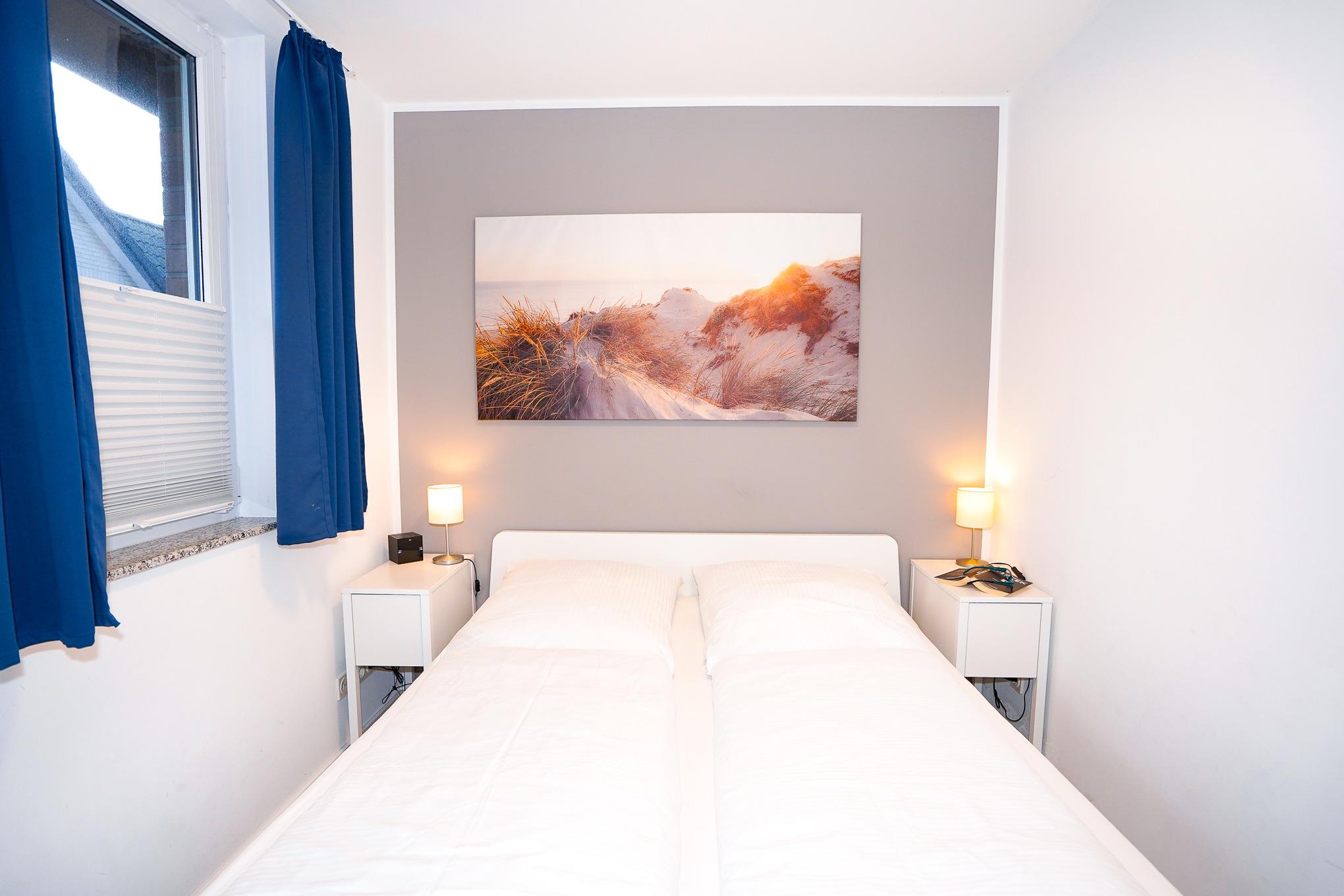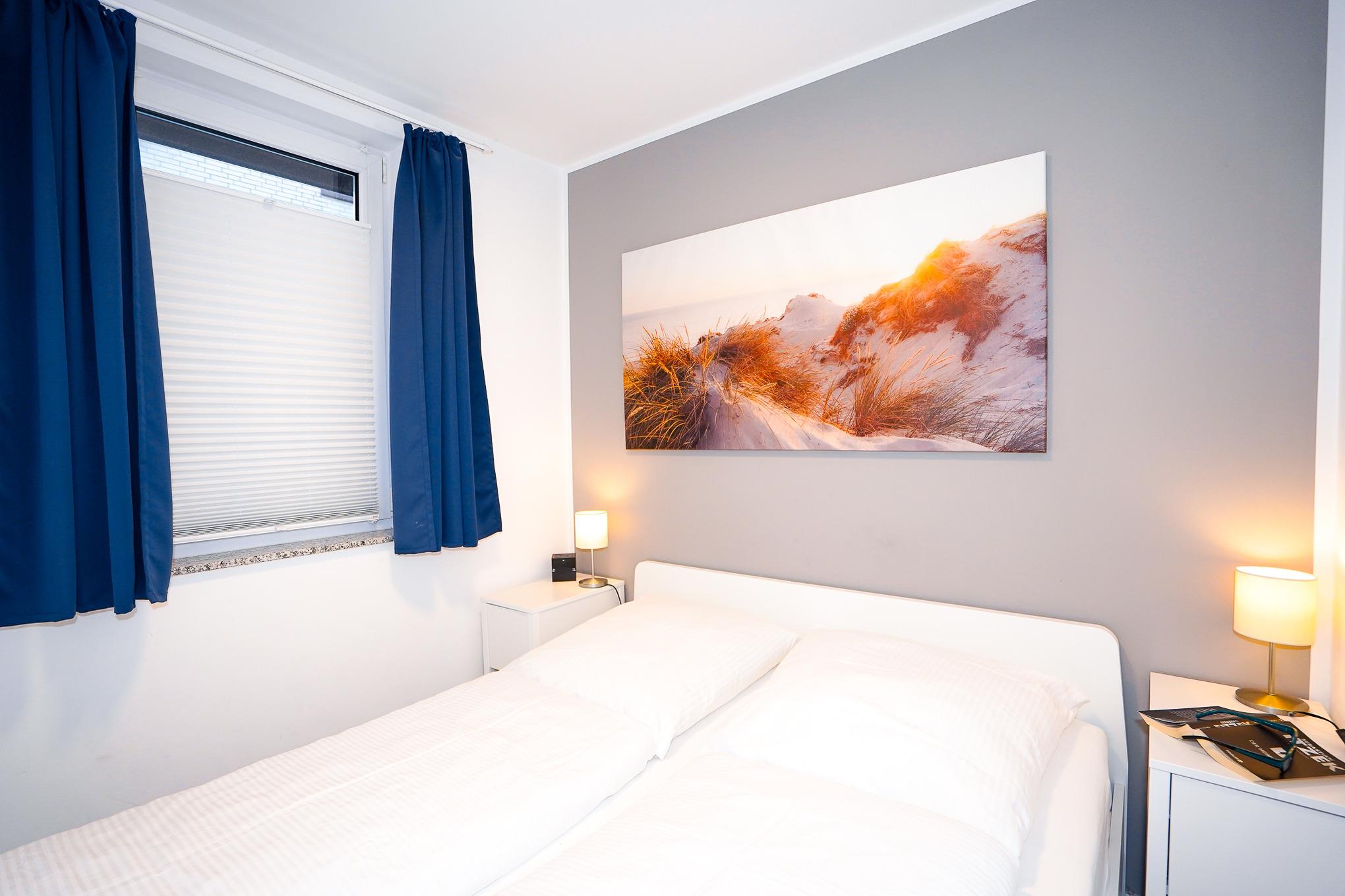 Im abgetrennten Schlafbereich finden Sie ein Doppelbett (2 x 80 x 200) vor. Alle Fenster in der Wohnung können mit Plissees und Vorhängen verdunkelt werden.