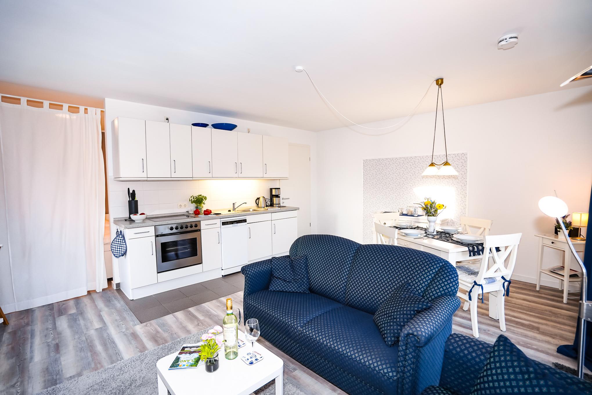 Die im Wohnbereich integrierte Küchenzeile ist mit einer Spülmaschine, Backofen, Cerankochfeld, Kühlschrank mit Gefrierfach und diversen Elektrokleingeräten ausgestattet.