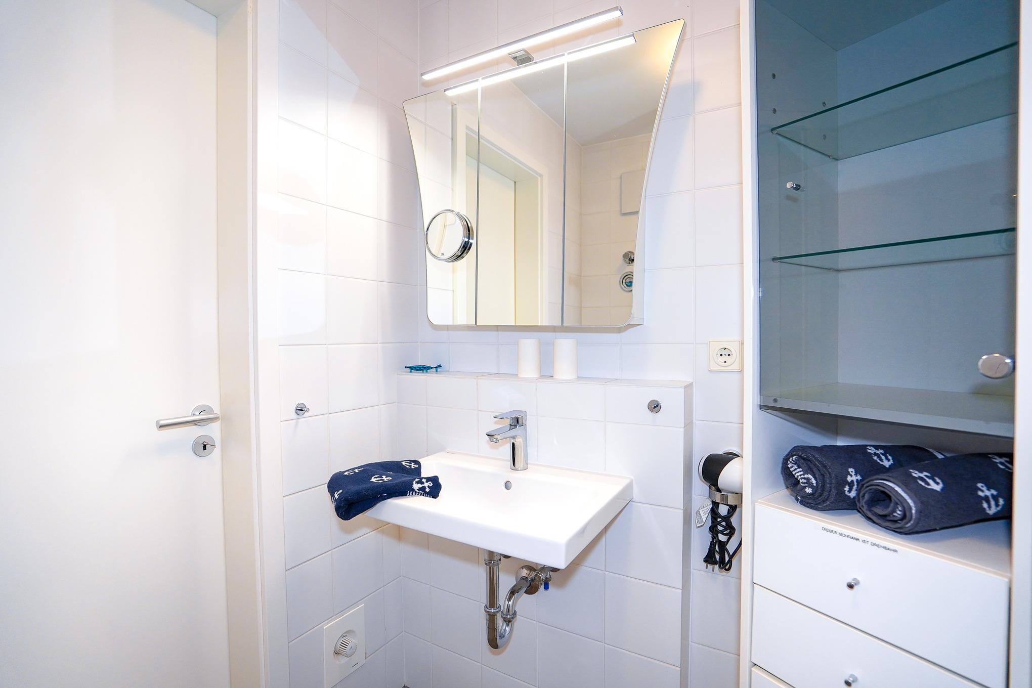 Das freundliche Badezimmer mit Fußbodenheizung ist hellgefliest und verfügt über Eckdusche, Waschbecken, WC und viele Ablagemöglichkeiten.