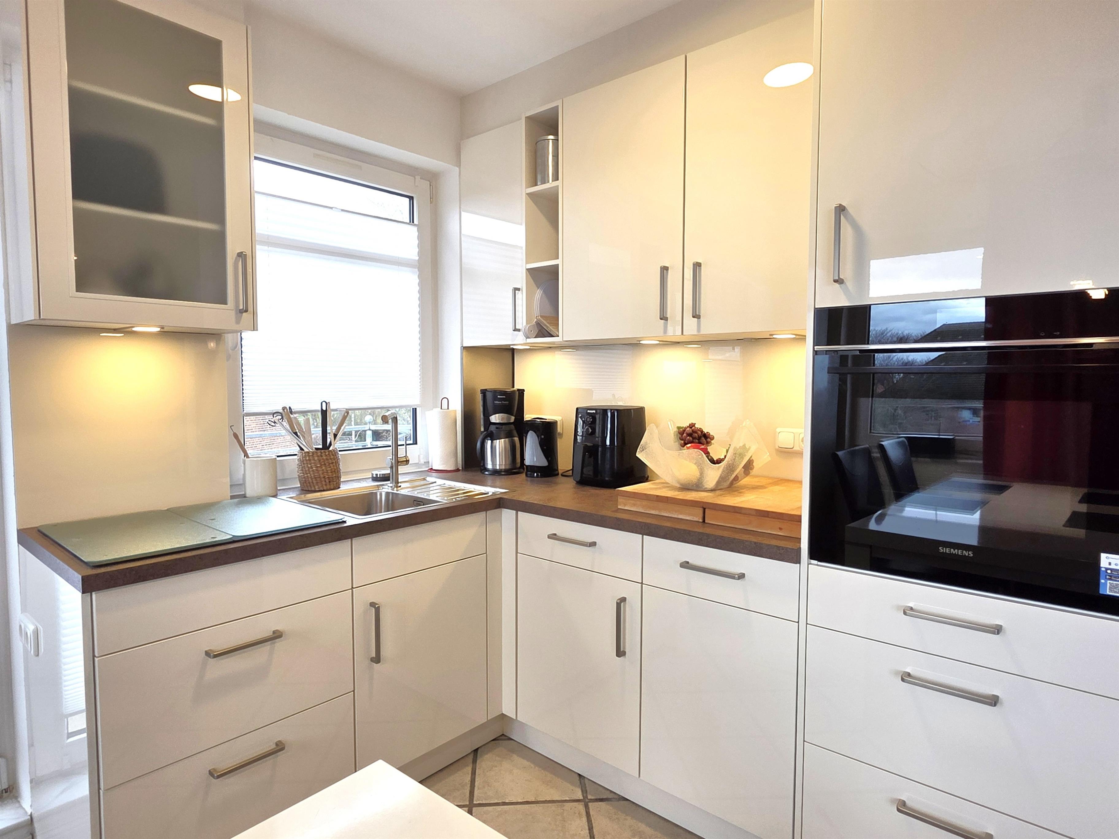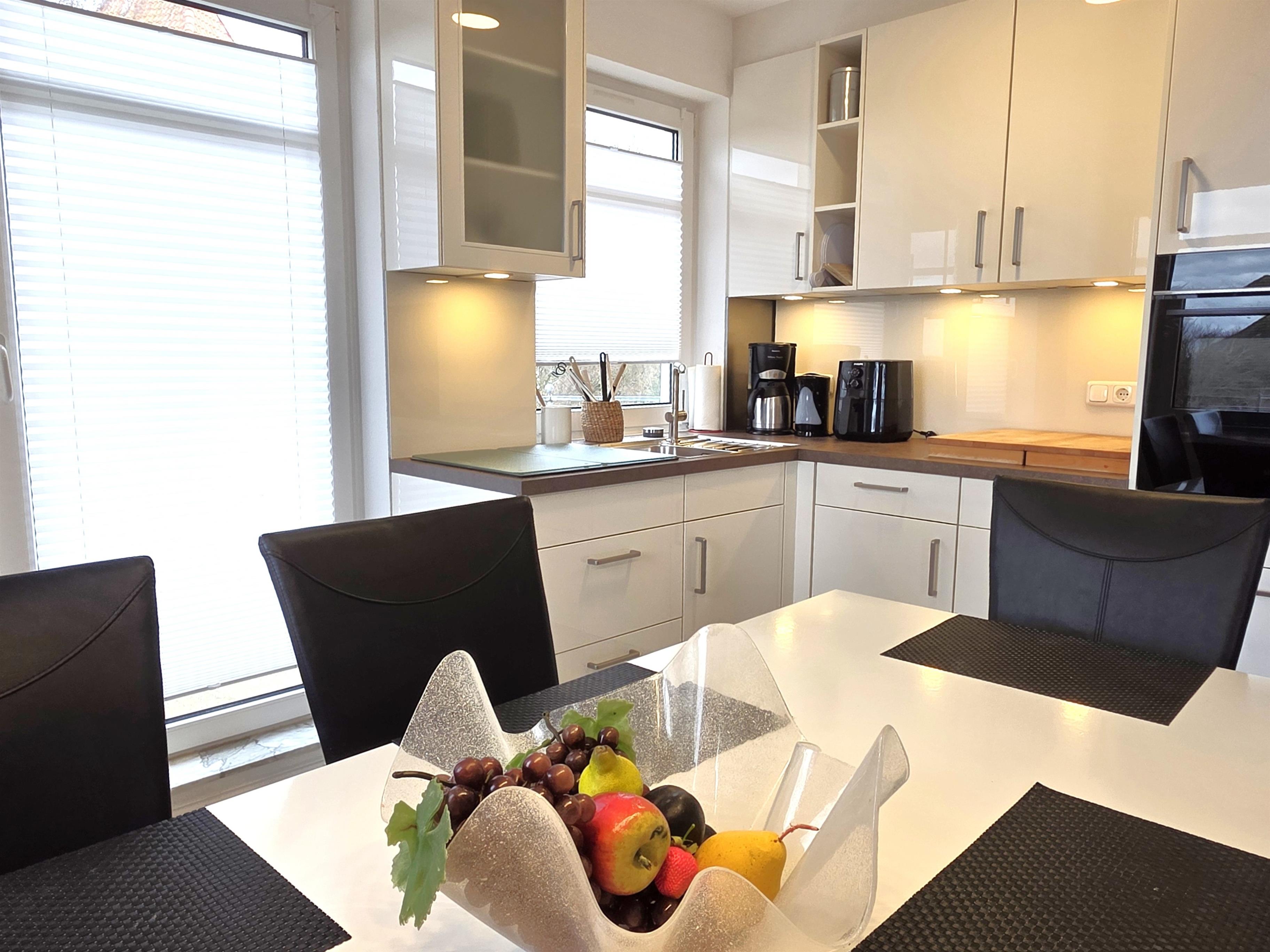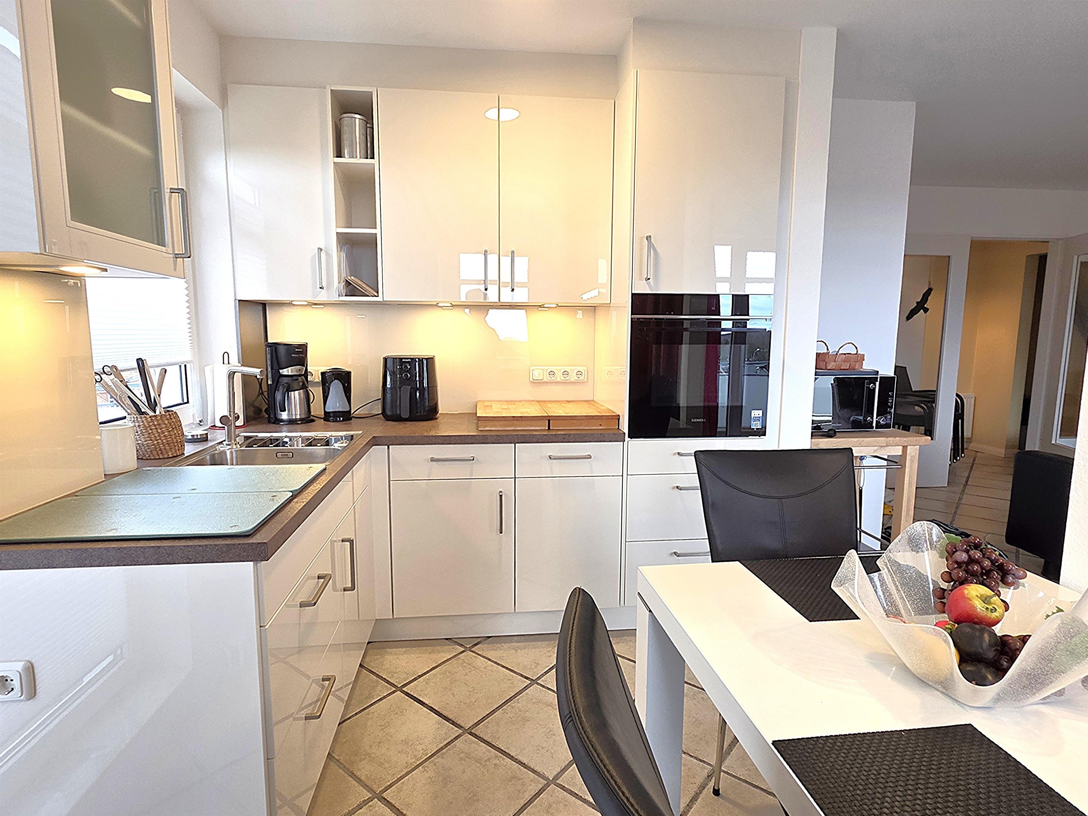 Die offene, moderne neue Küche ist mit Mikrowelle- Grill- und Backfunktion, Geschirrspüler, 4 Platten- Herd, Kühlschrank & alle üblichen Küchengeräte sehr gut ausgestattet.