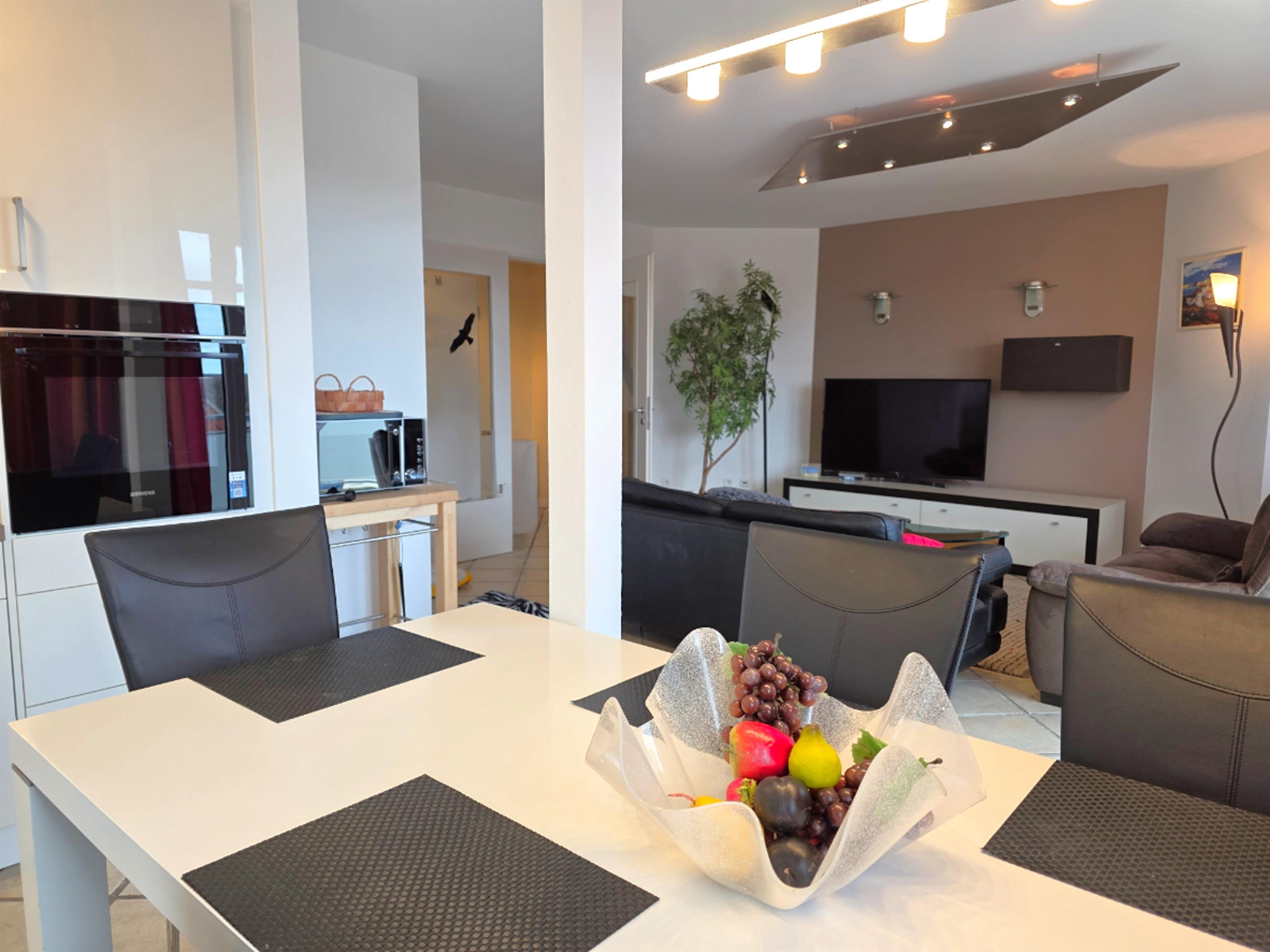 Das gemütliche, helle Wohnzimmer ist mit einer bequemen Couchgarnitur, Essplatz, Kabel-TV, DVD-Player, Video-Recorder & Stereoanlage eingerichtet. Hier haben Sie Zugang zum möblierten Nord-Ost-Balkon.