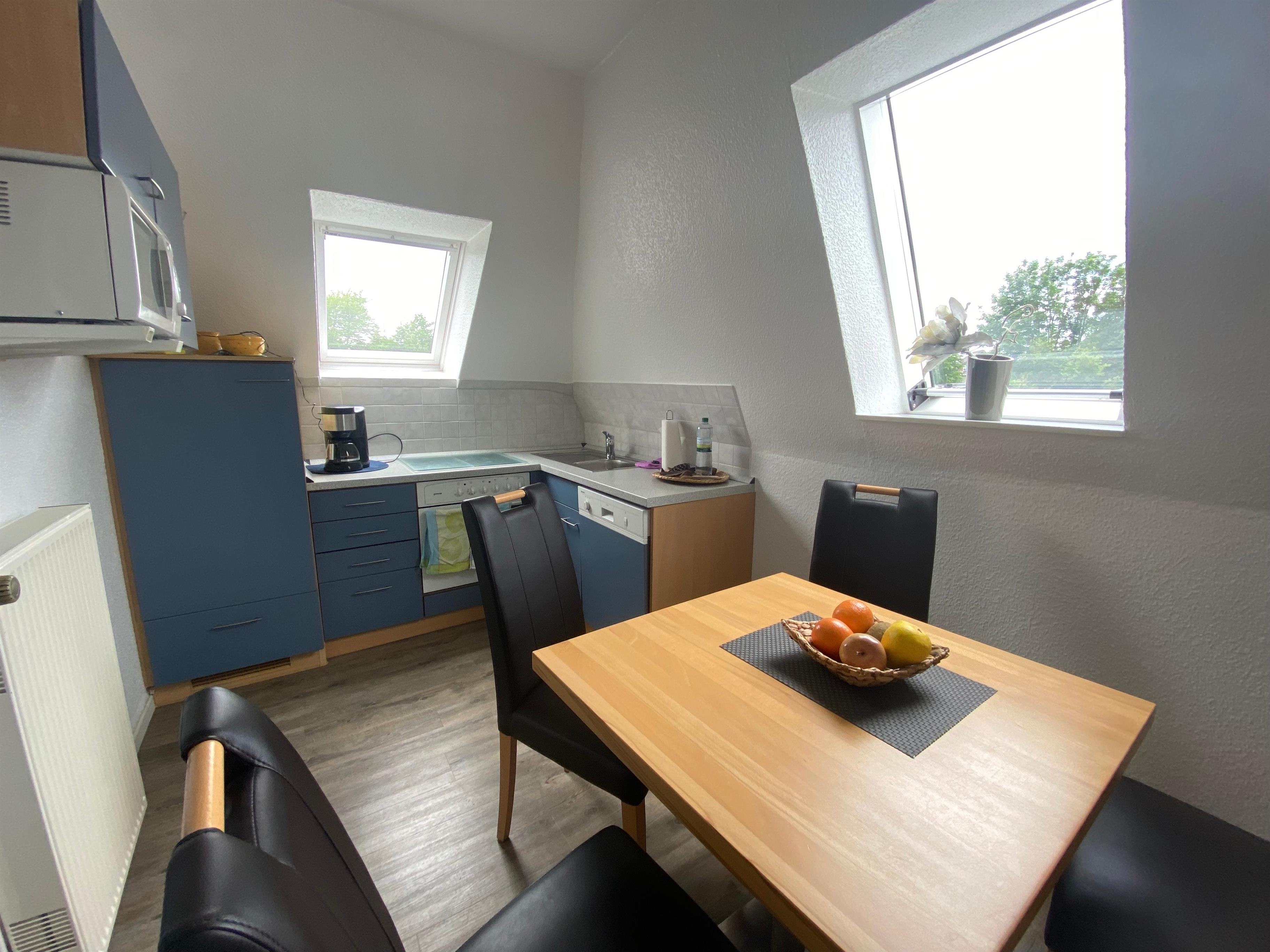 1 komplett ausgestattete Küche mit Ceranfeld, Kühlschrank, Backofen, Kaffeemaschine, Geschirrspüler, Mikrowelle, Toaster, Wasserkocher, Essplatz mit Tisch und modernen Stühlen