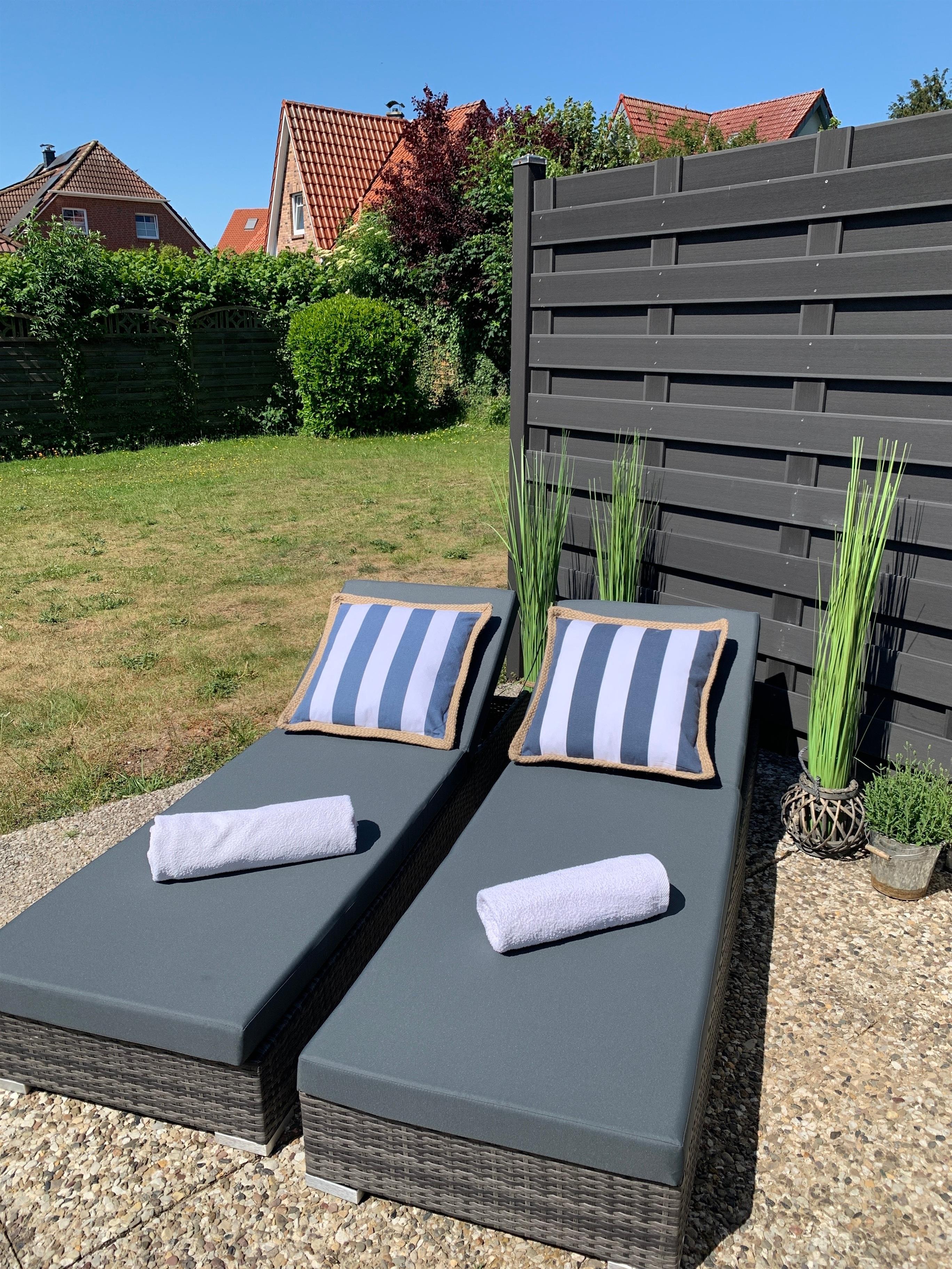 Genießen Sie Ihre freie Zeit auf der großen Südterrasse mit Grillkamin und entspannen Sie sich auf den bequemen Gartenmöbeln. Auch an kühleren Tagen sorgt die Fußbodenheizung für angenehme Wärme, während die Außenjalousien für eine angenehme Beschattung sorgen. Für Ihre Wäsche steht ein Wäscheständer bereit und Bettwäsche sowie Handtücher können gemietet werden.