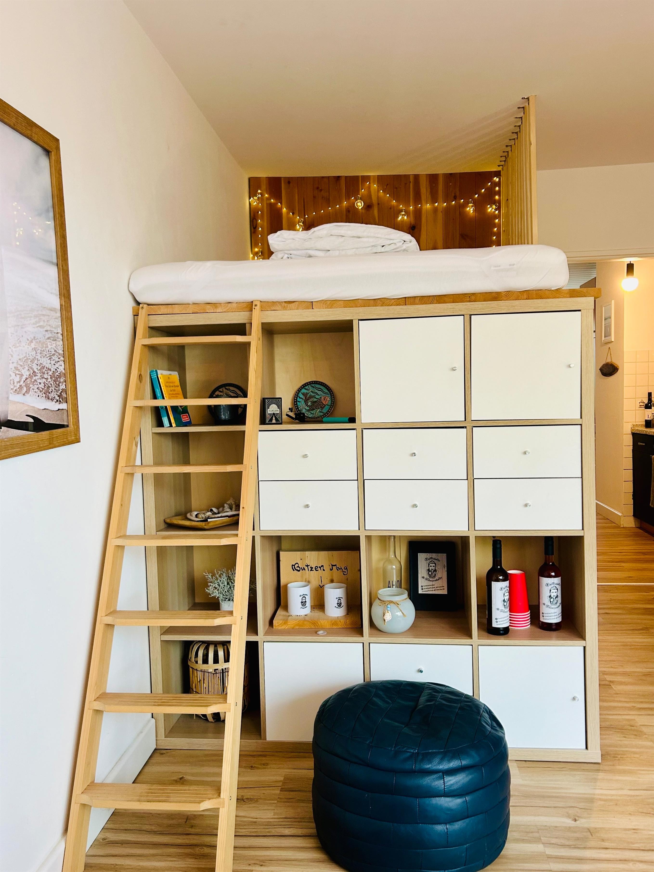 Das Hoch-Doppelbett mit integriertem Kleiderschrank schafft Platz, Luft und Ordnung.