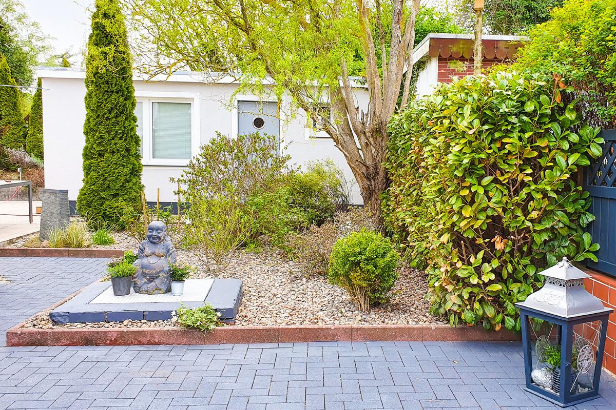 Moderne Ferienwohnung in Grömitz mit Sauna, großer Terrasse und Garten hinter einem Obstgarten.