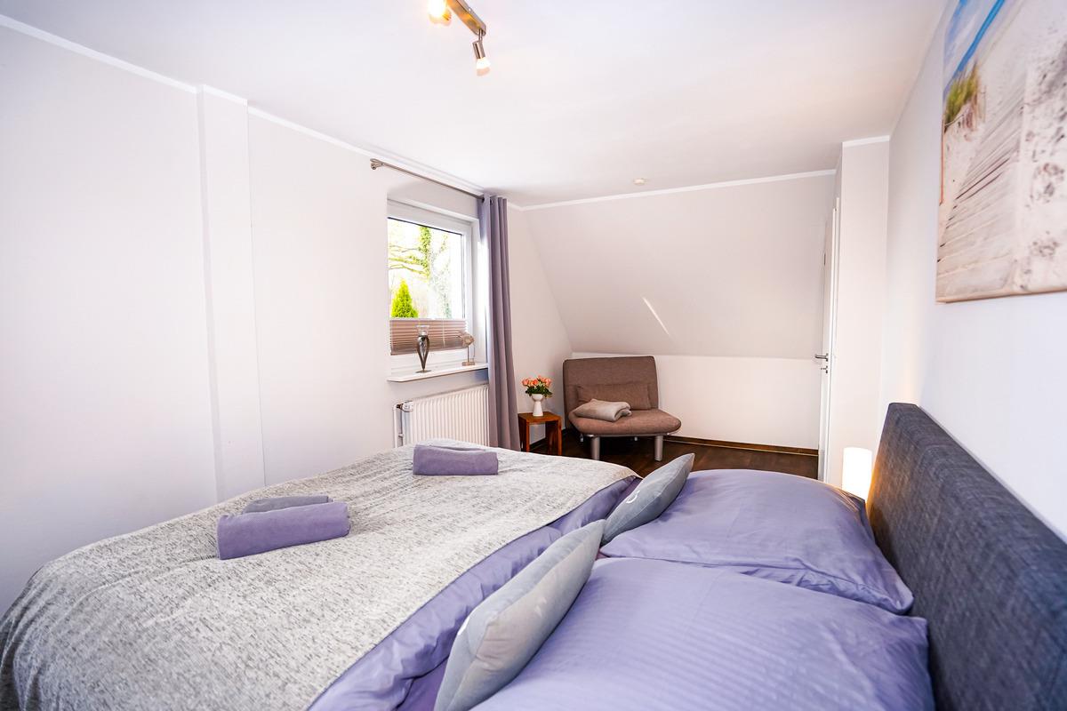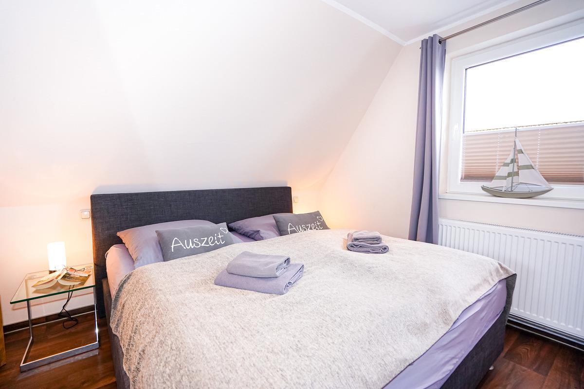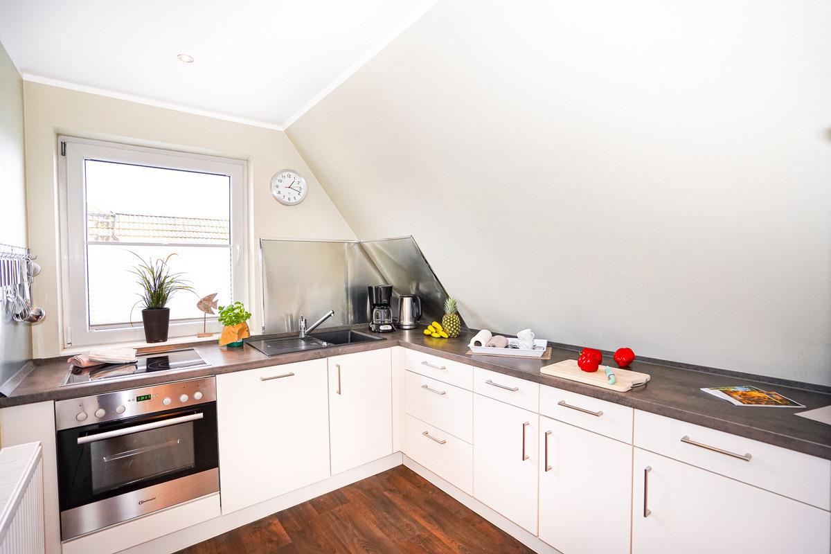 Die Wohnung "Meeresbrise" liegt über zwei Ebenen in der ersten Etage sowie im Dachgeschoß und ist ca. 76 qm groß. In der ersten Etage befindet sich ein großes Schlafzimmer mit eigenem Zugang zur schönen Holz-Dachterrasse. Außerdem befindet sich auf dieser Ebene ein modernes Duschbad mit großer Echtglasdusche sowie ein separates WC. Über eine Treppe erreichen Sie das Dachgeschoß. Hier befindet sich der große, lichtdurchflutete Wohn- und Essbereich inkl. offener, moderner und gut ausgestatteter Marken-Einbauküche u. a. mit Cerankochfeld, Backofen, Kühl- Gefrierkombination, Geschirrspüler, Mikrowelle, Kaffeemaschine, Wasserkocher usw. sowie ein weiteres Schlafzimmer. Vom Wohnzimmer gelangt man über eine Wendeltreppe ebenfalls auf die Dachterrasse mit eigenem Strandkorb. Lassen Sie sich beim Blick über die Felder von der wunderschönen Landschaft in den Bann ziehen!