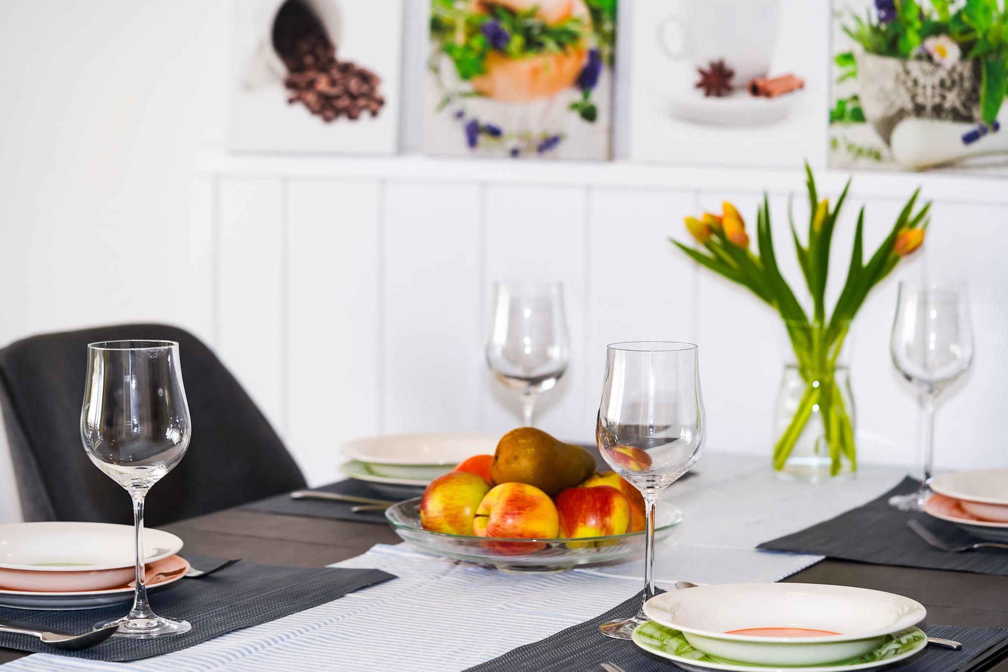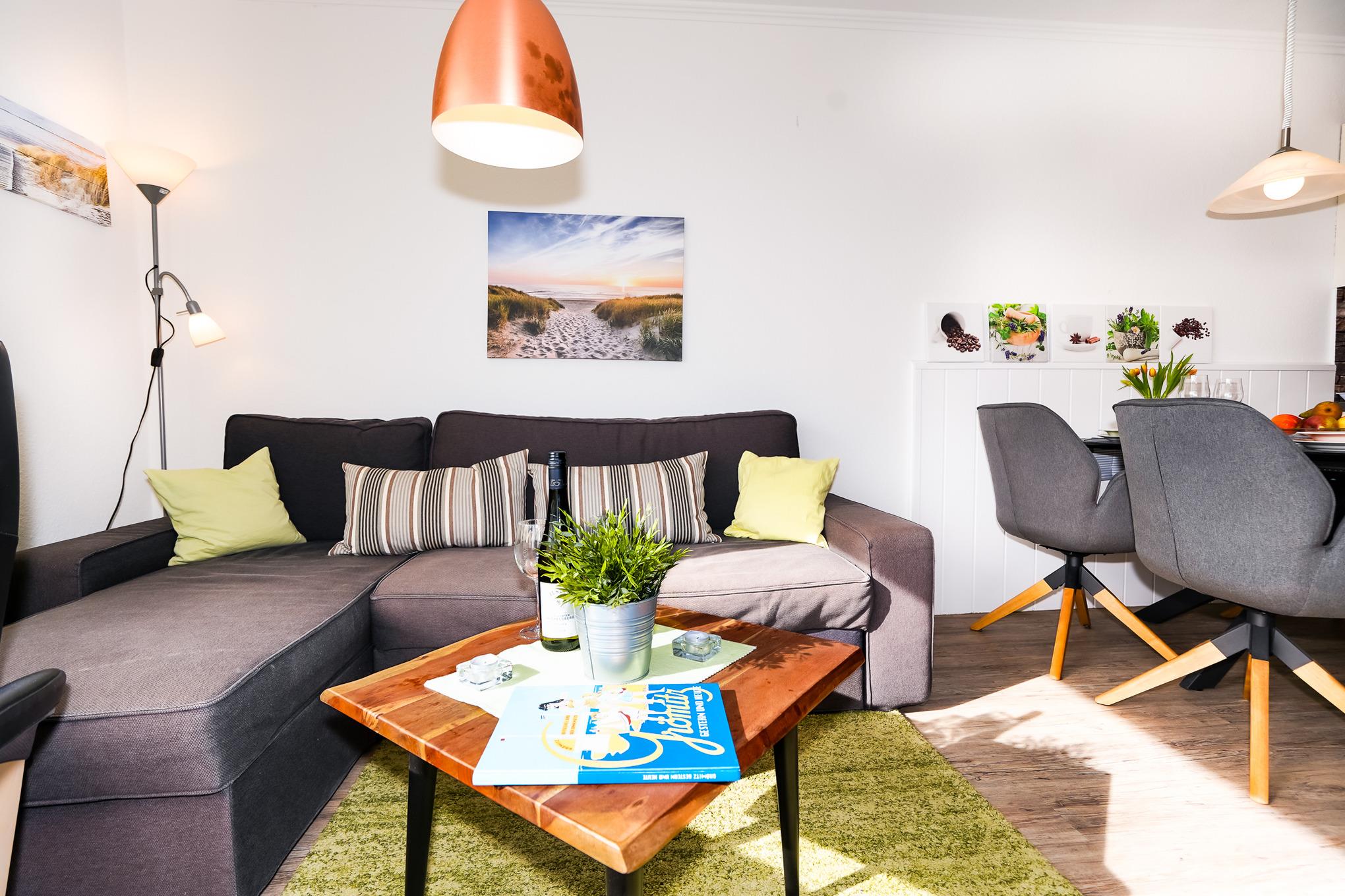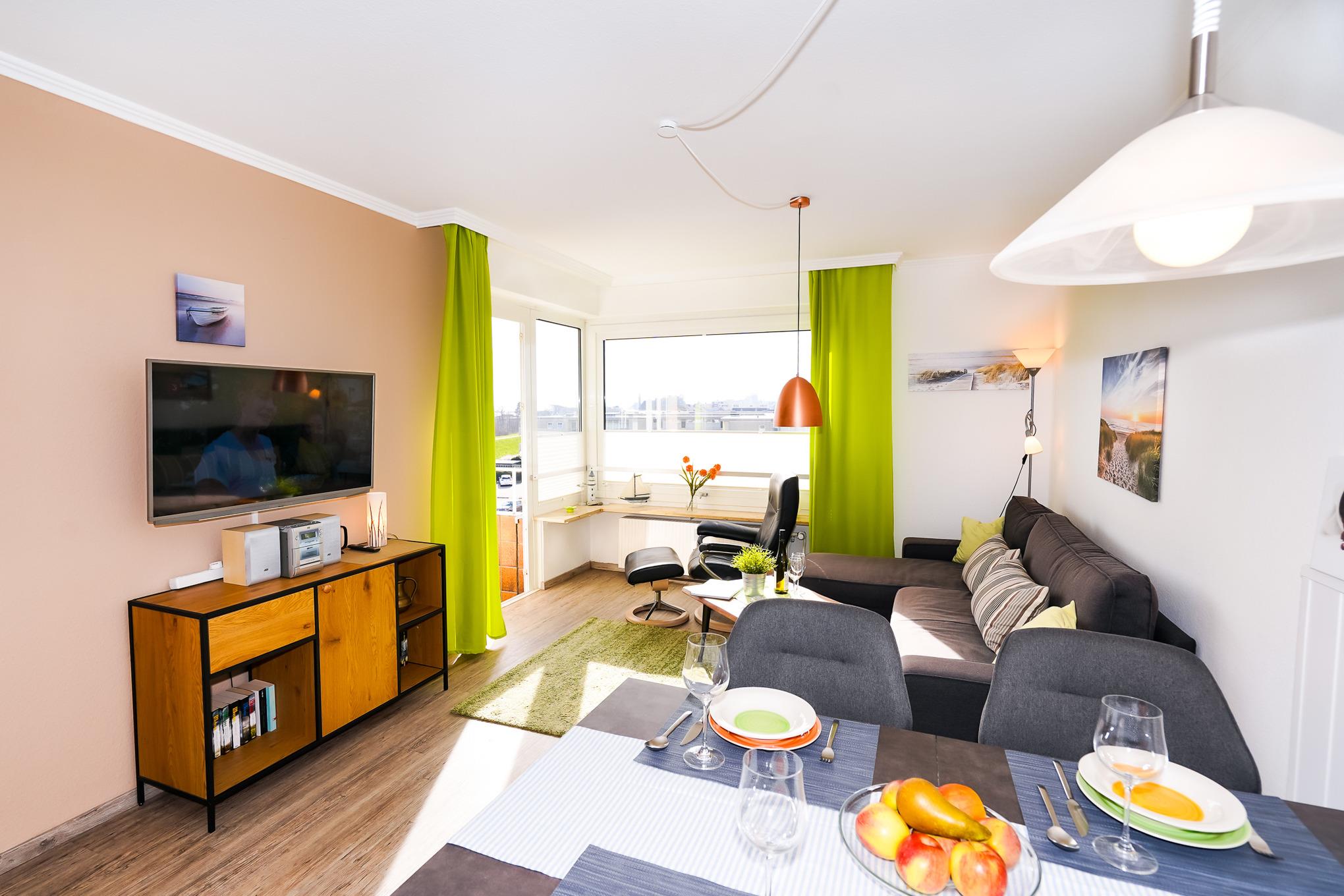 Das lichtdurchflutete Wohnzimmer bietet Ihnen ein bequemes Ecksofa, welches als Schlafcouch (160 x 200) verwendet werden kann. Ein hochwertiger Relaxsessel lädt zum eintspannen ein. Ergänzt wird das Wohnzimmer durch einen großen Fernseher, eine Stereoanlage und einen großen Esstisch. Kostenloses W-LAN steht Ihnen selbstverständlich während Ihres Aufenthaltes zur Verfügung.