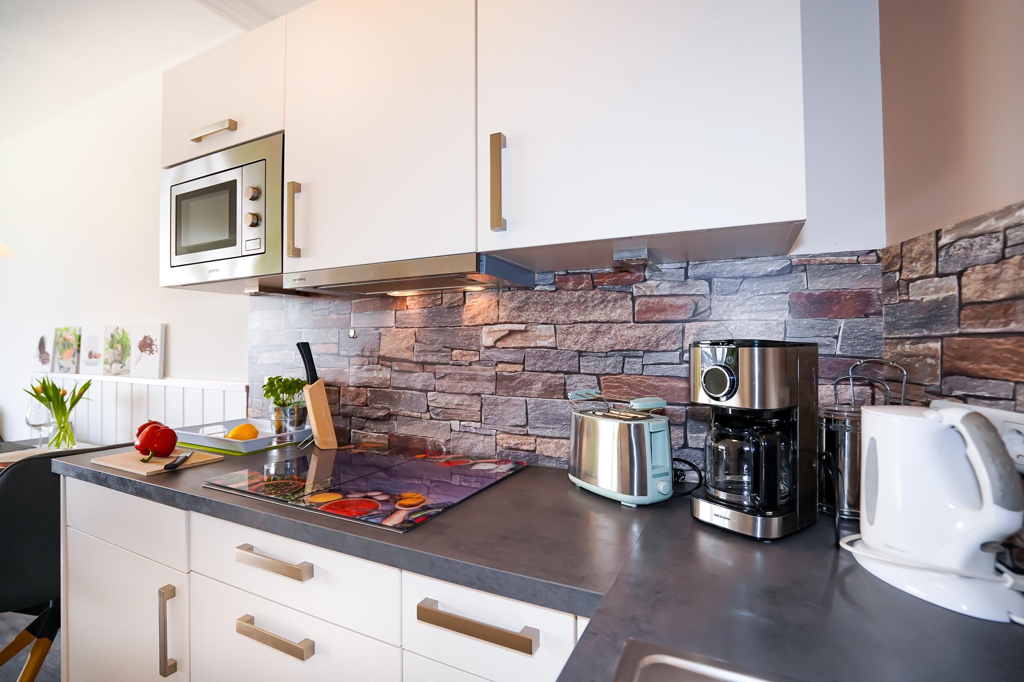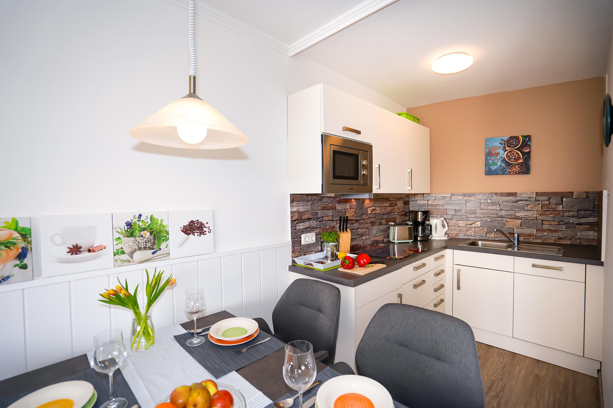 Die offen gestaltete moderne Küche bietet Ihnen ein 4er-Cerankochfeld, Spülmaschine, Kühlschrank mit Gefrierfach, Mikrowelle inklusive Backfunktion und diverse Elektrokleingeräte.