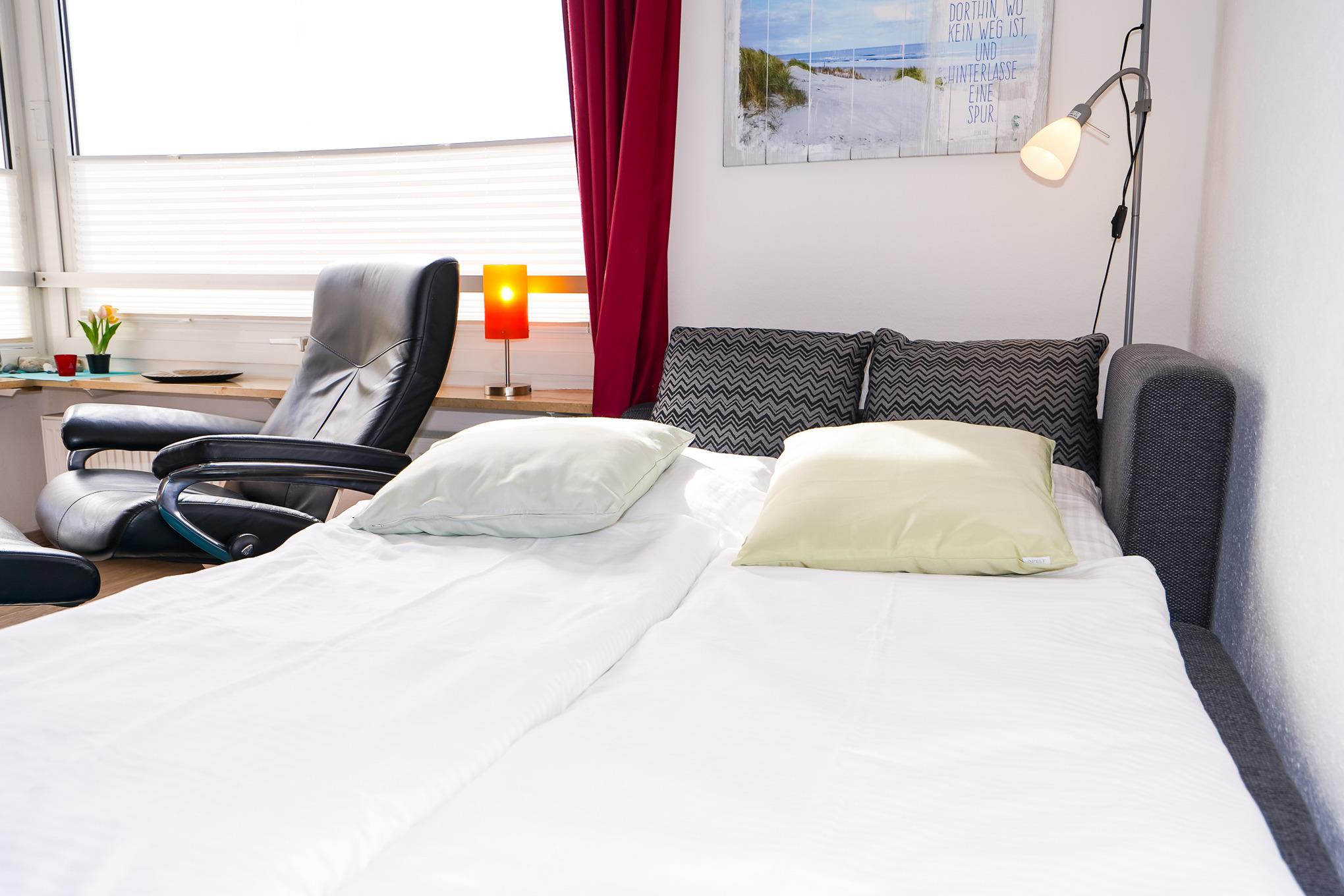 Das Schlafzimmer ist mit zwei bequemen Boxspringbetten(jeweils 90x200) und großzügigen Kleiderschränken ausgestattet. Ein Verdunkelungsplissee sorgt für eine entspannte Nacht.