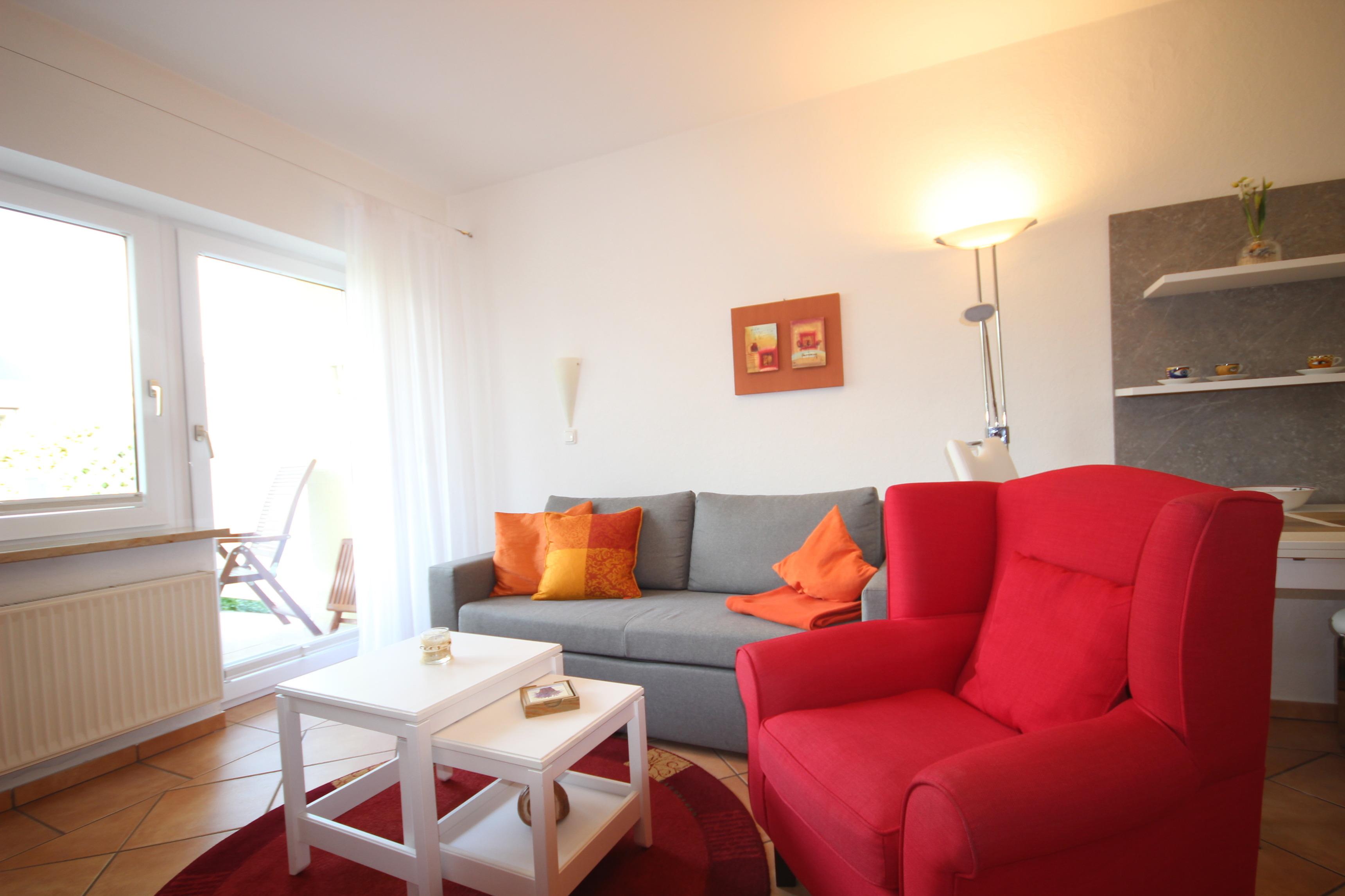 Das gemütlich eingerichtete Wohnzimmer verfügt über ein Sofa und einen gemütlichen Sessel, einen Essplatz für 2 Personen, CD-Radio sowie einen SAT-TV. Hier haben Sie Zugang zur sonnigen und möblierten Terrasse, auf der Sie Ihre Urlaubstage genießen können.