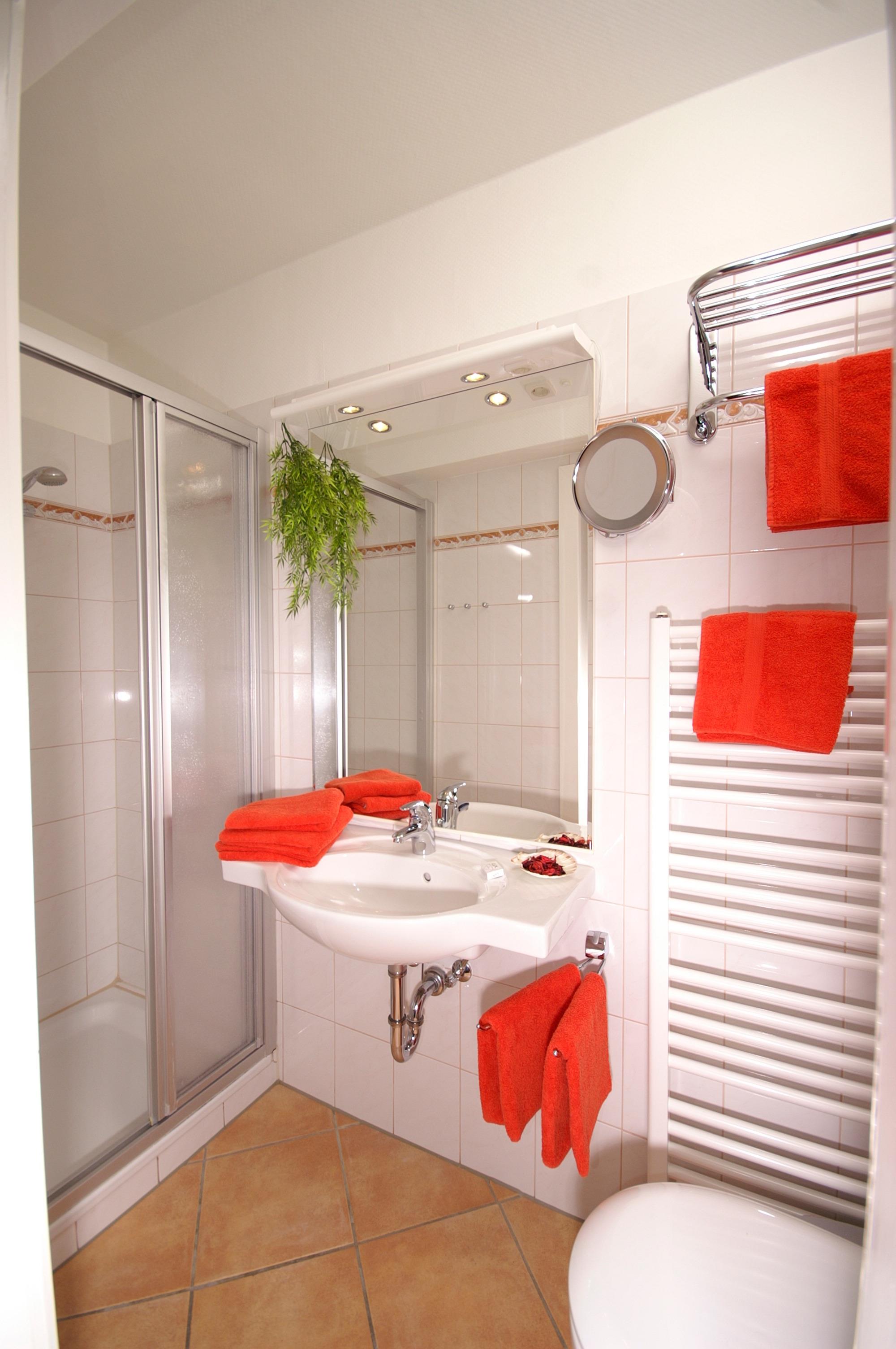 Das hellgeflieste Bad ist mit Duschkabine, WC & Waschbecken ausgestattet.