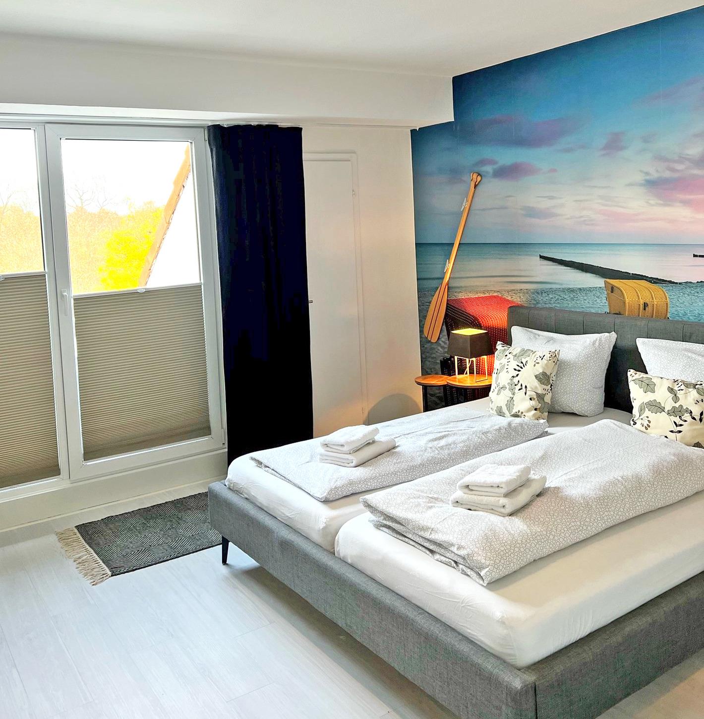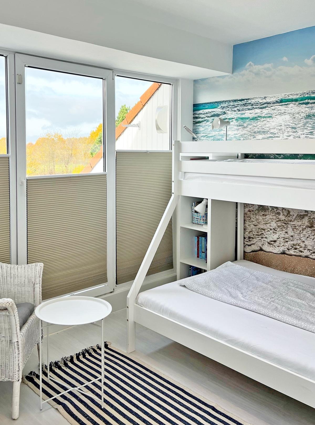 Beide Schlafzimmer verfügen über Loggien mit Sitzmöglichkeiten. Das kleinere Schlafzimmer ist mit einem Hochbett (140x200, 90x200) ausgestattet. Im größeren Schlafzimmer steht ein Doppelbett (180x200). Die Schlafzimmer sind mit Plissees ausgestattet. Vom großen Schlafzimmer gelangen Sie in das Badezimmer mit WC und Waschtisch. Vom Flur abgehend befindet sich das Duschbad.