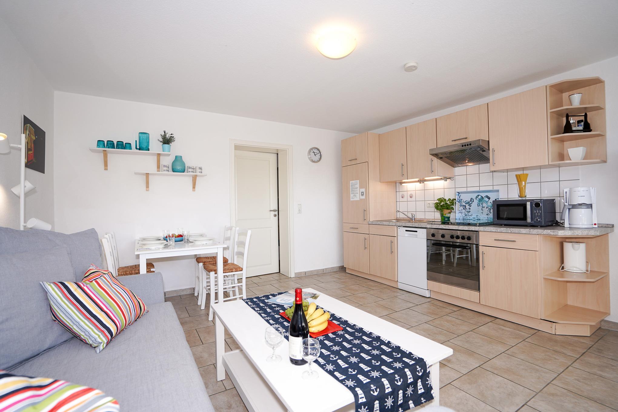 Die modern ausgestattete Wohnung mit einer Größe von ca. 40 qm ist für bis zu 4 Personen eingerichtet. Im Wohnzimmer mit SAT-TV befinden sich eine Schlafcouch sowie ein Esstisch mit Stühlen. In der Küchenzeile finden Sie neben Backofen und den üblichen Elektrogeräten auch eine Spülmaschine und Mikrowelle vor. Neben dem Schlafzimmer mit Doppelbett und Kleiderschrank steht Ihnen ein Duschbad mit WC zur Verfügung.