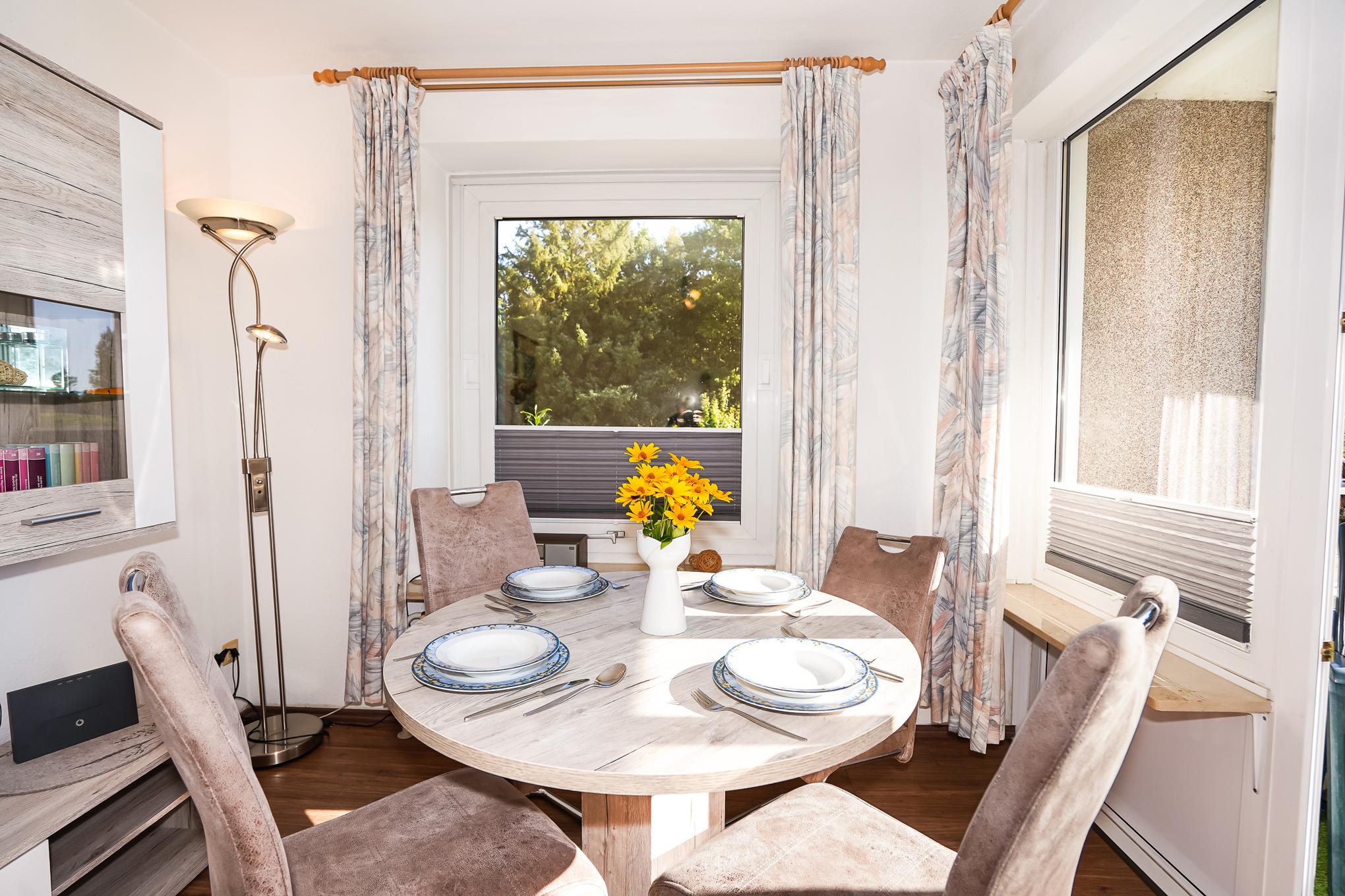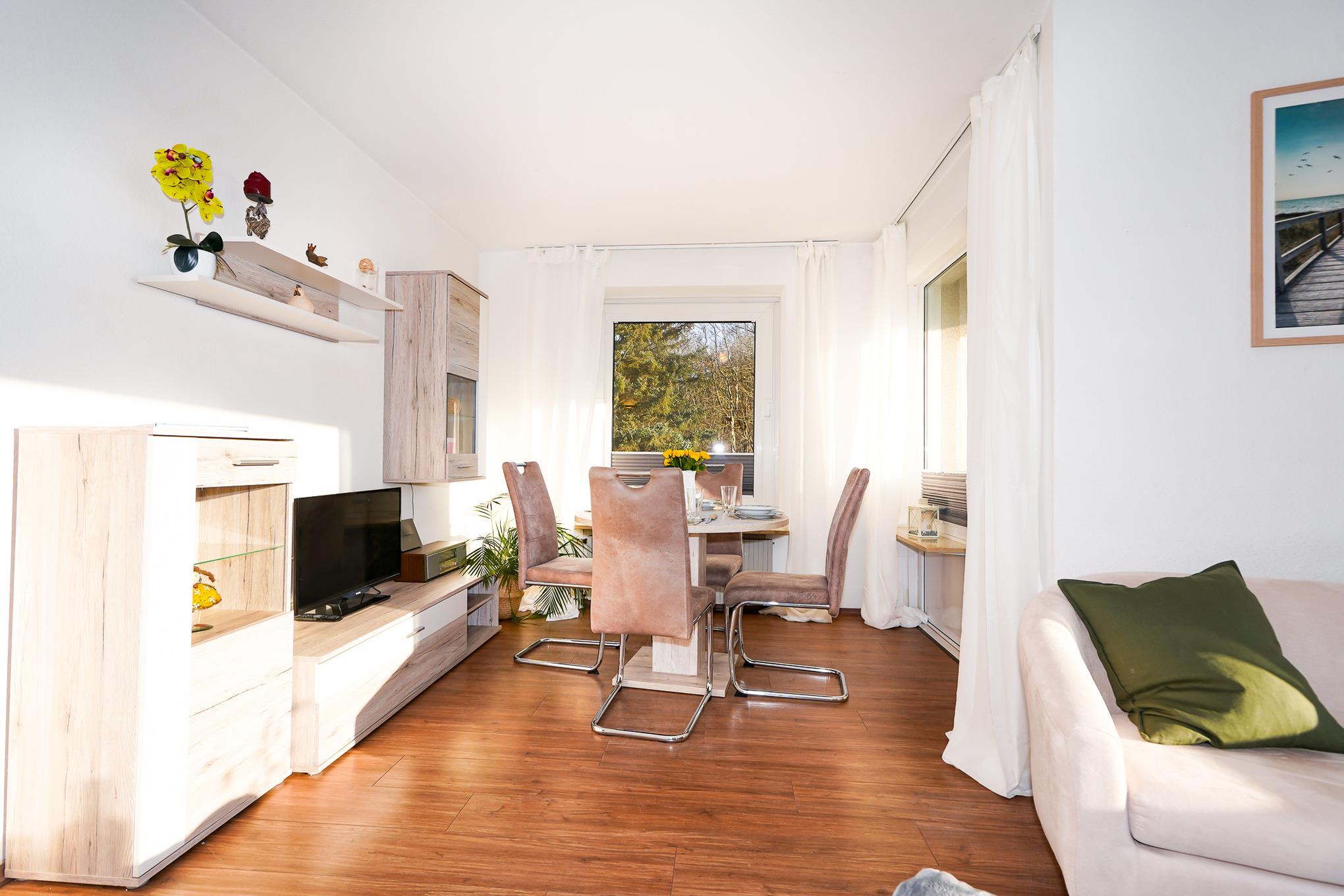 Das gemütlich eingerichtete Wohnzimmer bietet Ihnen ein Sofa, eine Schlafcouch (160 x 120 cm) und einen Esstisch mit 4 Stühlen. Ein SAT-Flat-TV und kostenloses W-LAN laden zu entspannten Abenden ein. Vom Wohnzimmer gelangen Sie direkt auf den Balkon.