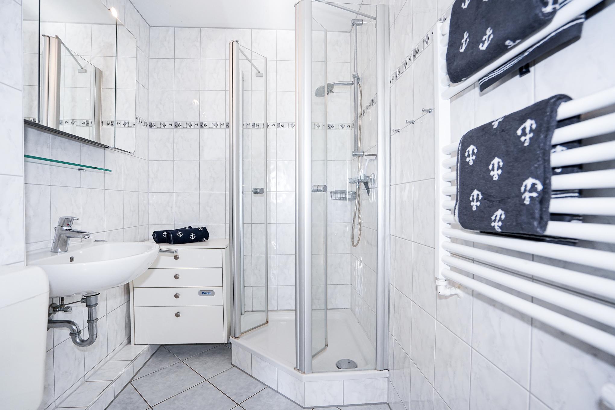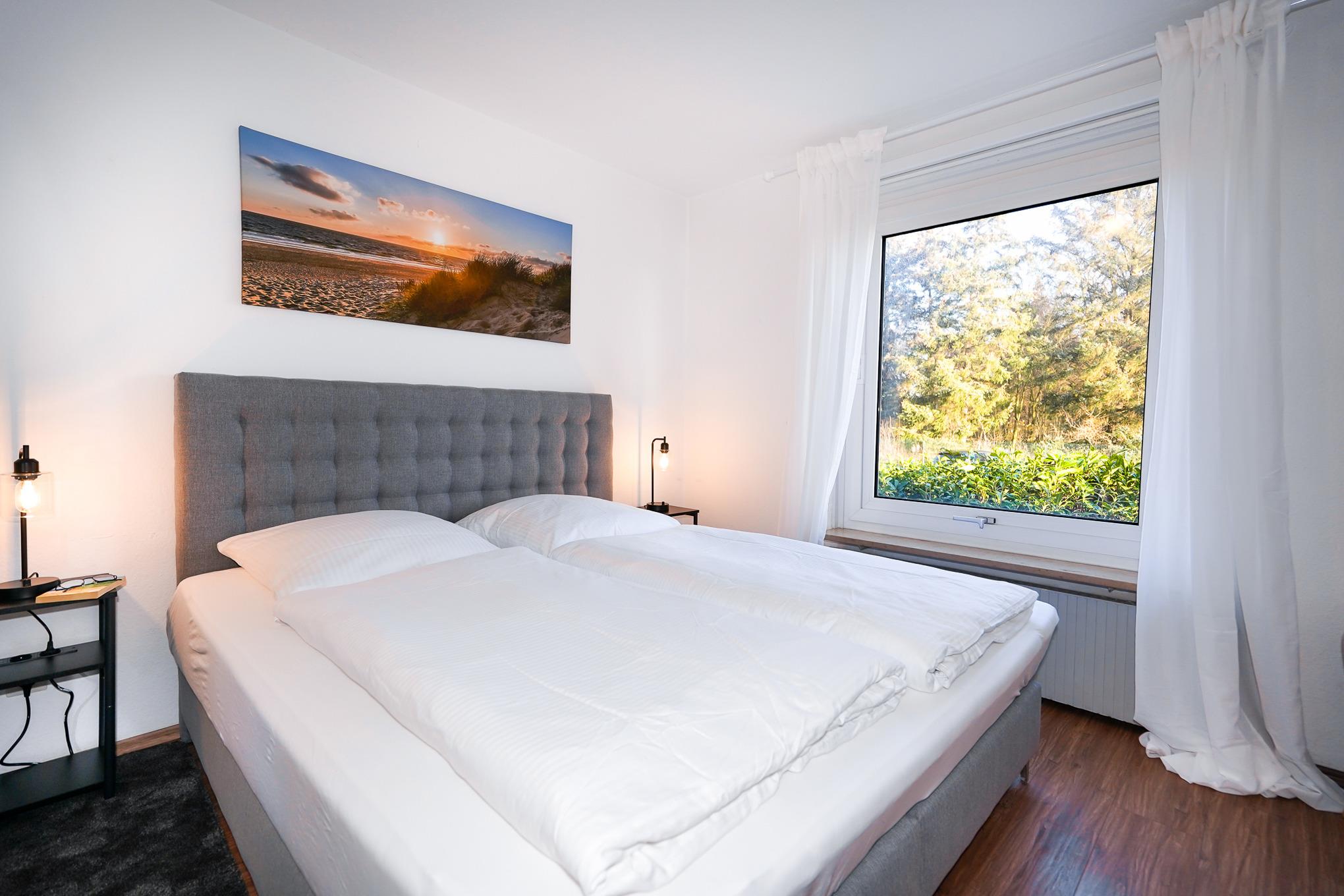 Das Badezimmer verfügt über WC, Waschbecken, Eckdusche, Handtuchheizkörper und viele Ablagemöglichkeiten. Das Schlafzimmer bietet Ihnen ein Boxspringbett (180 x 200 cm), Schubladenschränke und zwei Nachttische.