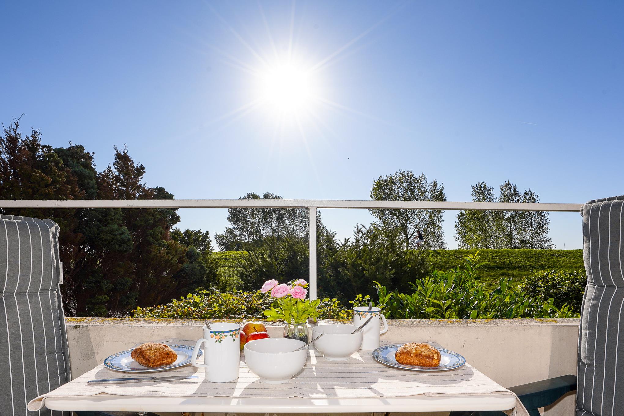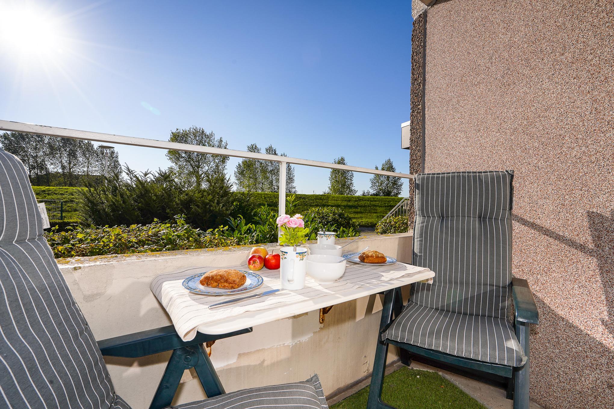 Gemütliche Ferienwohnung mit Balkon und direktem Deichzugang in Grömitz, ideal für entspannte Stunden am Ostseestrand.
