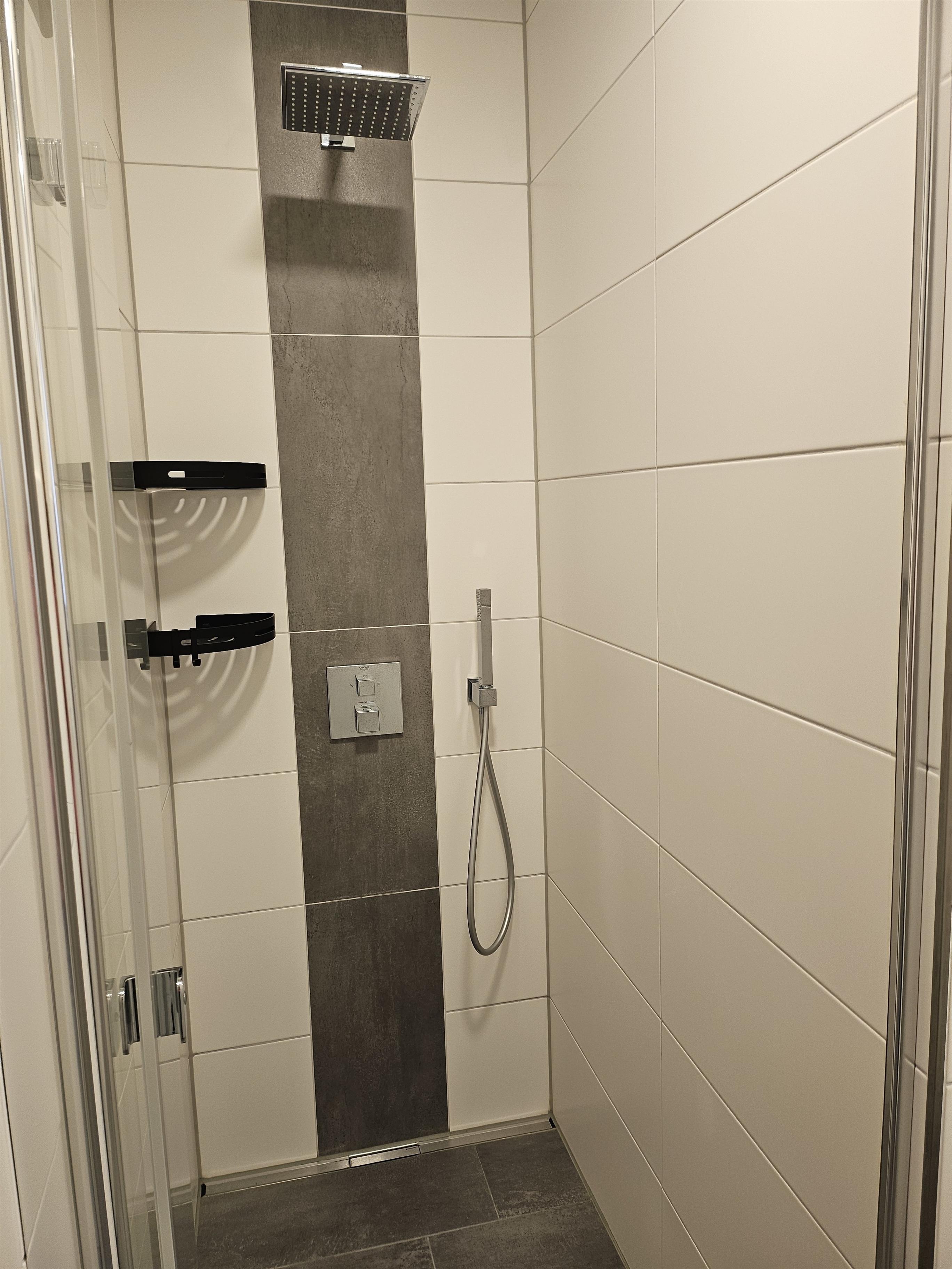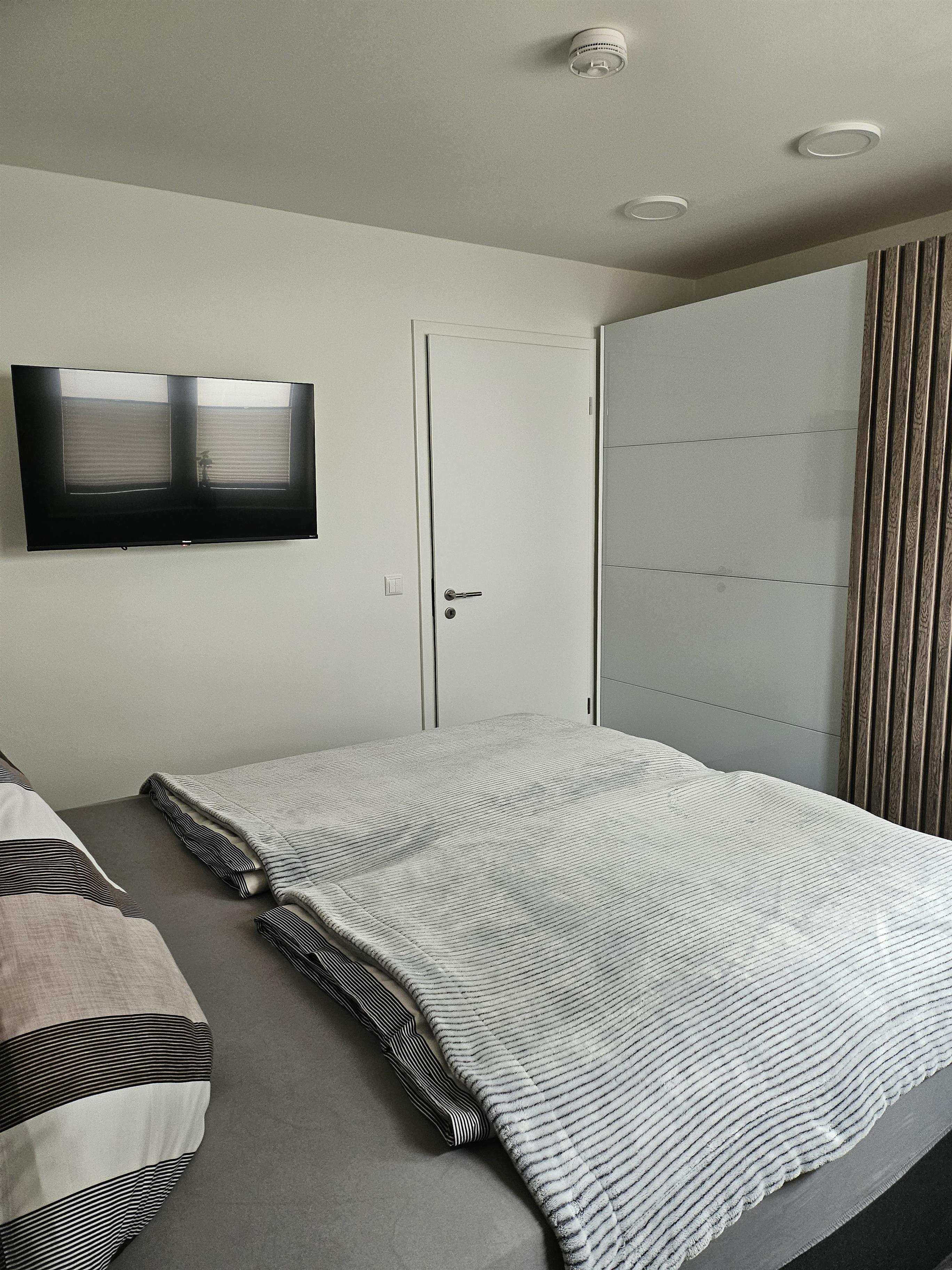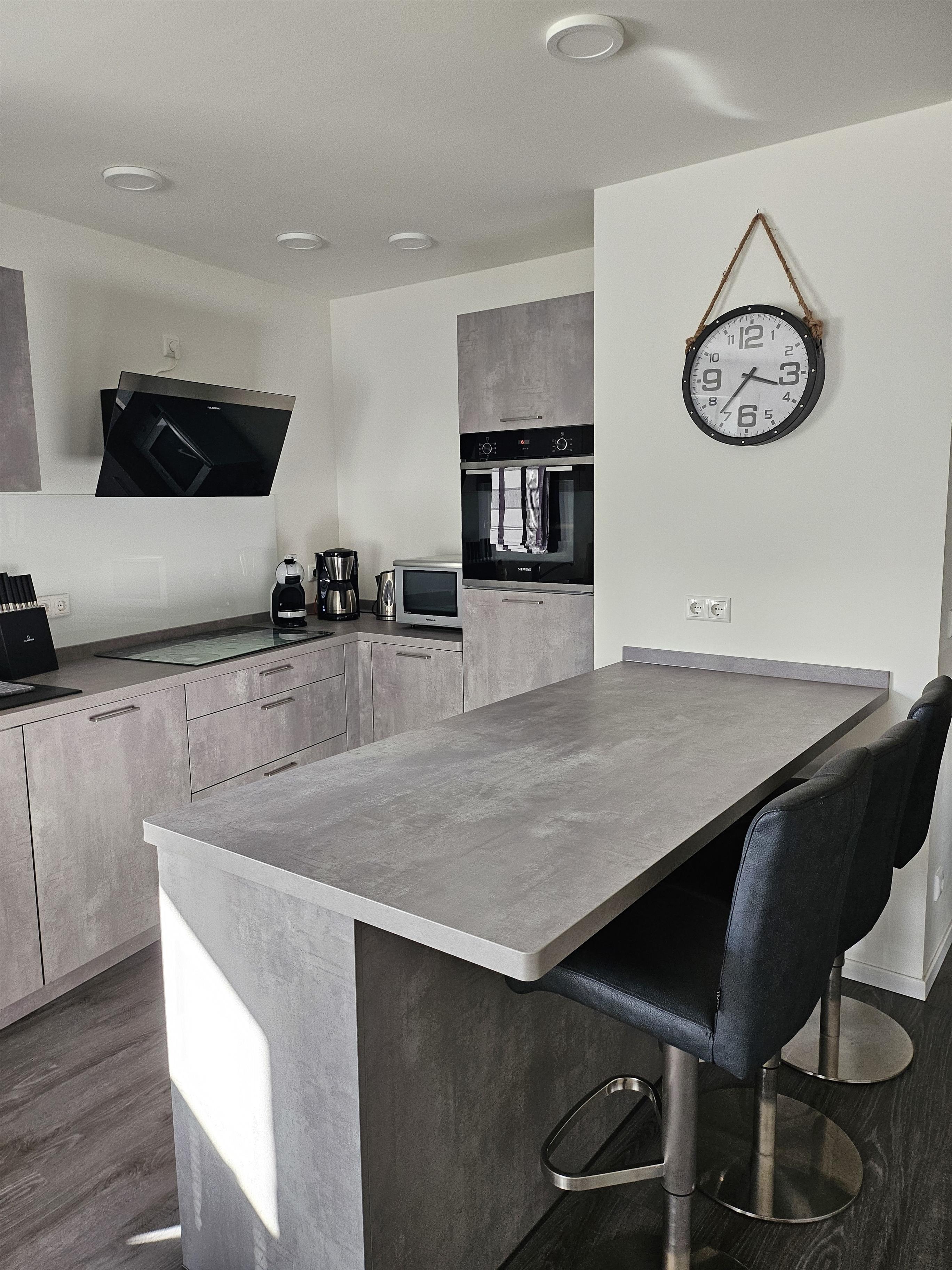 Unsere hochwertig eingerichtete Ferienwohnung besteht aus einem Wohnbereich mit angrenzender offener, komplett ausgestatteter Küche, einem Tageslichtbad mit ebenerdiger Dusche und einem Schlafzimmer mit Boxspringbett (180x200cm).