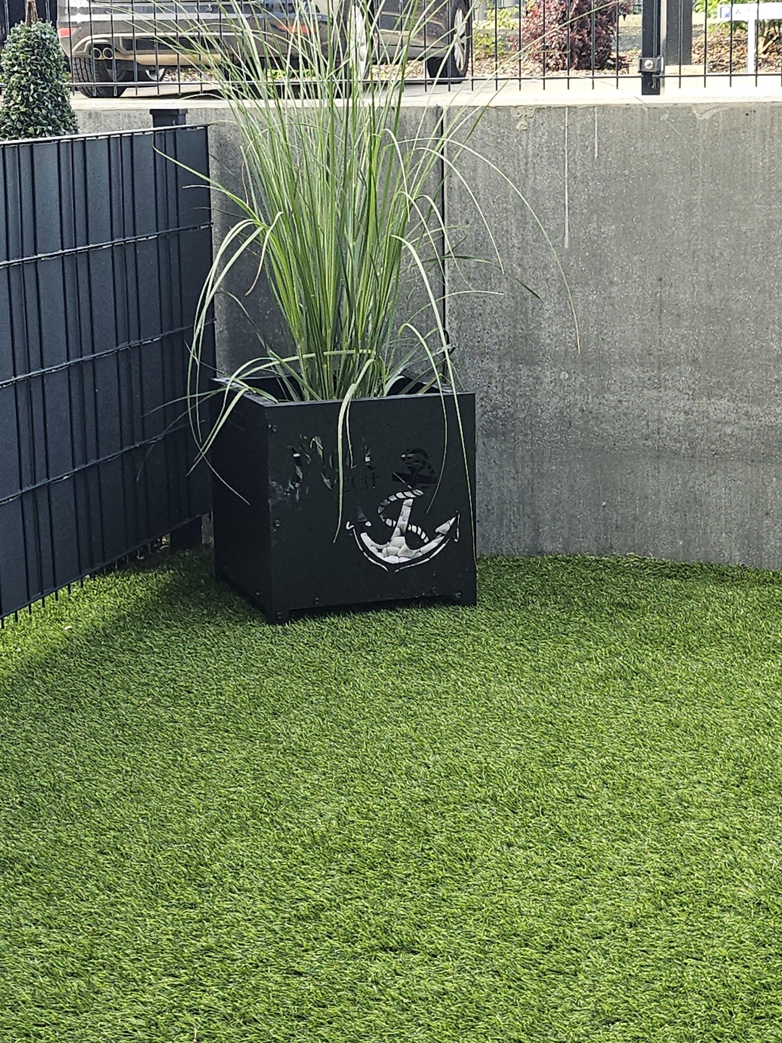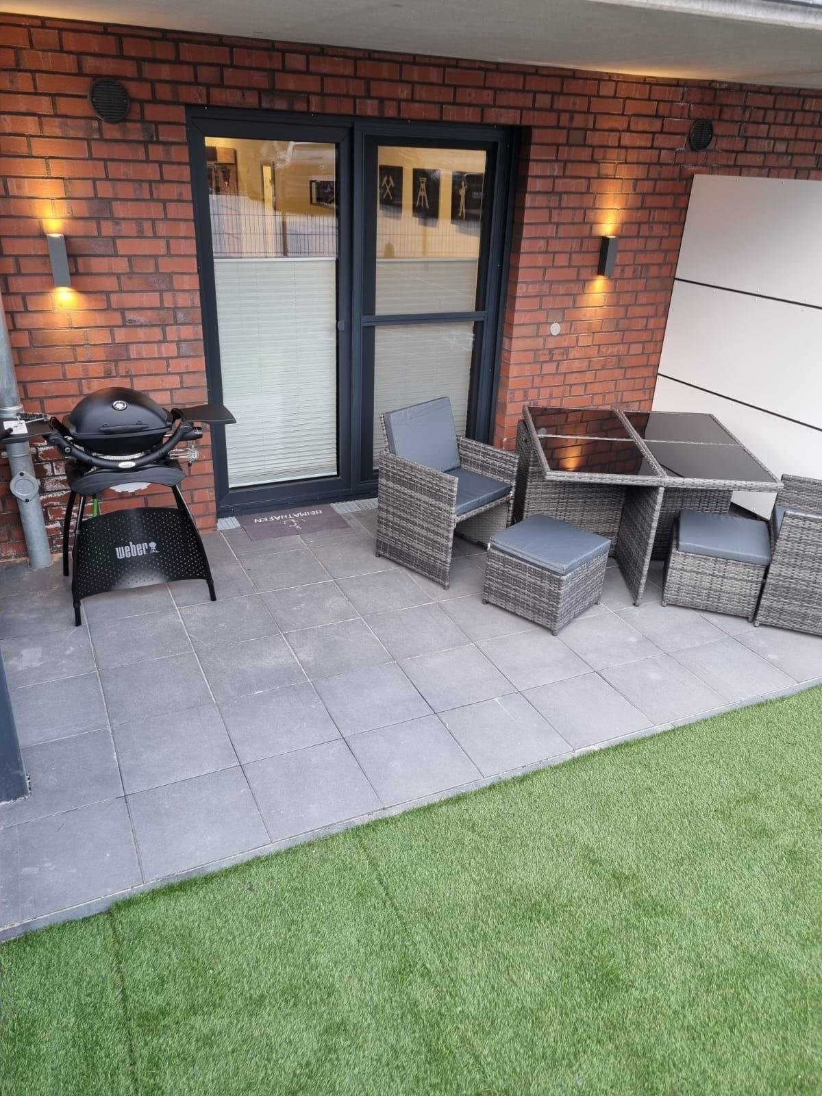 Der kleine Garten mit Terrasse (komplett eingezäunt circa 80cm hoch zur Nachbarterrasse und mit Kunstrasen) lädt zum gemütlichen Sitzen ein. Ein Webergrill steht kostenfrei zur Verfügung.