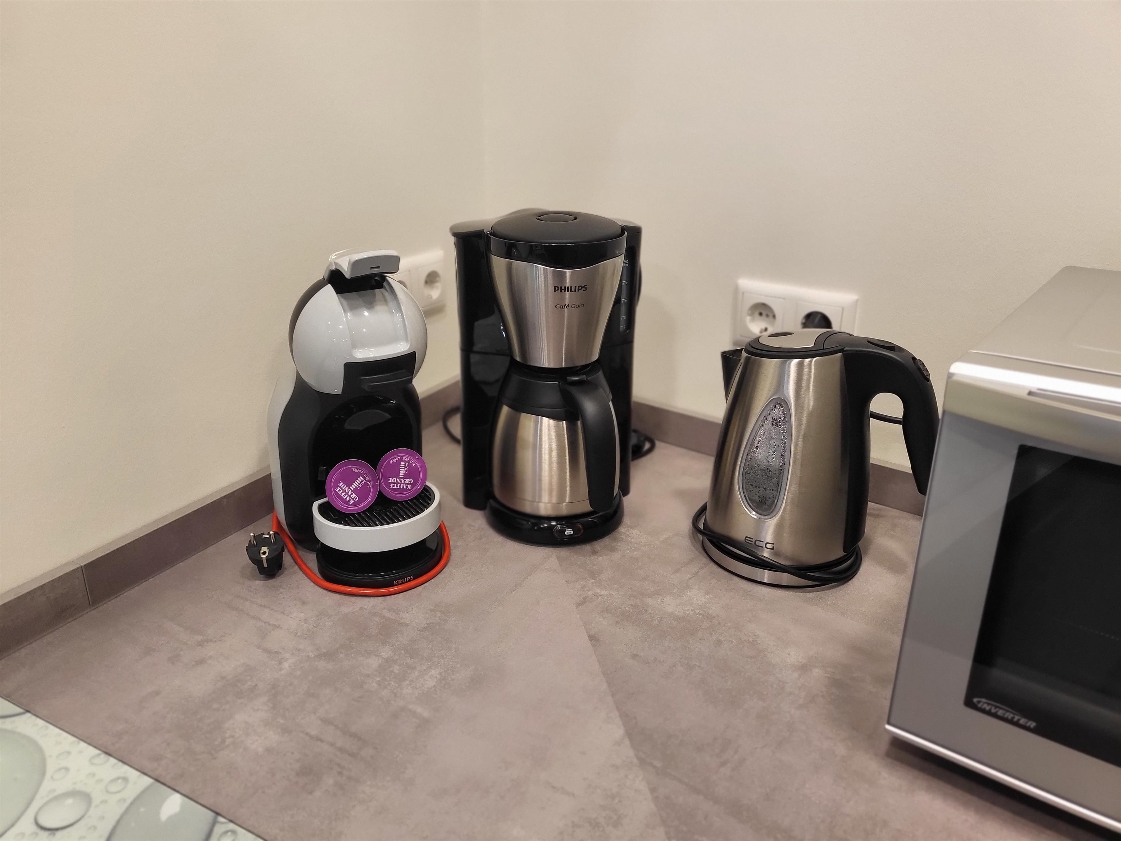 - Toaster, Sandwich-Toaster, Eierkocher, Dolce Gusto, Filter-Kaffeemaschine (Filter werden gestellt), Waffeleisen, jede Menge Töpfe, Pfannen und Geschirr, Tupperware