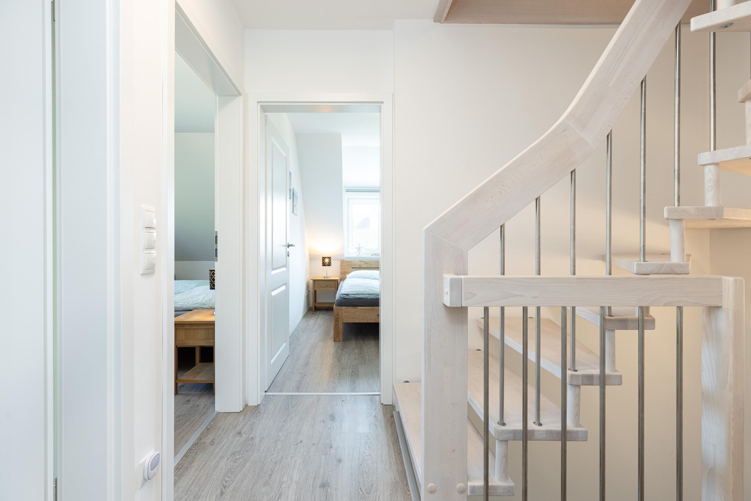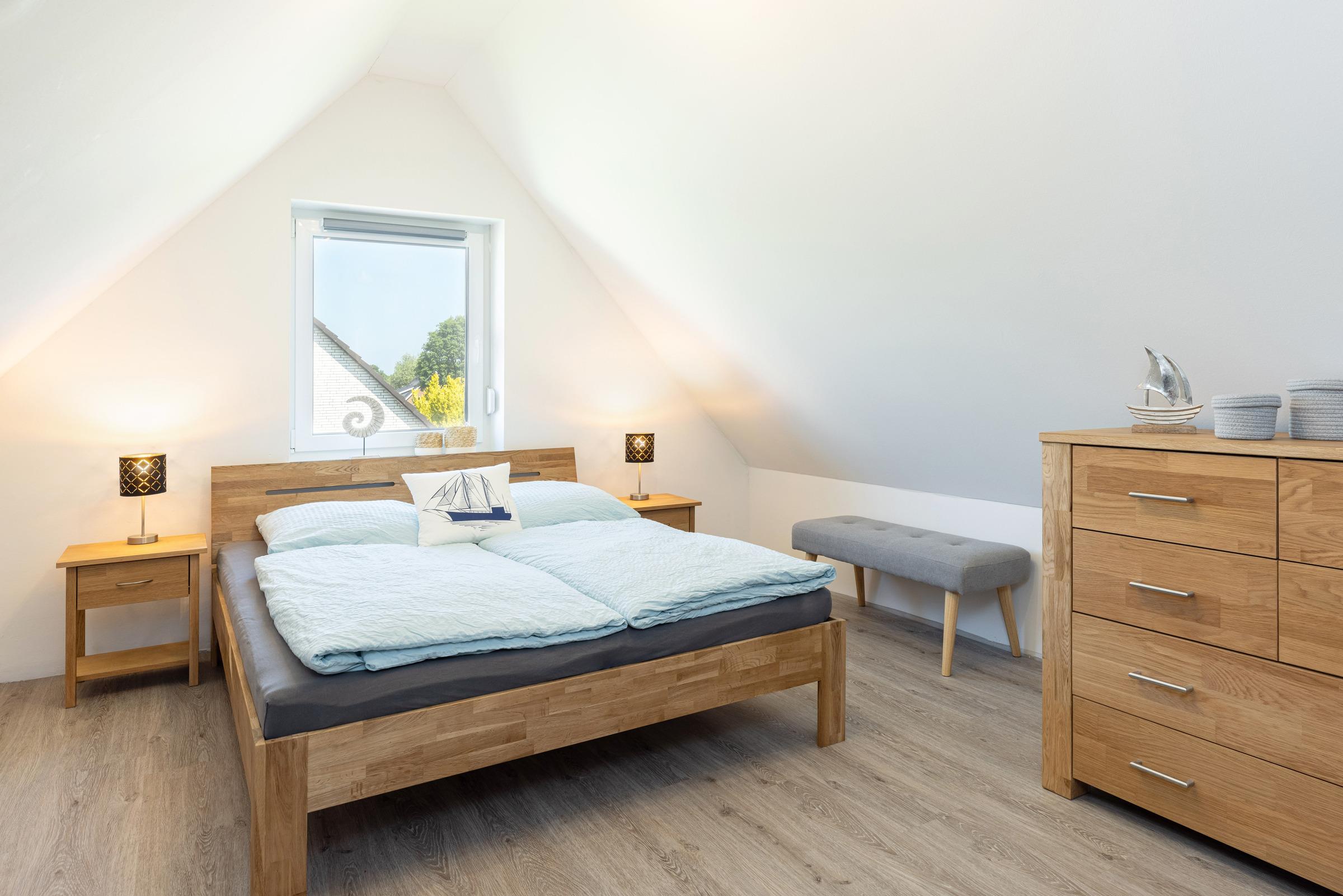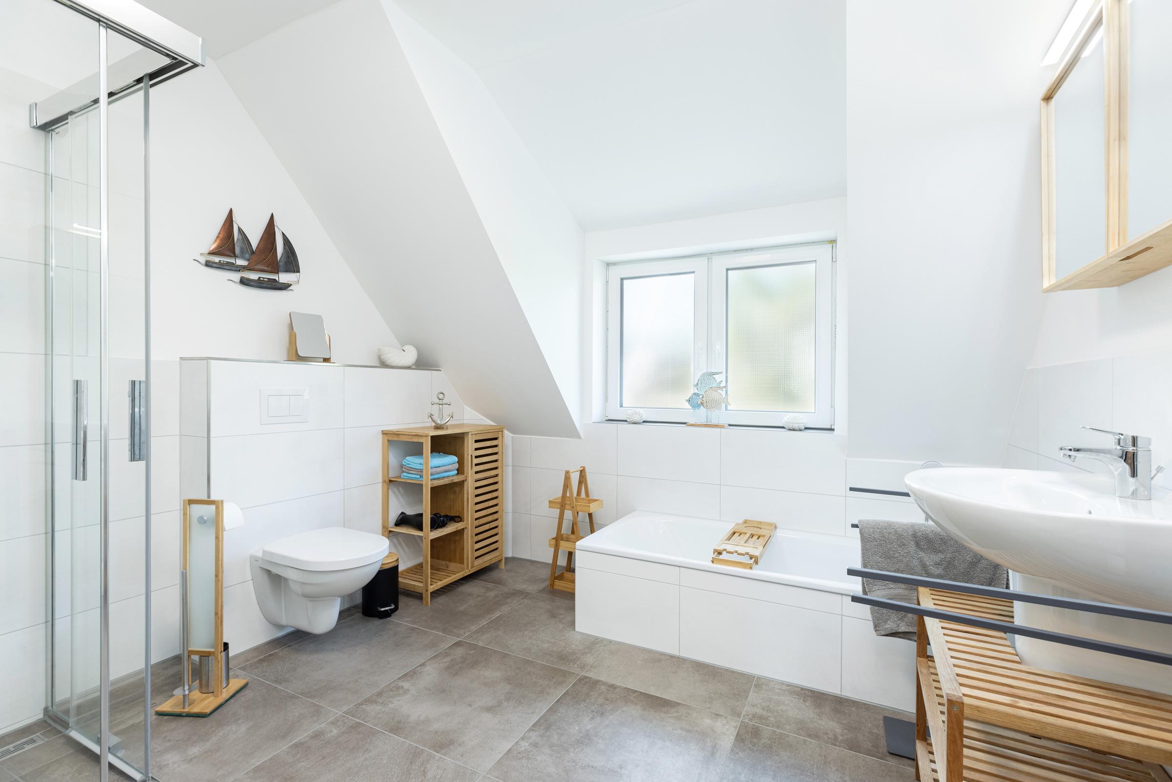Im Obergeschoss erwarten dich drei gemütliche Schlafzimmer (1 Doppelbett: 2x 90x200cm, 2 Doppelbetten: 2x 80x200cm) und ein zweites Bad mit Dusche und Badewanne. Das Dachgeschoss bietet einen zusätzlichen Schlafbereich (1 Doppelbett: 2x 80x200cm).
