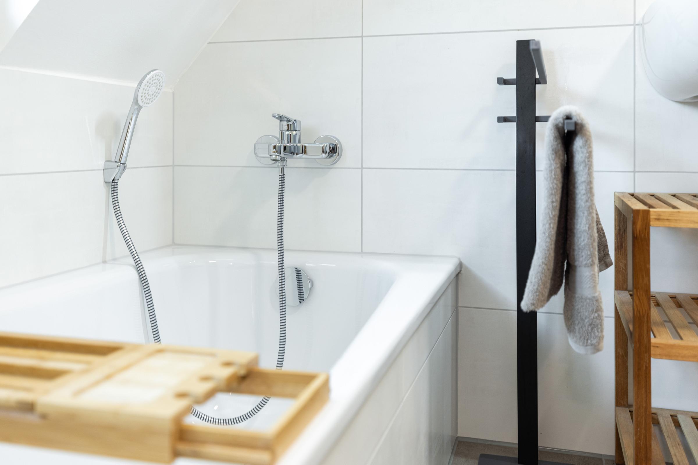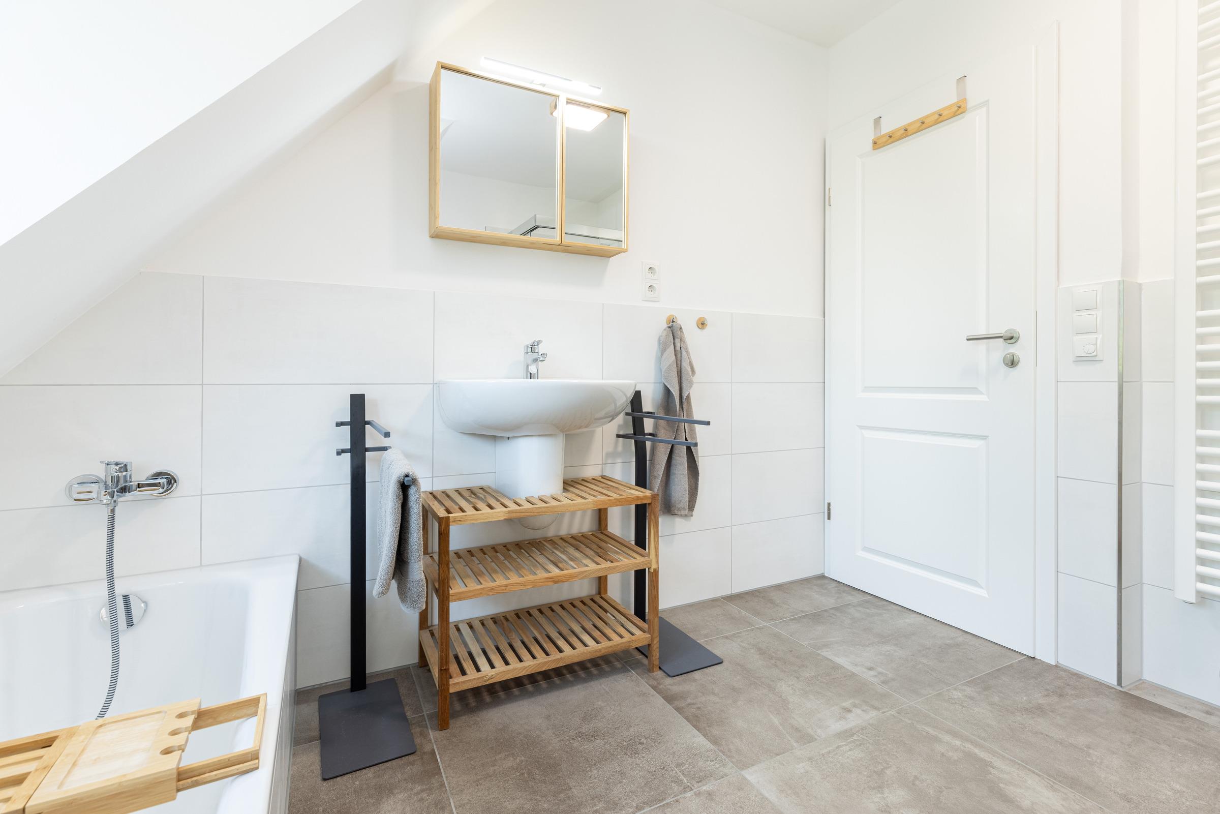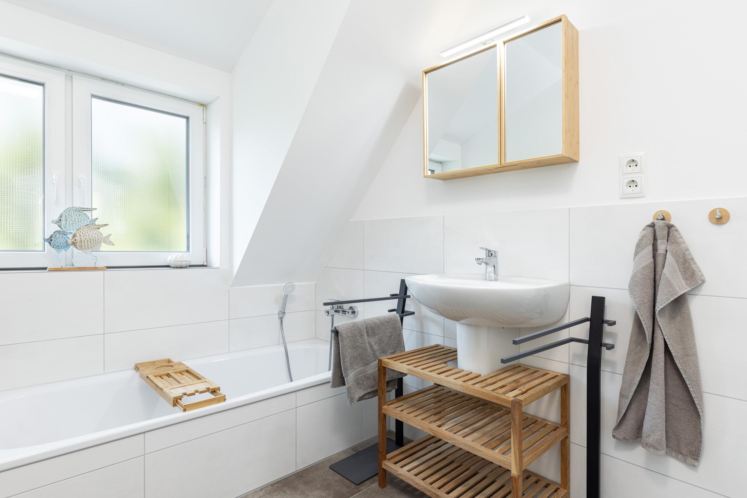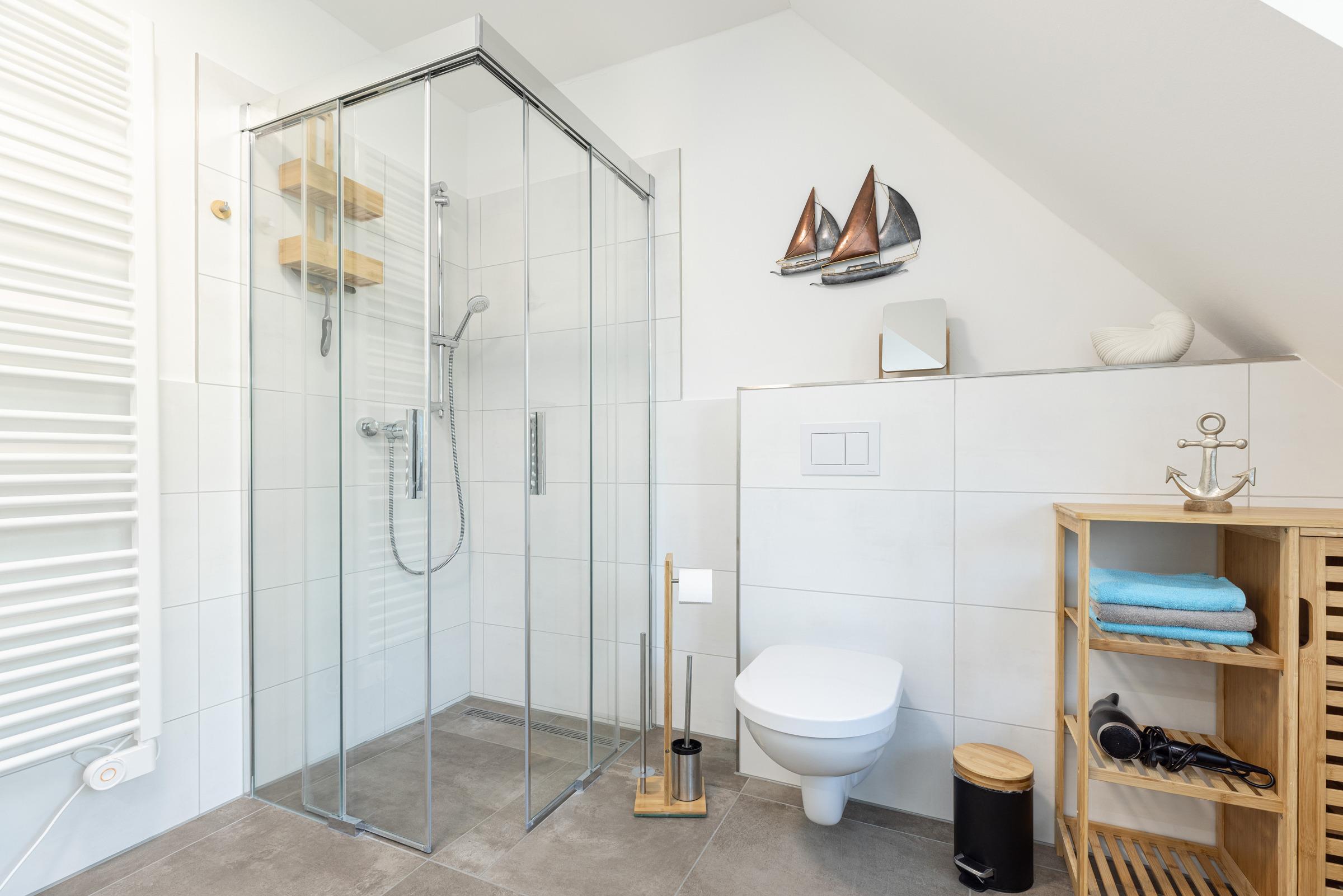 Im Obergeschoss erwarten dich drei gemütliche Schlafzimmer (1 Doppelbett: 2x 90x200cm, 2 Doppelbetten: 2x 80x200cm) und ein zweites Bad mit Dusche und Badewanne. Das Dachgeschoss bietet einen zusätzlichen Schlafbereich (1 Doppelbett: 2x 80x200cm).