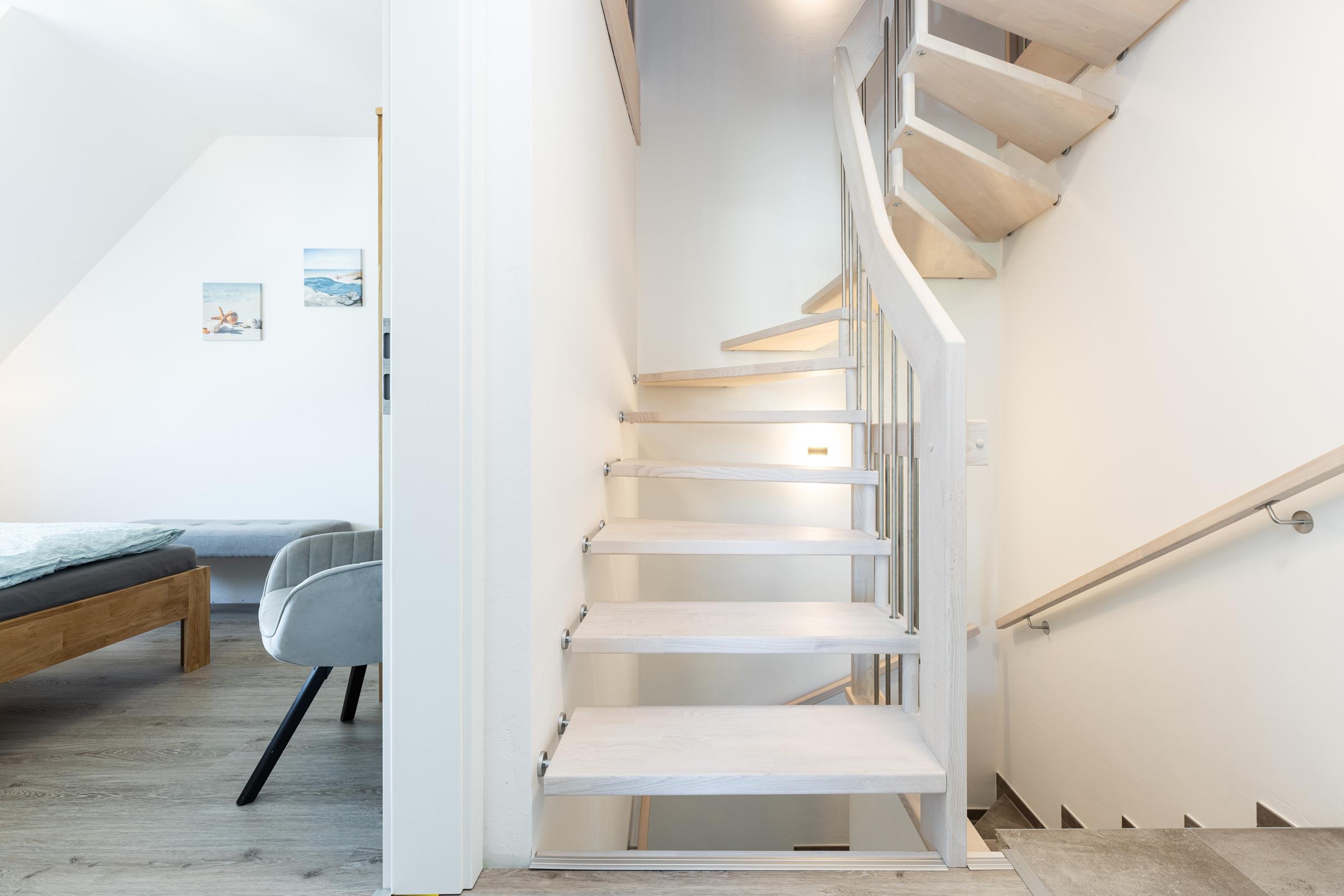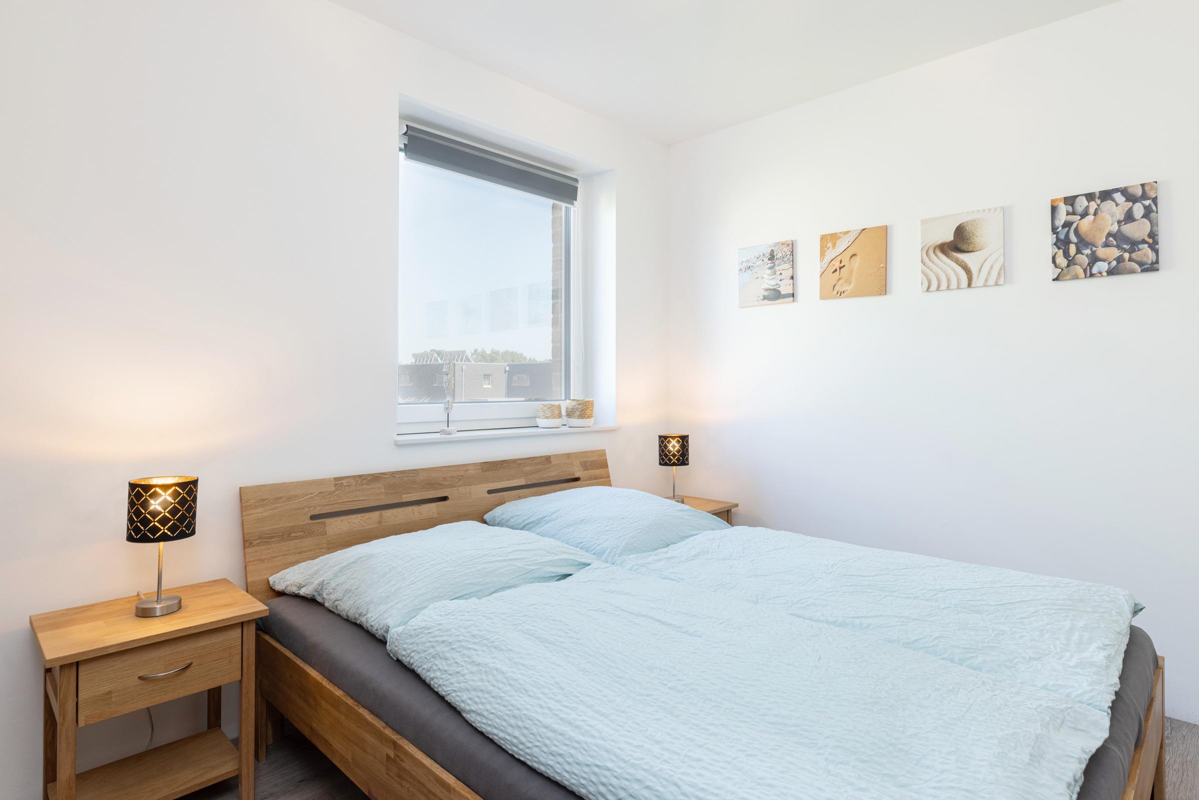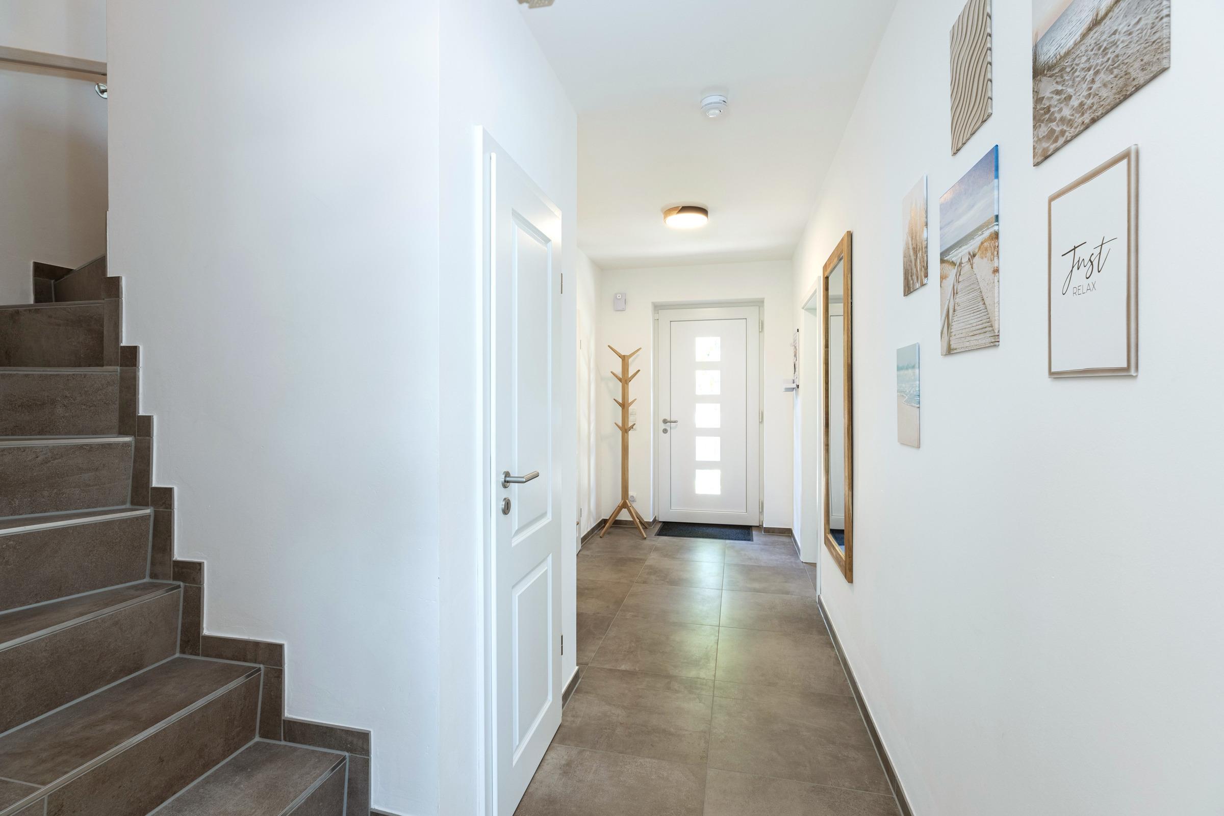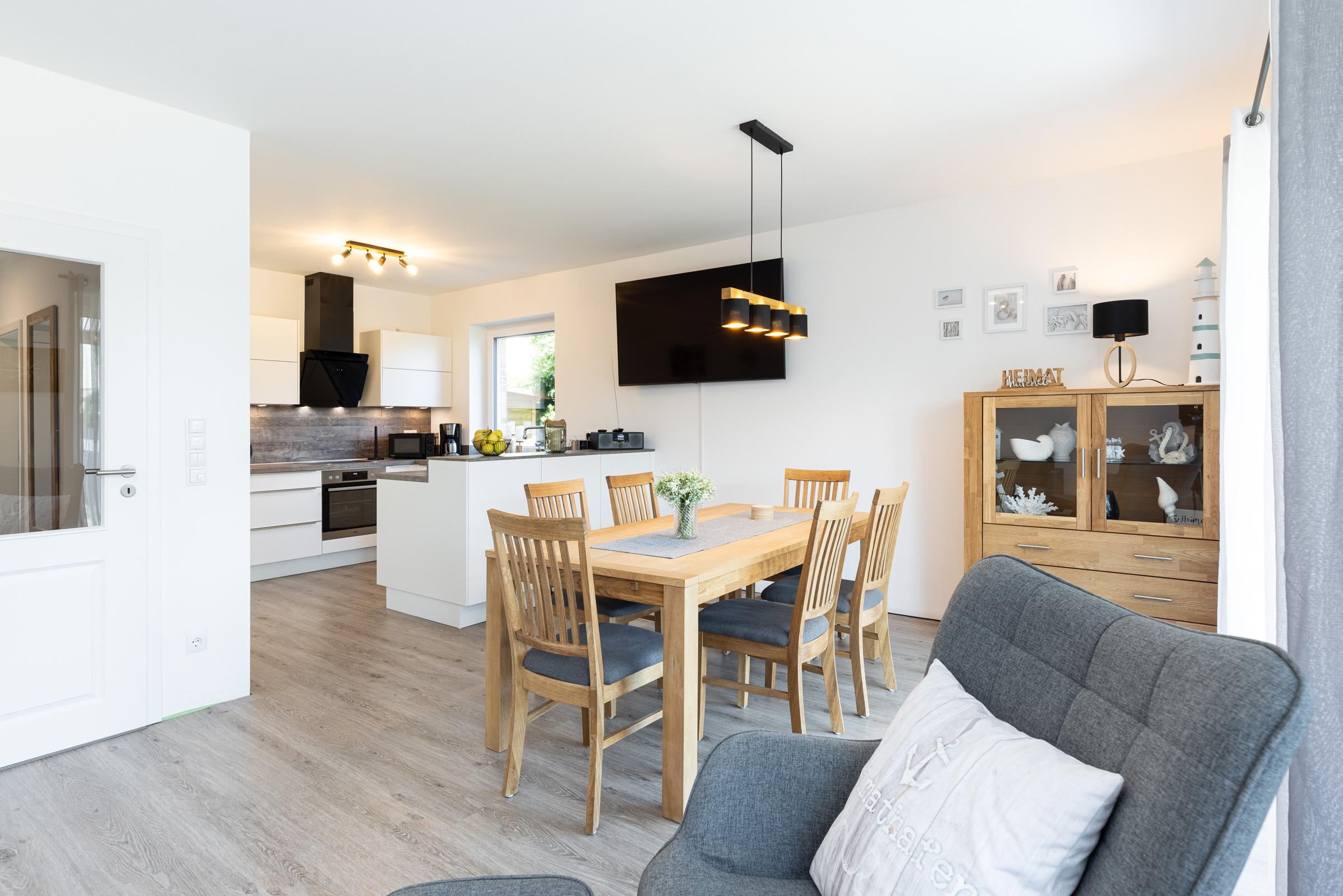 Dieses 5-Zimmer-Ferienhaus bietet Platz für bis zu 6 Personen (plus Kleinkind) auf 126 m². Im Erdgeschoss findest du einen offenen Wohnbereich mit Smart-TV, eine voll ausgestattete offene Komfort-Küche, einen großzügigen Essbereich und eine 20 m² große Südterrasse mit Grillmöglichkeit mit Markise und Lounge-Ecke mit Sonnenschirm. Ein modernes Tageslicht-Bad mit bodengleicher Dusche rundet das Erdgeschoss ab. Im Hauswirtschaftsraum befindet sich ein Waschtrockner, damit die Urlaubsgarderobe immer frisch bleibt.