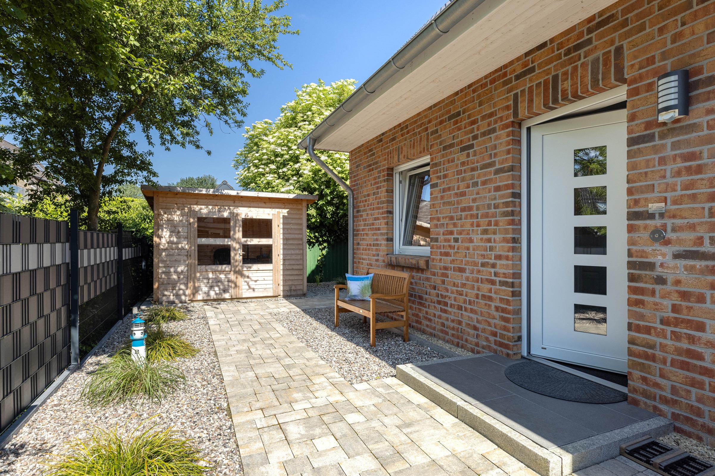 Für zwei Fahrzeuge steht eine großzügige Parkfläche direkt vor dem Haus bereit, und Fahrräder können in der abschließbaren Holzhütte sicher untergebracht werden. Hier steht auch ein Bollerwagen für den bequemen Transport deiner Strandsachen bereit.