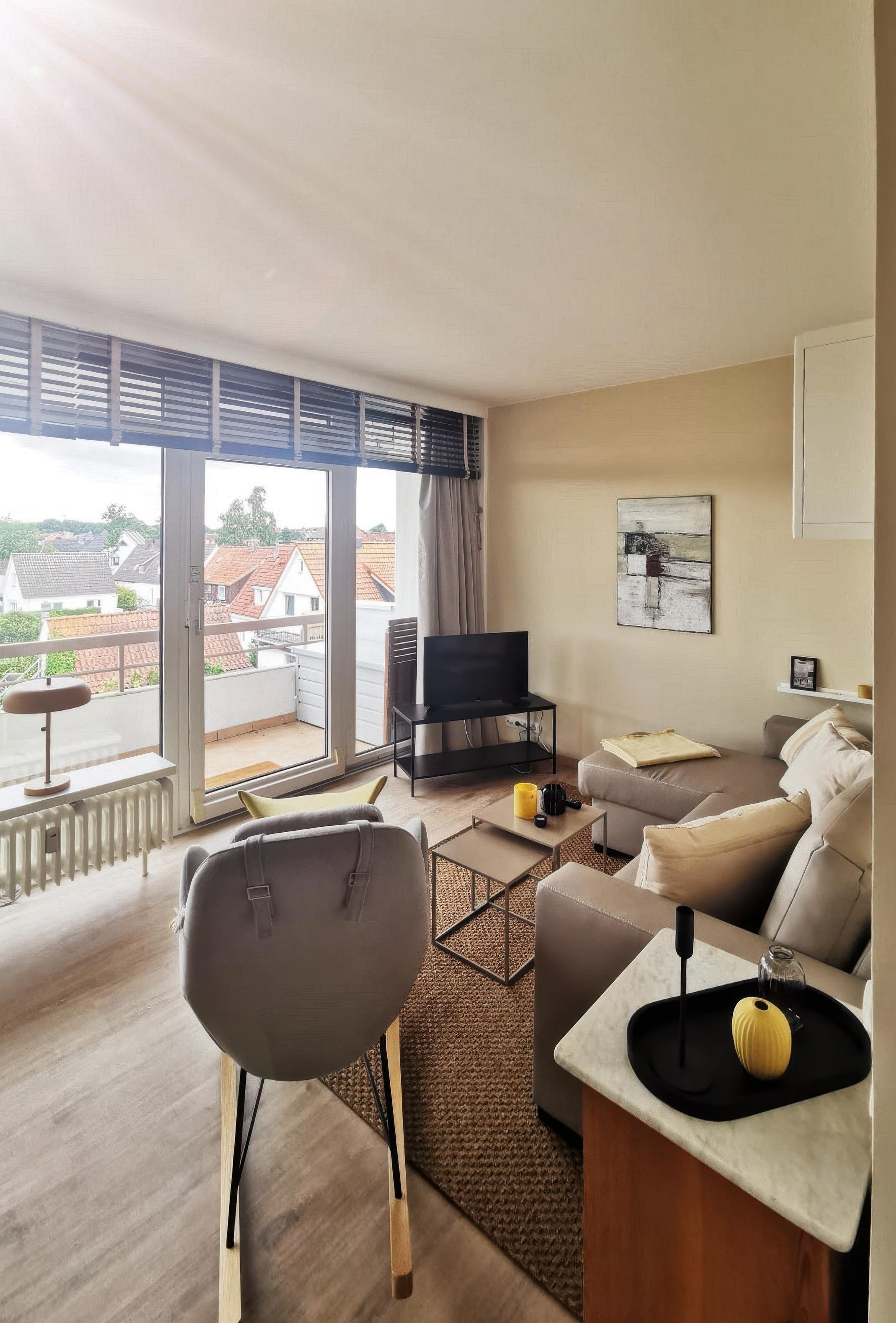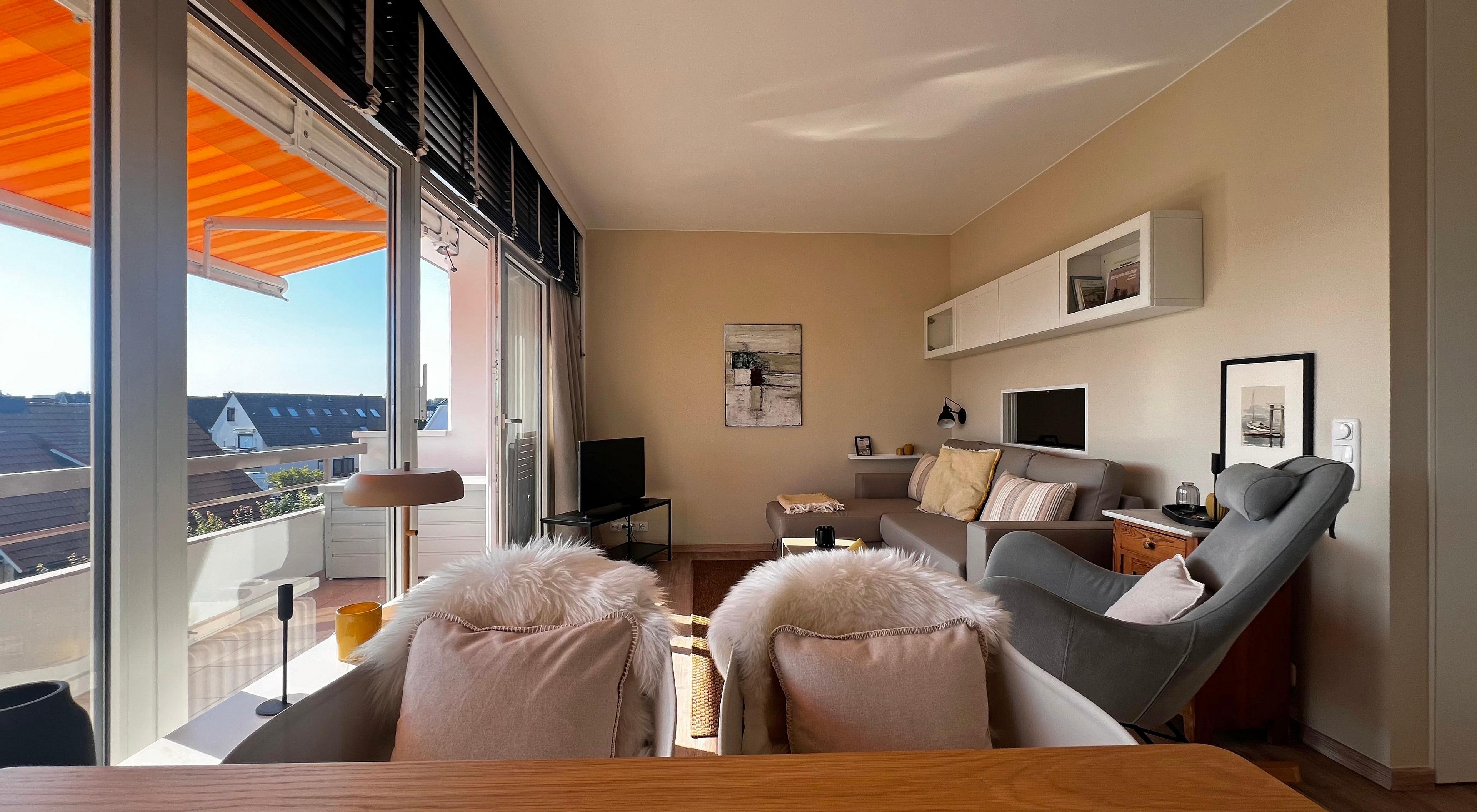 Moderne Ferienwohnung in Grömitz mit Balkon und Meerblick, ideal für einen entspannten Strandurlaub.