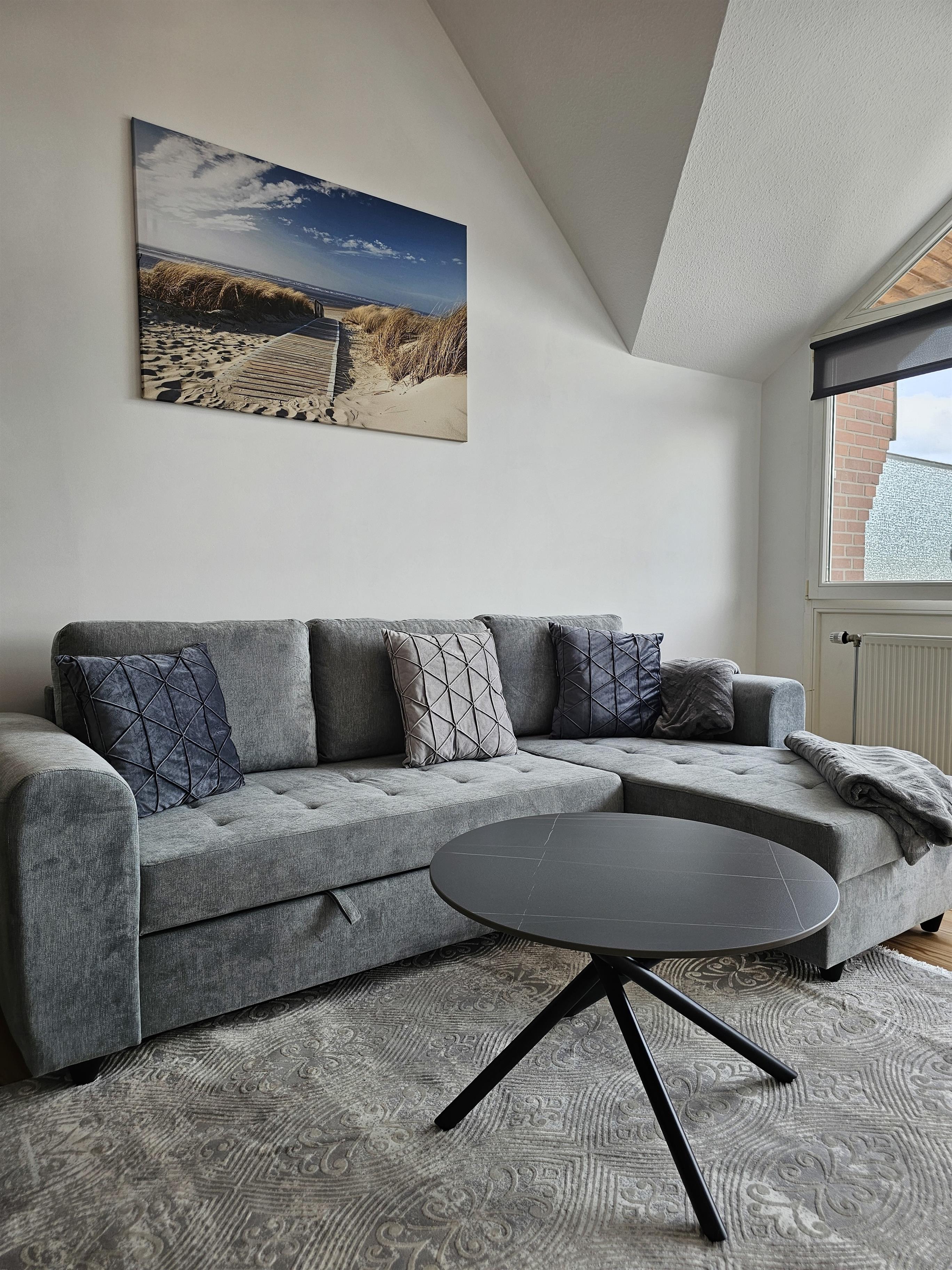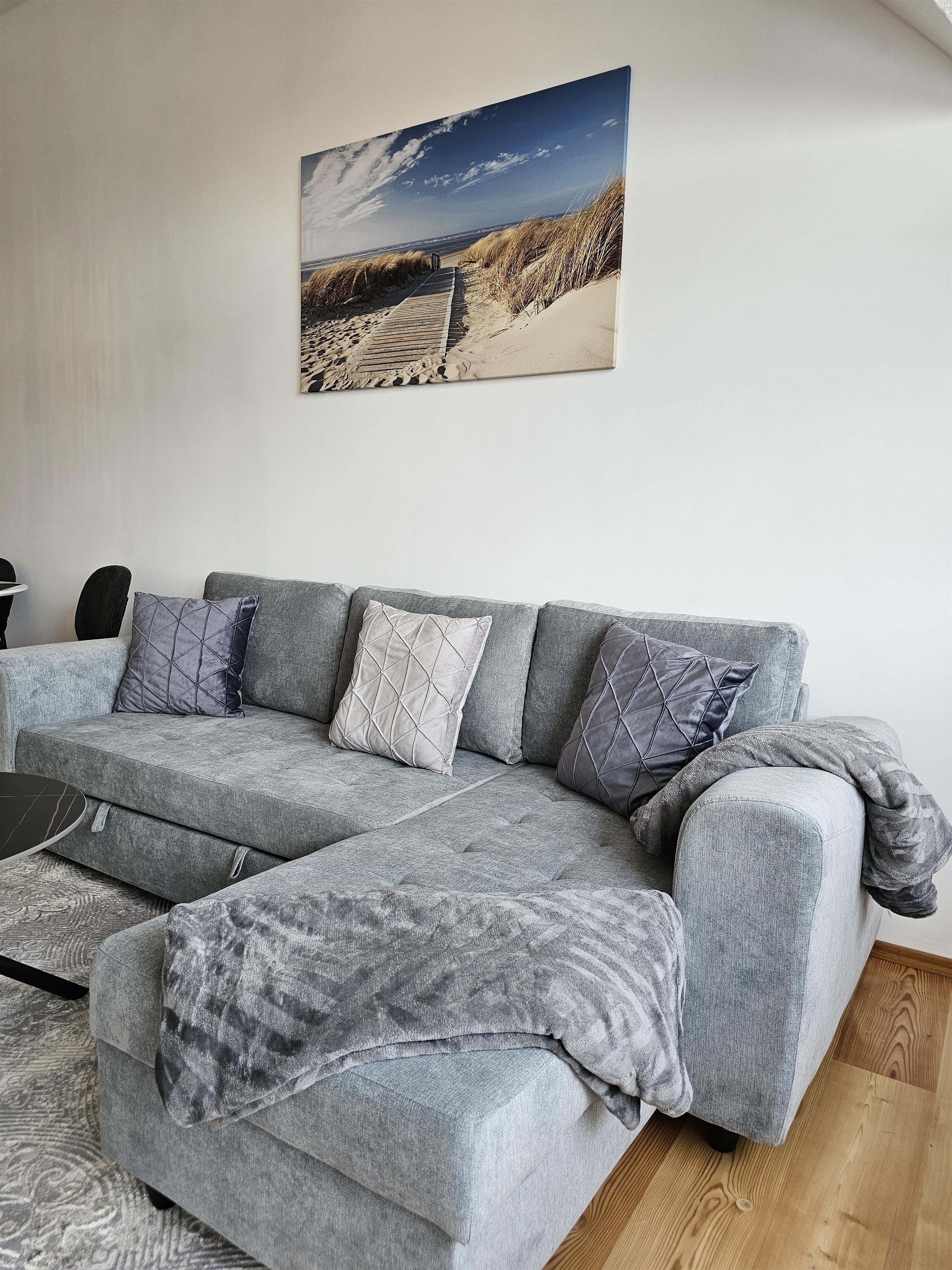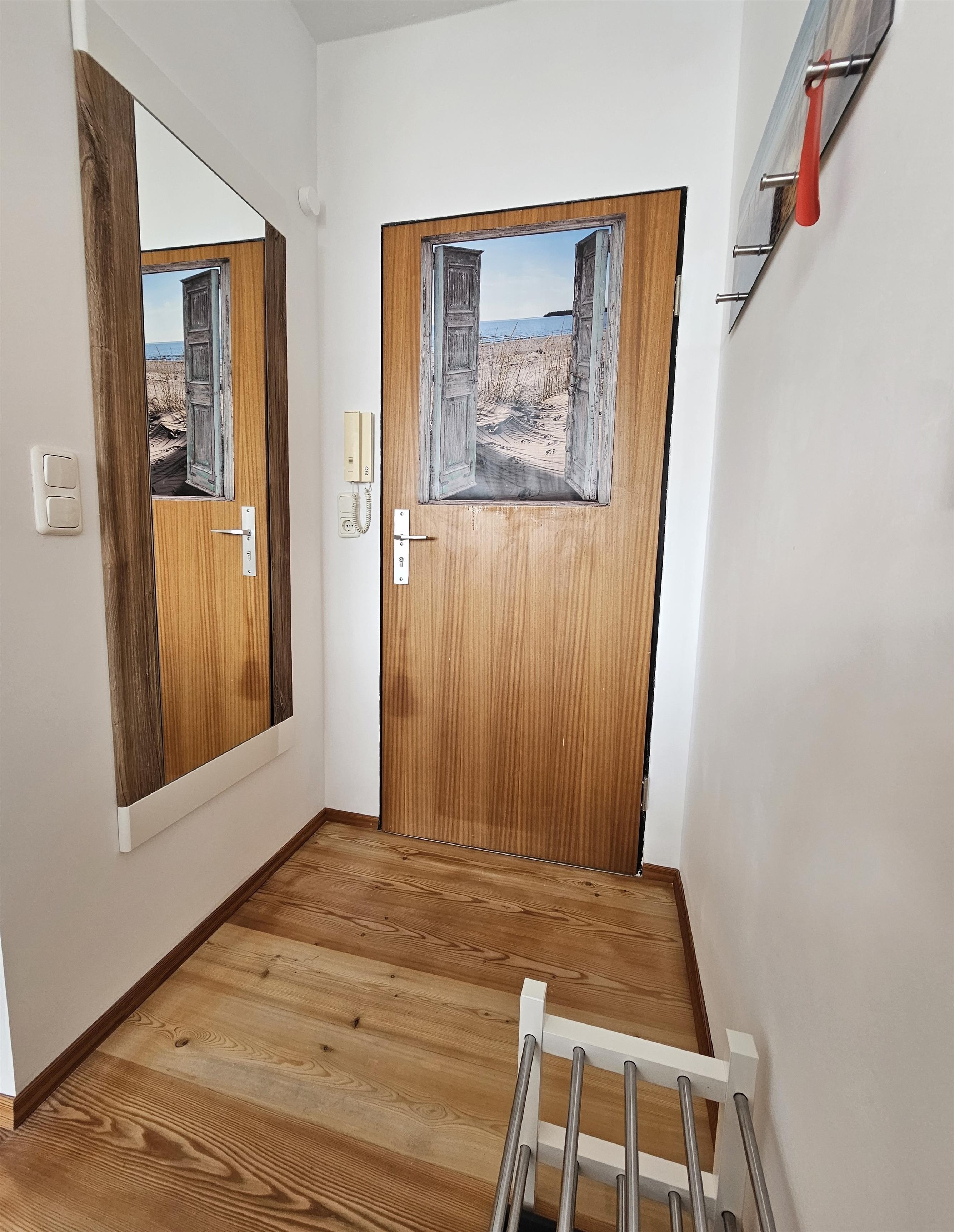 Dank der großen Fensterfront ist die Wohnung lichtdurchflutet und bietet eine warme, einladende Atmosphäre. Der Echtholzboden verleiht dem Raum eine gemütliche und hochwertige Note. Vom Balkon aus genießen Sie einen herrlichen Blick über Grömitz, auf die St. Nicolai Kirche und sogar ein wenig auf die Ostsee.
