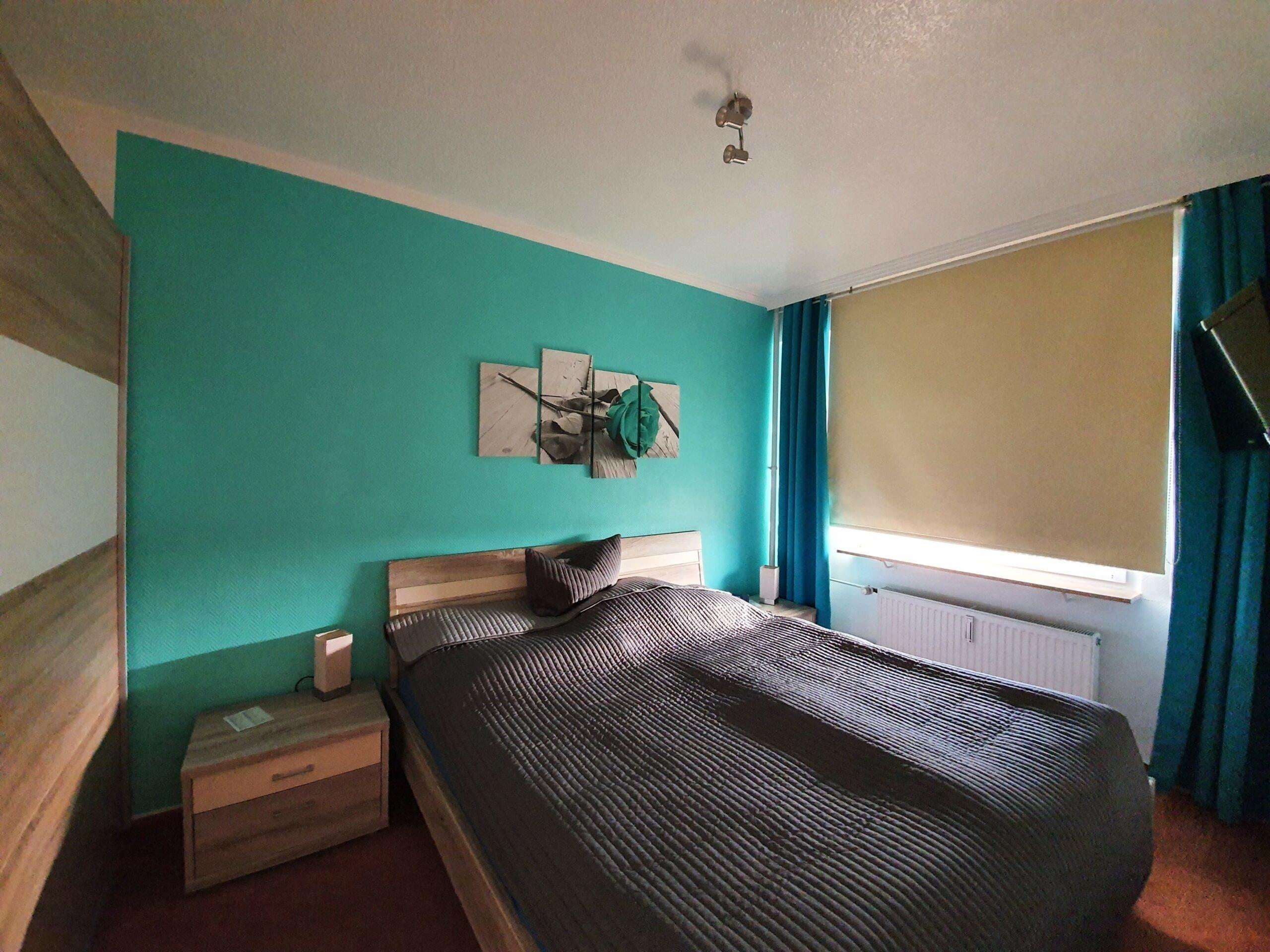 Schlafzimmer mit komfortablem Doppelbett, geräumigem Kleiderschrank mit Safe und Fernseher.