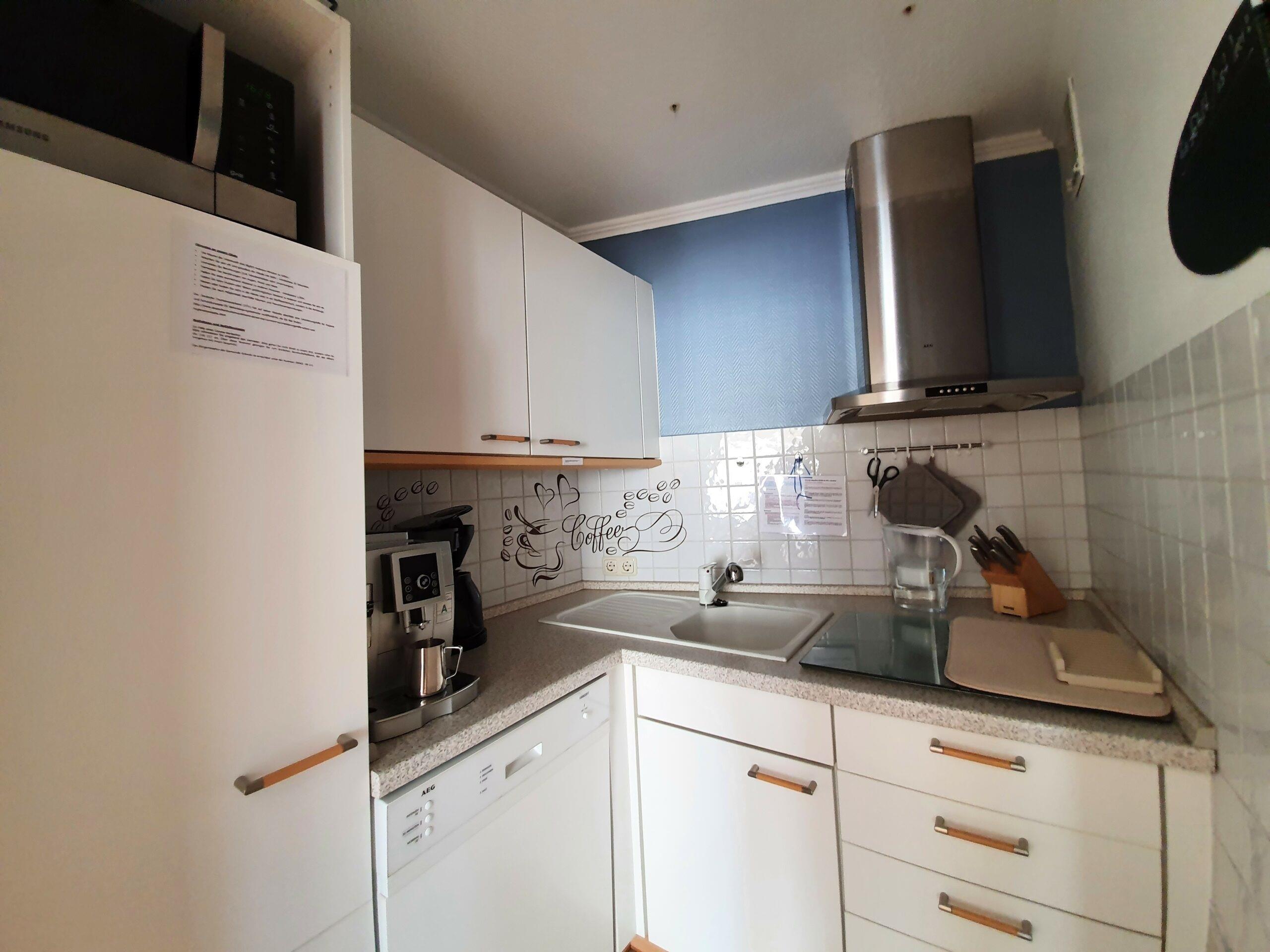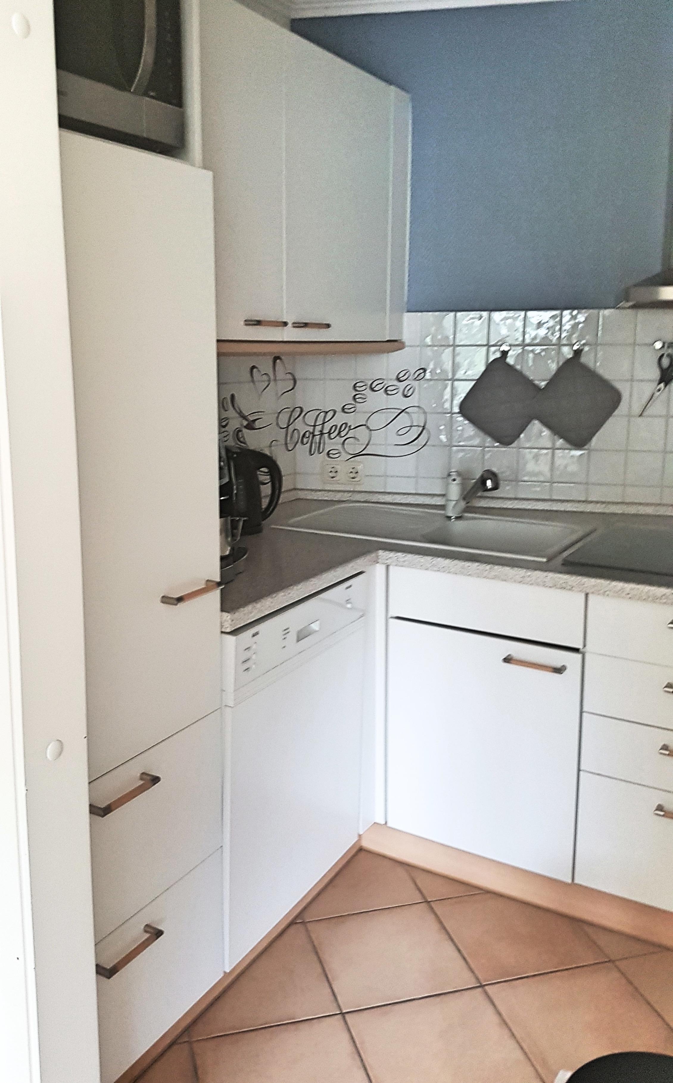 Vollausgestattete, separate Küche mit großem Geschirrspüler, 4- Felder-Cerankochfeld, Kühlschrank mit Gefrierfach, Mikrowelle, kleinem Ofen, Wasserkocher, Kaffeevollautomat inkl. Kaffeebohnen.