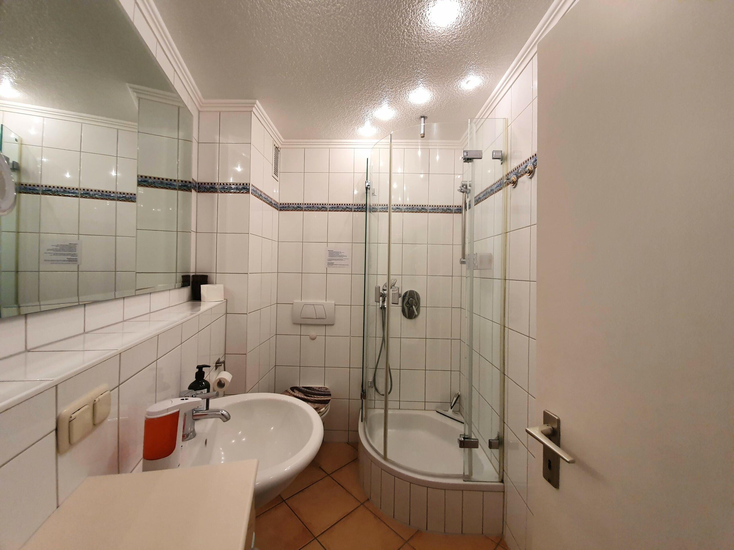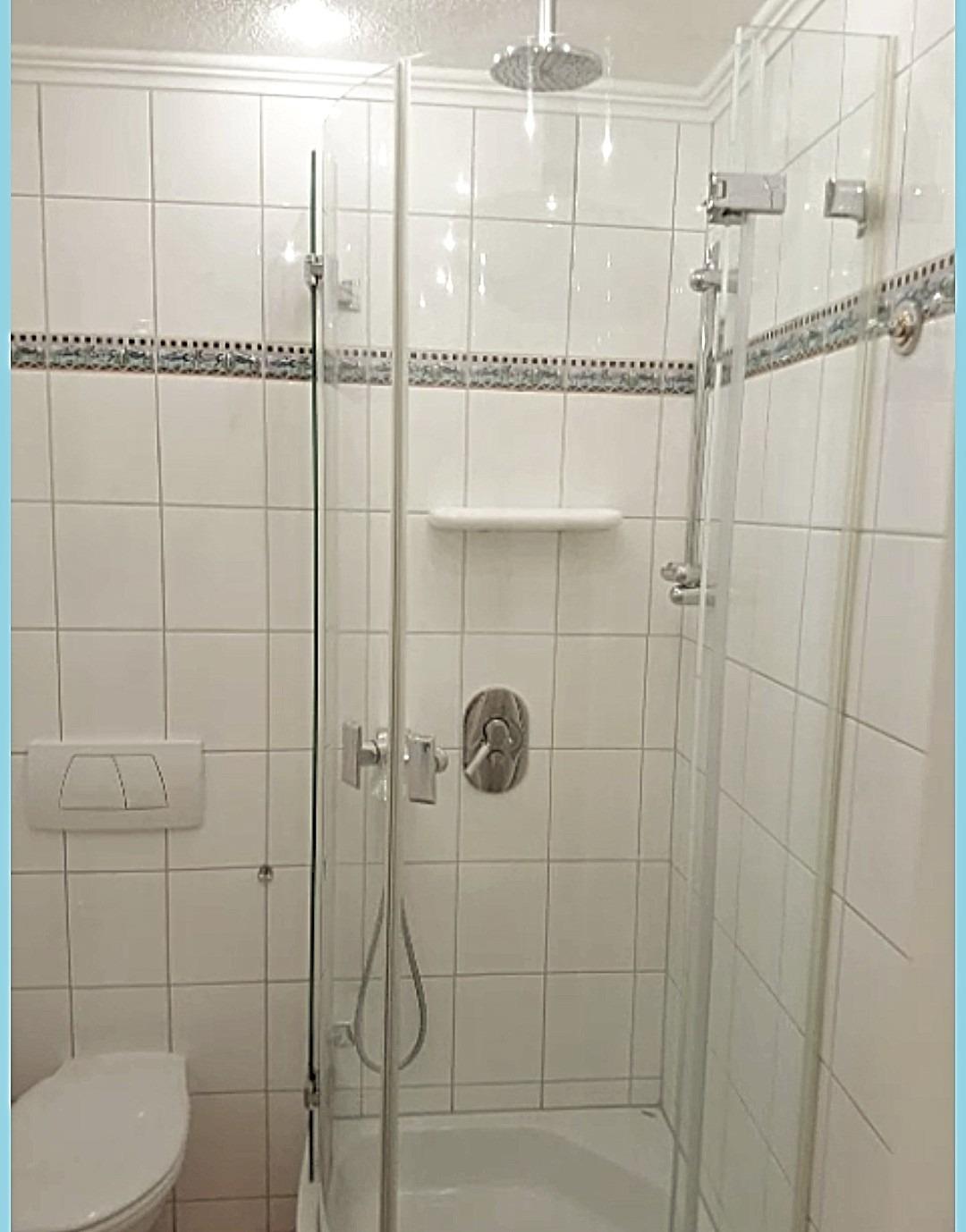 Badezimmer mit Dusche, WC, Fön, Lockenstab und separatem Kosmetikspiegel.