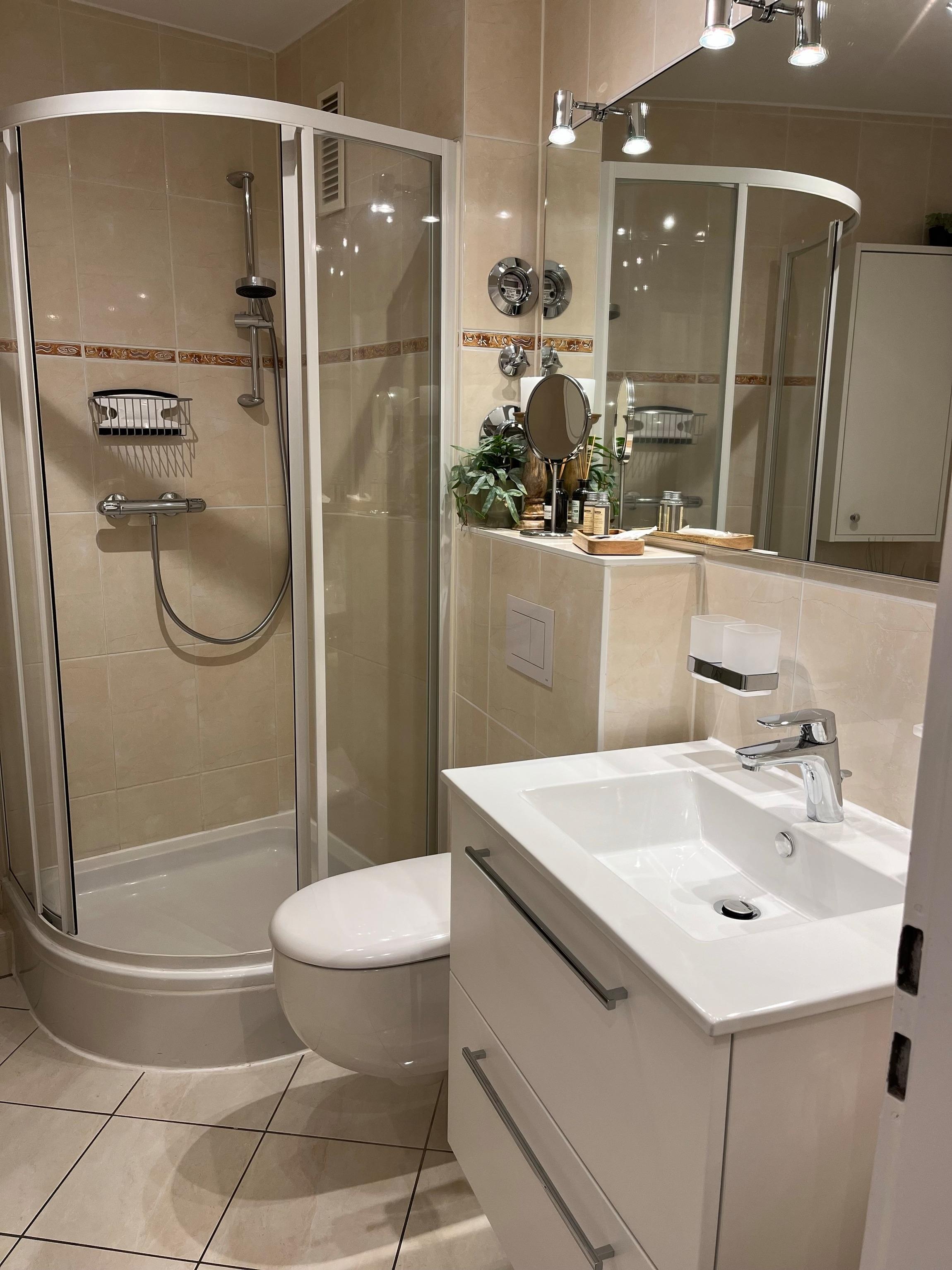 Das geräumige Bad bietet Ihnen viel Ablagefläche und Stauraum.