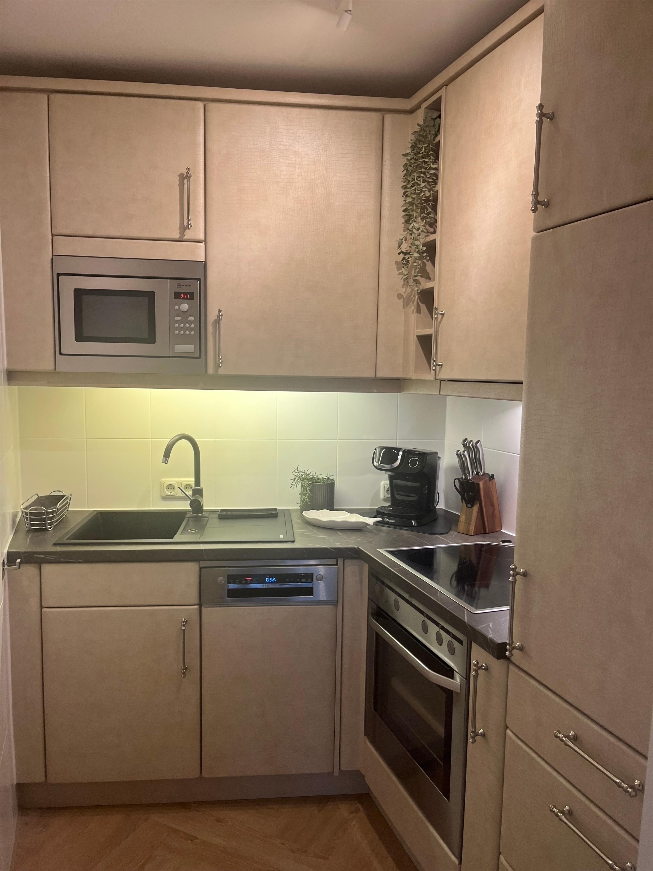 Die gut ausgestattete Küche verfügt über ein Cerankochfeld, einen Backofen, eine Mikrowelle, einen Geschirrspüler, einen Toaster, einen Wasserkocher, eine Kaffeemaschine und eine Kapselmaschine (Tassimo).