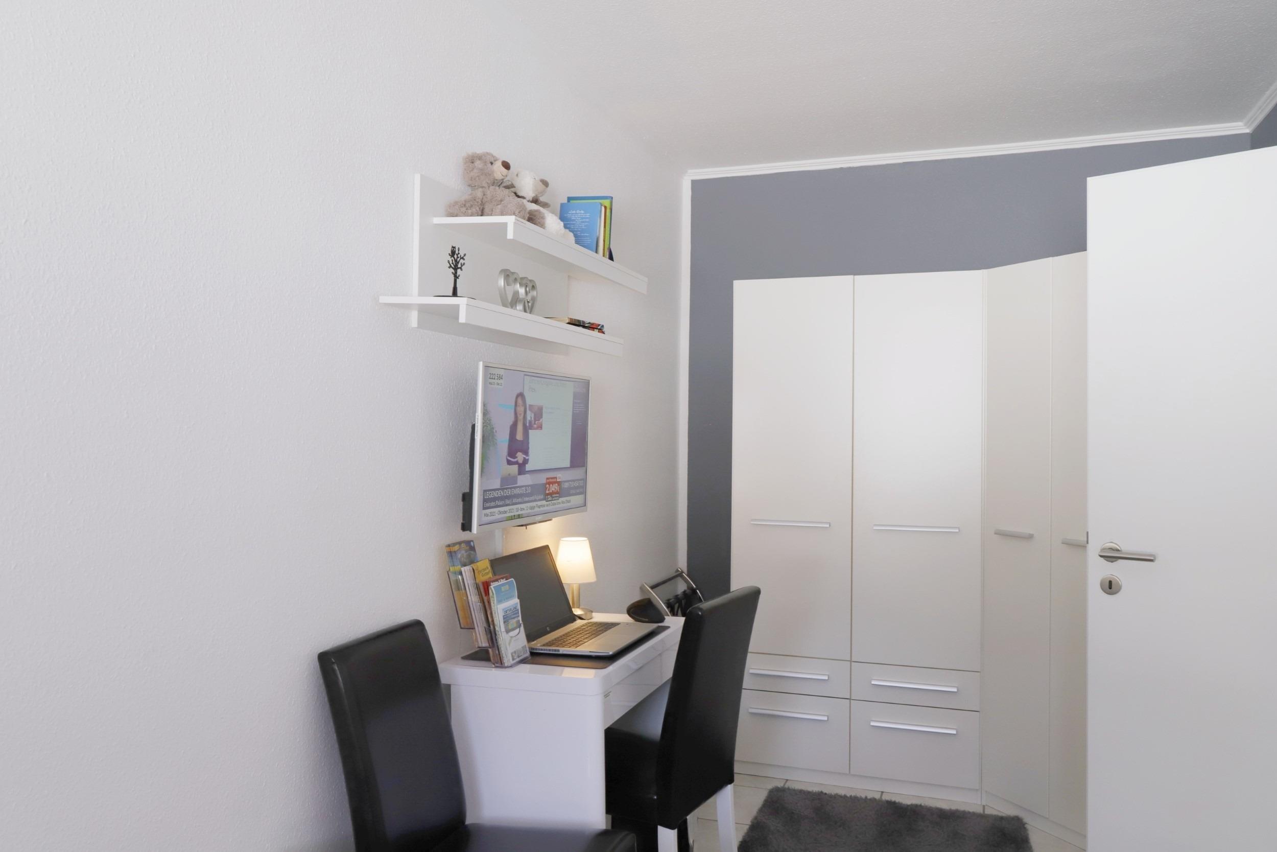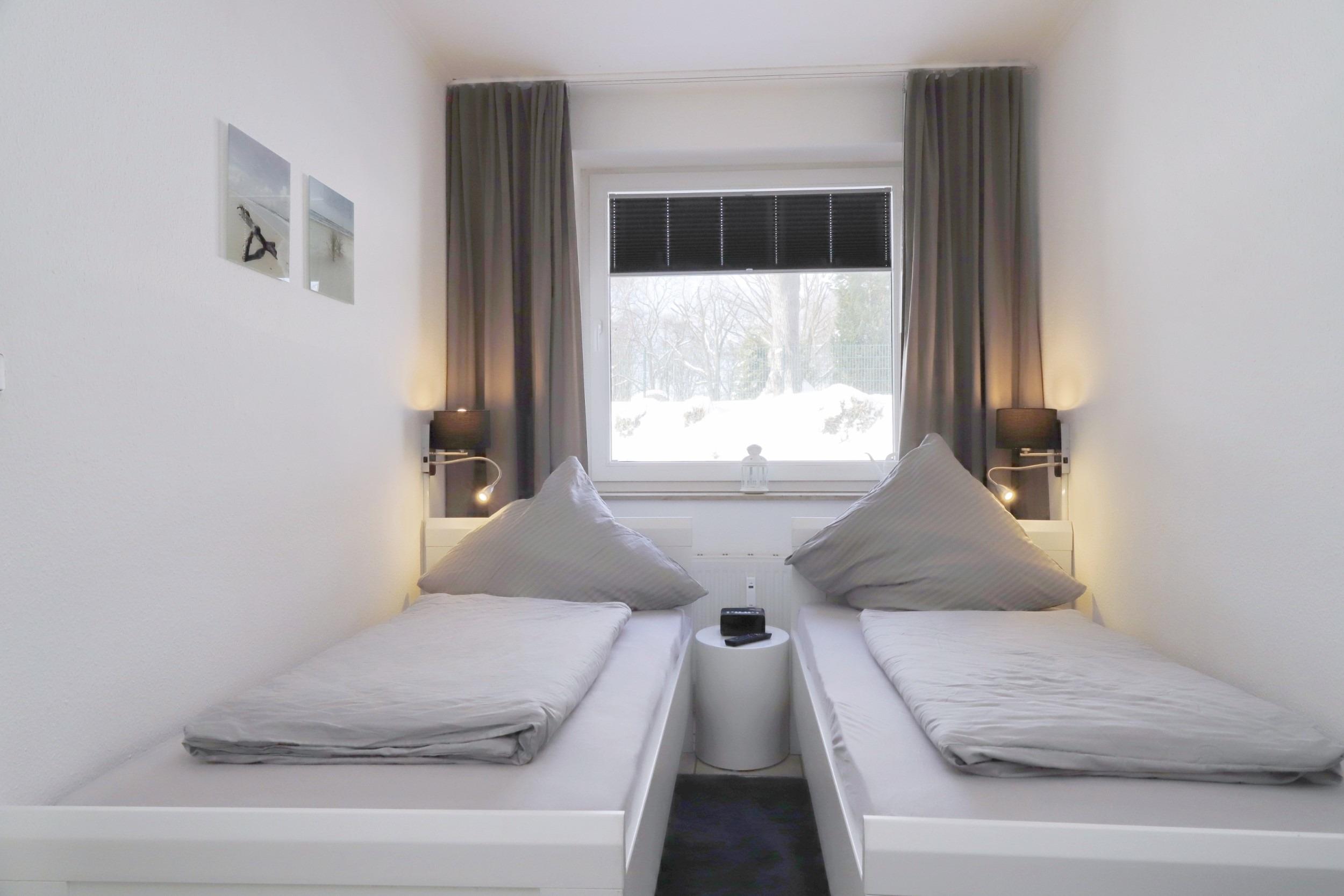Das separate Schlafzimmer grenzt an den Wohnbereich an und bietet neben zwei Einzelbetten (90x200cm) einen großen Kleiderschrank mit Safe, einen weiteren Fernseher und einen Schreibtisch mit Stuhl.