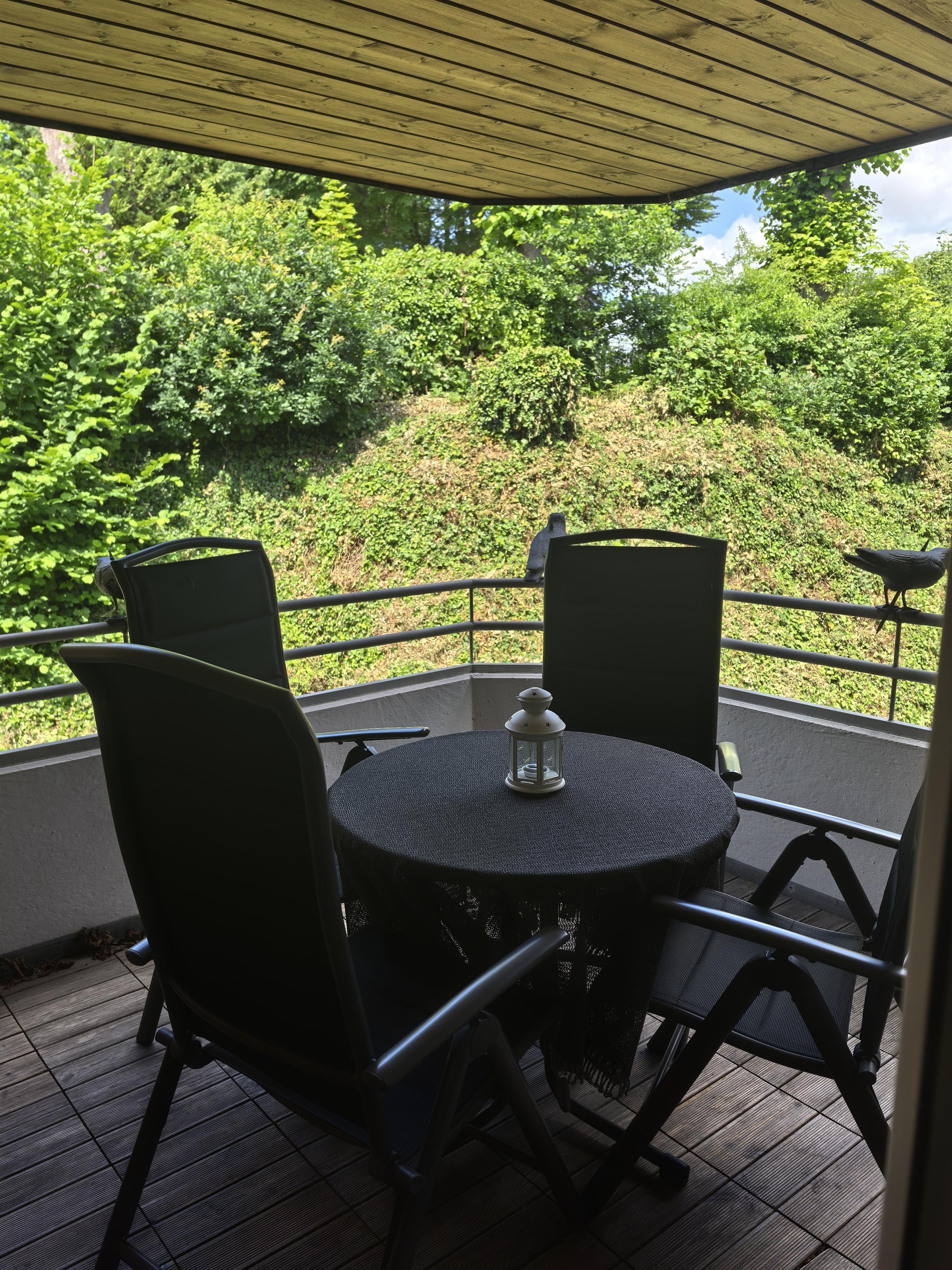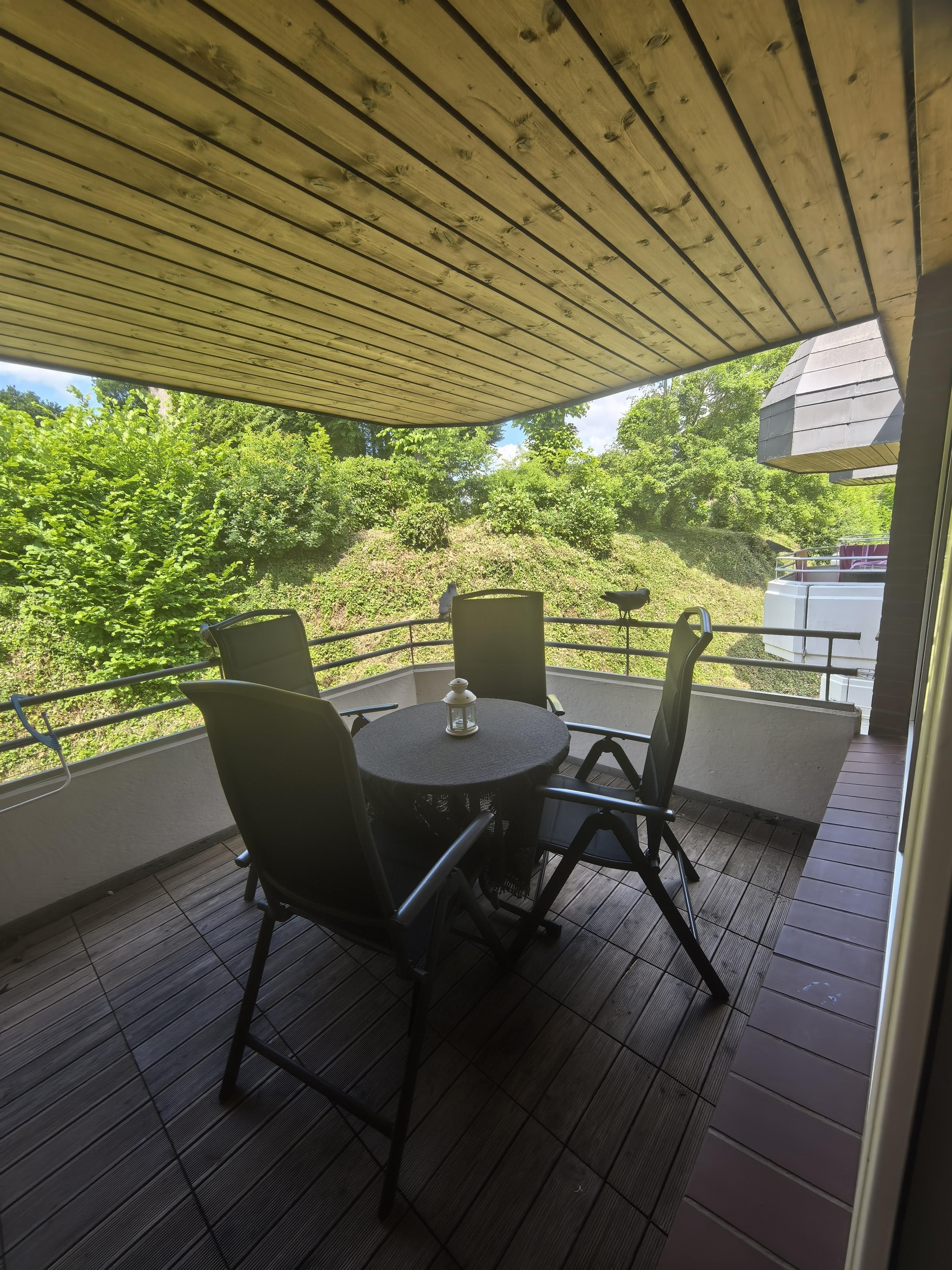 Der große möbelierte und überdachte Balkon, mit Ausrichtung nach Westen und zum Kurpark, lädt zum entspannen ein und bietet Ihnen Ruhe vom Alltag.